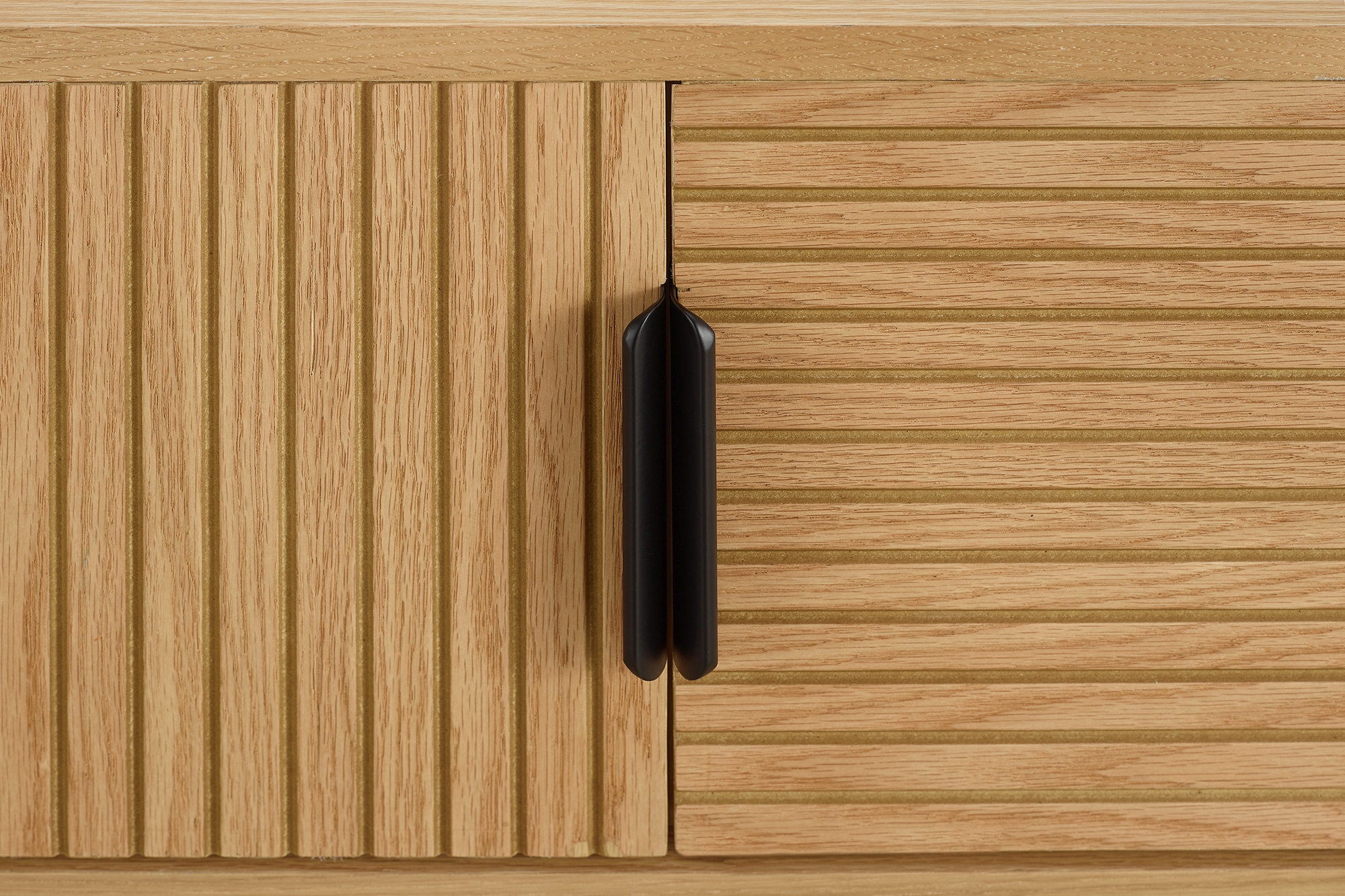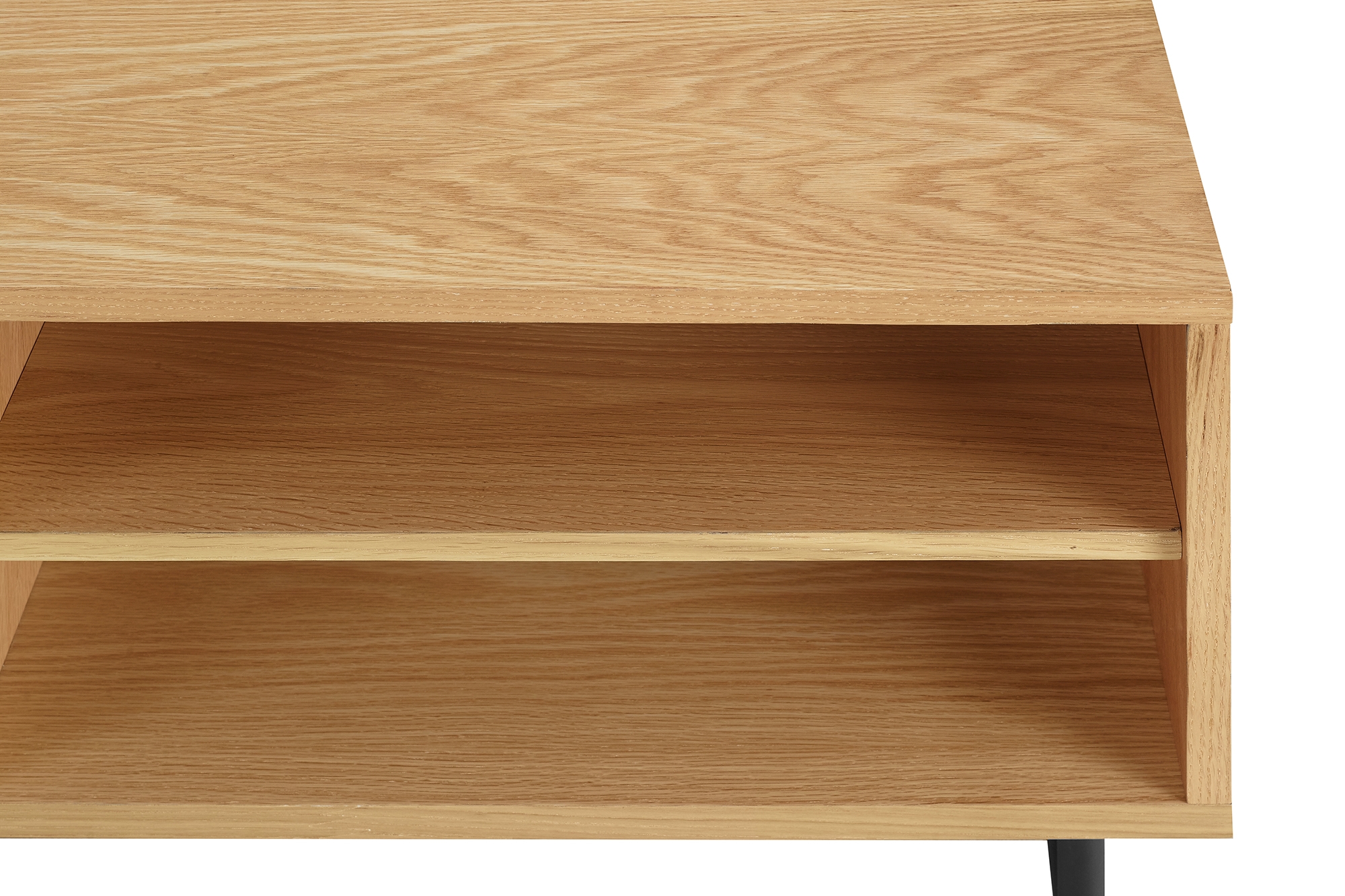 Le placage chêne clair et les pieds hauts laqués ton noir créent un contraste moderne et font entrer le style scandinave ultra tendance dans votre intérieur. Un vernis polyuréthane résistant aux rayures est appliqué sur le caisson du meuble : ceci le rend particulièrement résistant et robuste pour pouvoir en profiter longtemps. La structure avec des pieds fins confère au banc TV un aspect léger et aérien et un look tendance digne d’un loft. Le placage en chêne apporte un charme supplémentaire à l’ensemble. Les deux casiers ouverts de ce banc TV permettent de positionner l’équipement Hi-Fi tandis que les 2 portes offrent un espace de rangement supplémentaire.