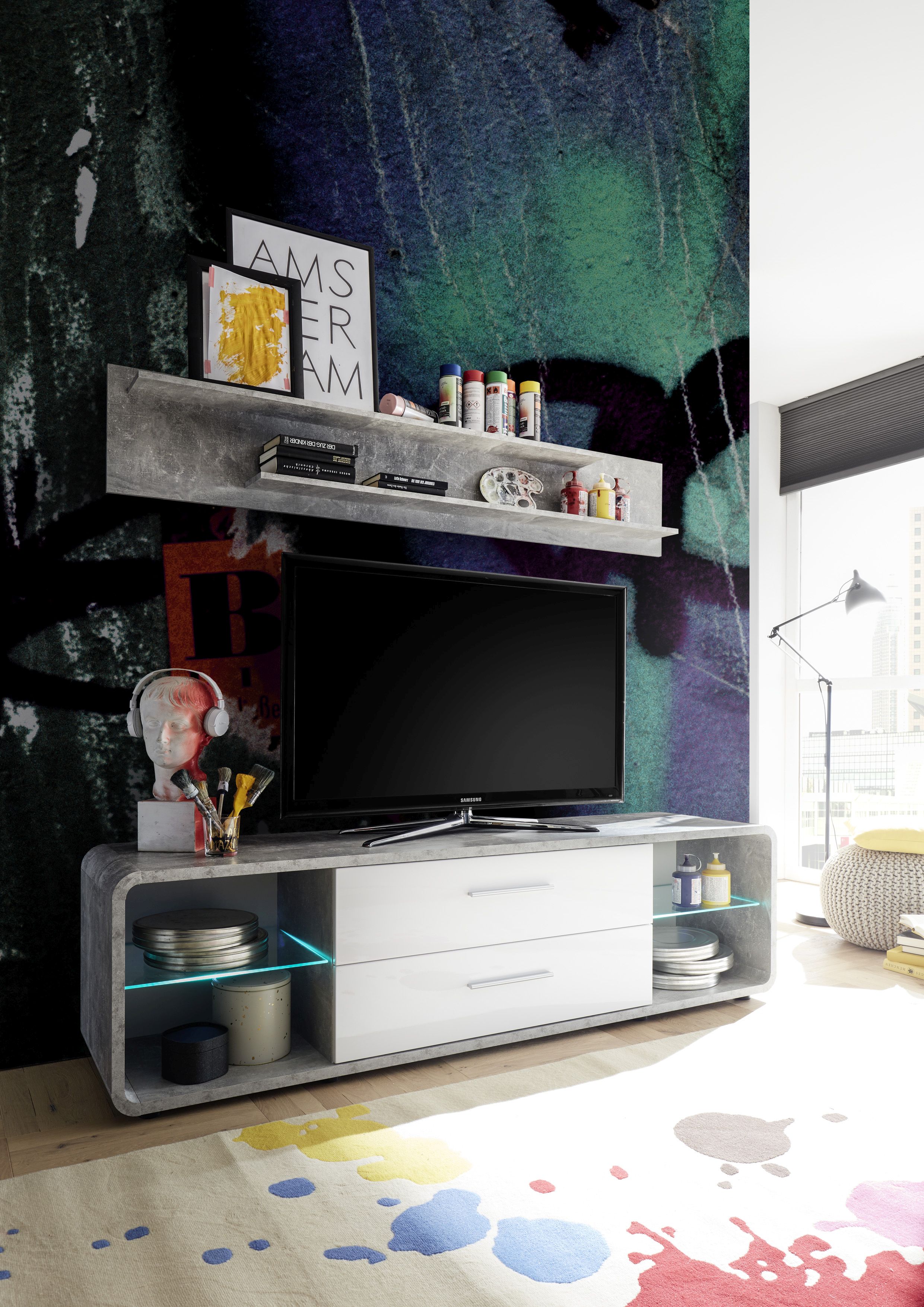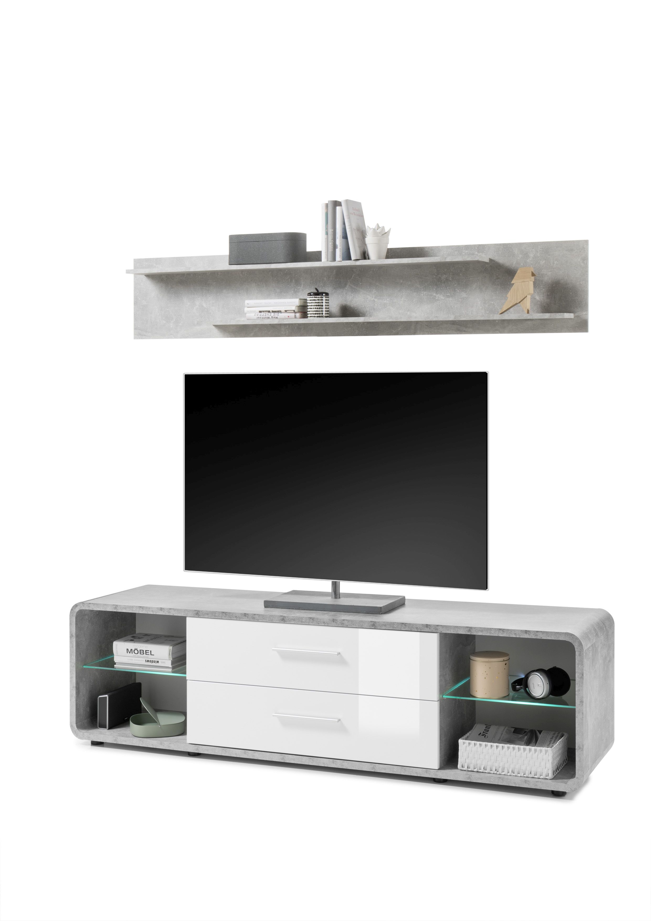 1 banc TV avec 2 tiroirs et 4 casiers ouverts, éclairage inclus