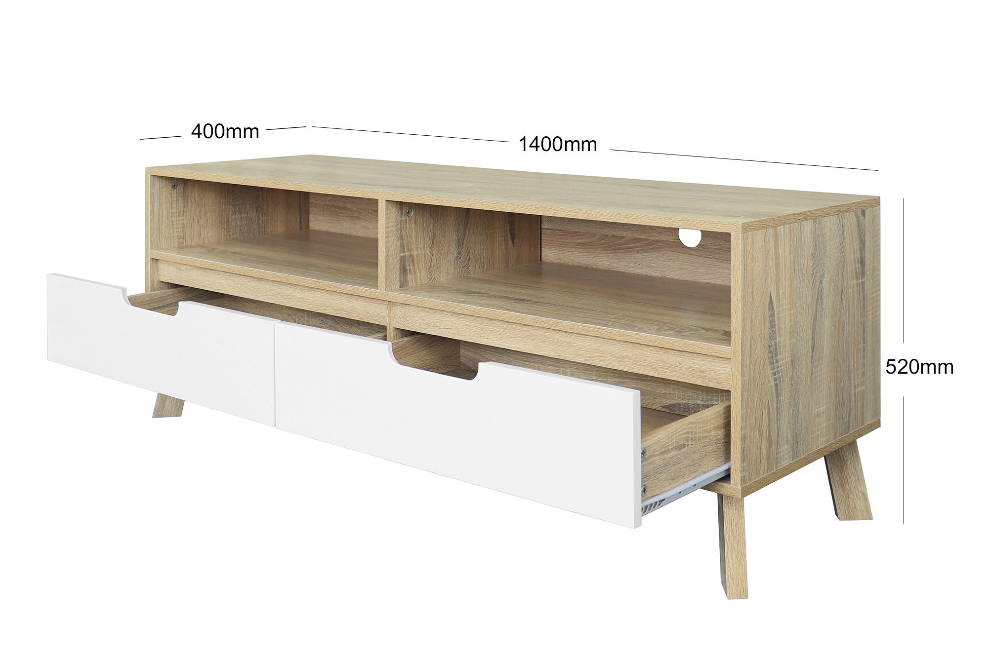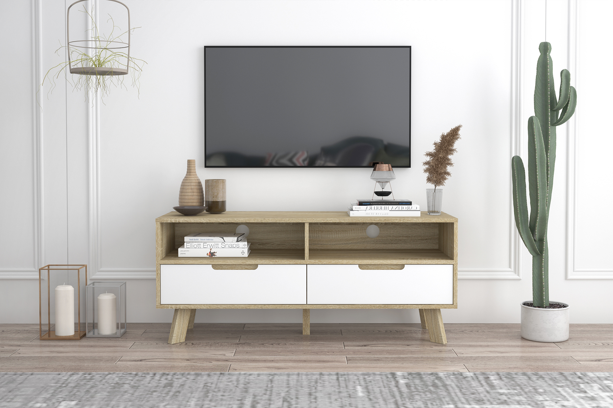 Ce banc TV intemporel dans un look scandinave ultra chic va vous séduire. Dans deux tiroirs se trouve un bel espace de rangement pour divers objets. Vos appareils hi-fi ou consoles de jeux peuvent être rangées dans les 2 casiers ouverts puisqu'ils disposent chacun d'un passe- câbles. La combinaison de couleurs ton naturel et ton blanc se combine à merveille avec différents styles grâce à sa neutralité. Le banc TV enrichira votre salon aussi bien visuellement que sur le plan pratique.