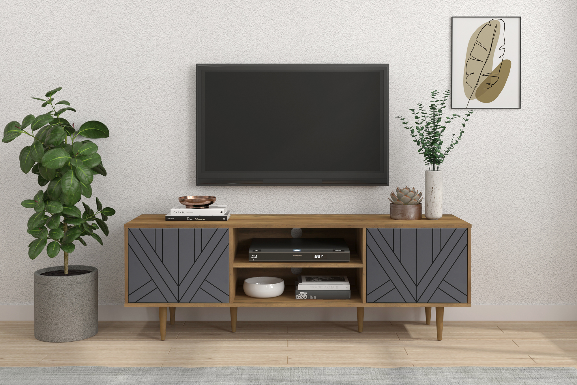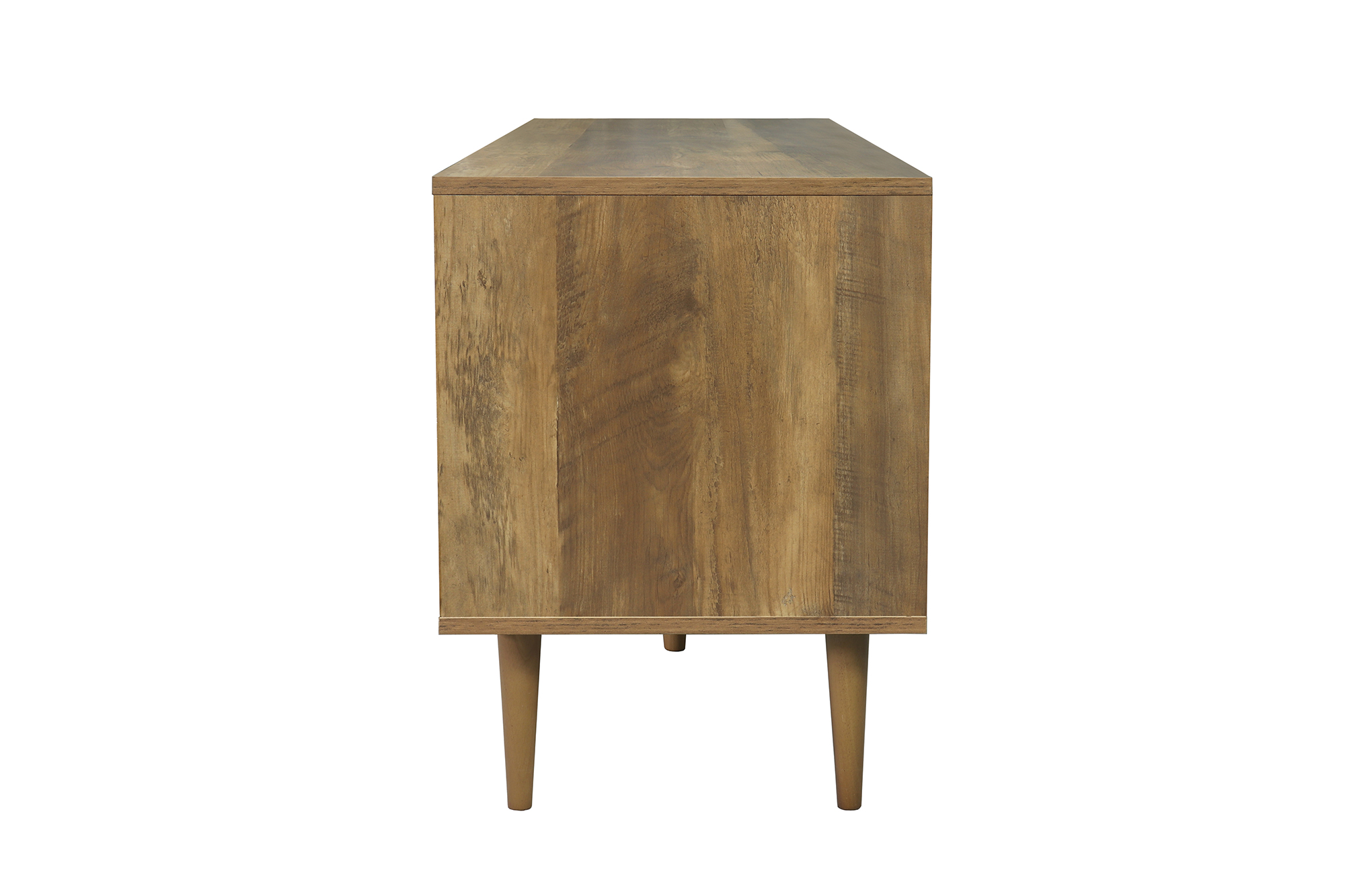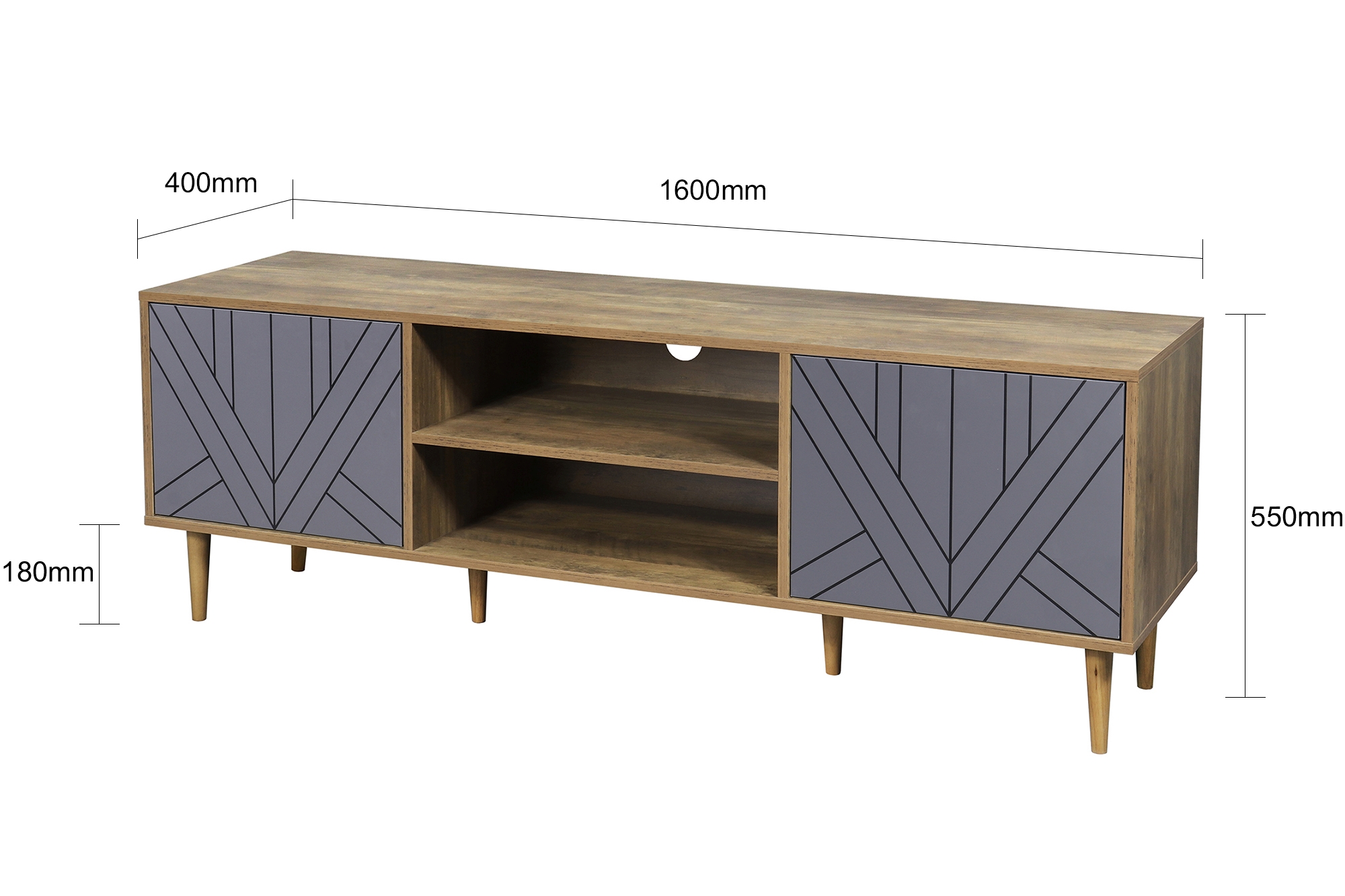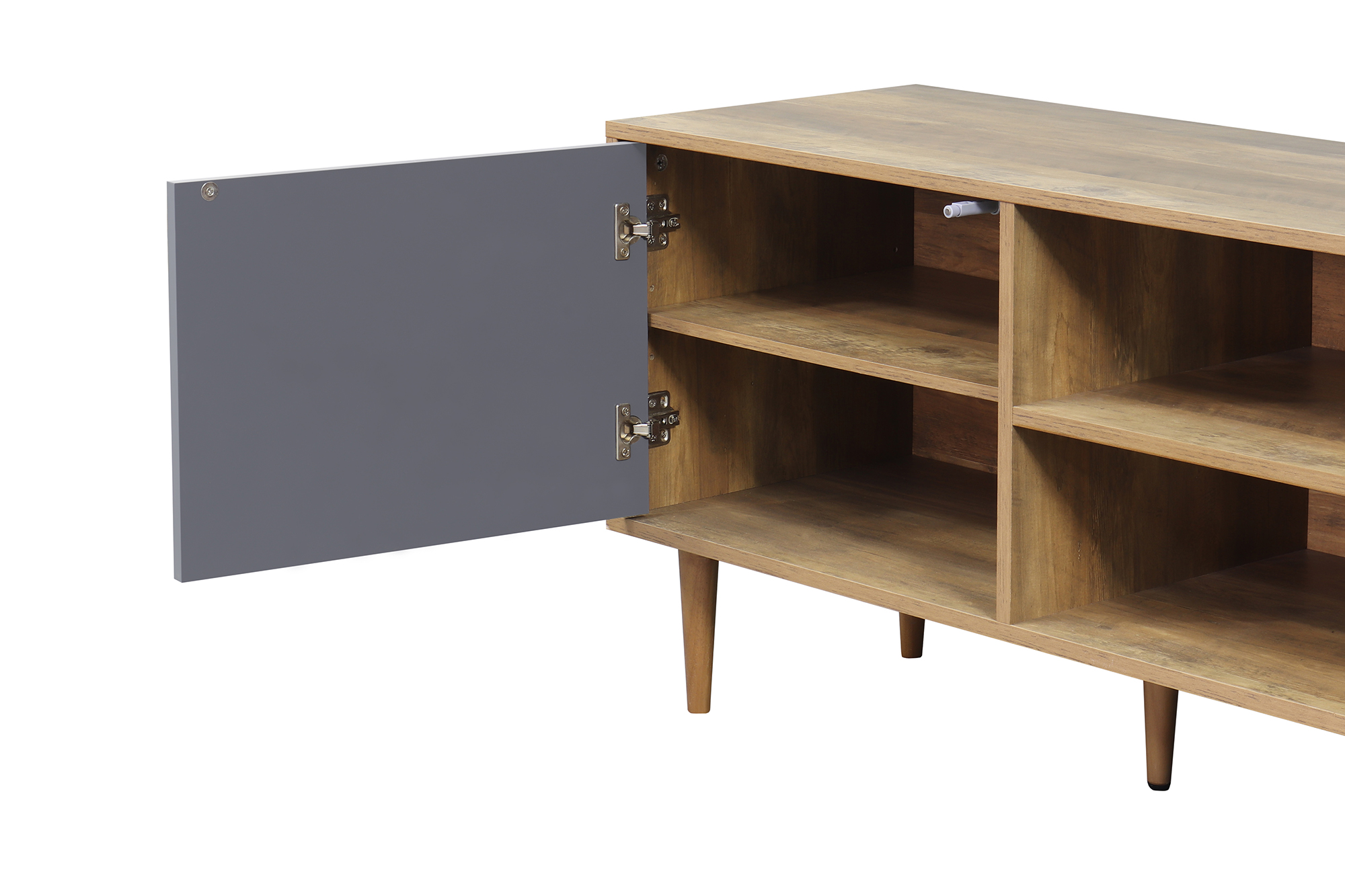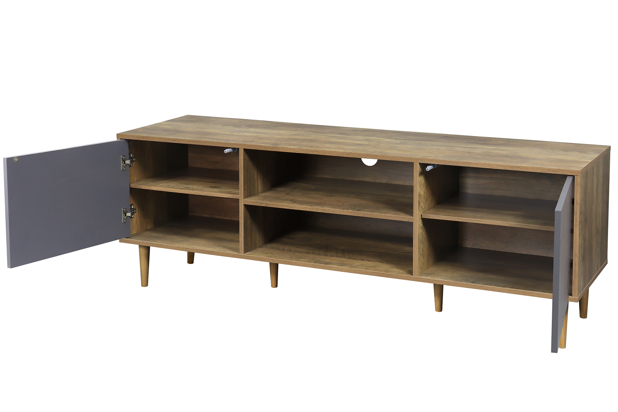 Le banc TV indémodable dans un ton naturel avec deux portes ton gris neutre avec motifs géométriques noirs offre un bel espace pour poser le téléviseur jusqu'à une taille de 70 pouces. L'équipement hi-fi trouvera sa place dans les deux casiers ouverts avec passe-câbles. Les télécommandes, les câbles et les petites affaires pourront être rangés sans problème derrière les deux portes ; derrière chacune d'elles se trouve une tablette réglable en hauteur. La fonction avec ouverture par simple pression ("push to open") permet d'ouvrir facilement les portes. Ce banc TV sera toujours aussi tendance demain ; il peut être combiné facilement avec l'ameublement déjà existant. Les pieds sont suffisamment hauts pour permettre à un robot aspirateur de se glisser dessous. Vous le voyez bien : en choisissant ce banc TV, vous prenez la bonne décision.