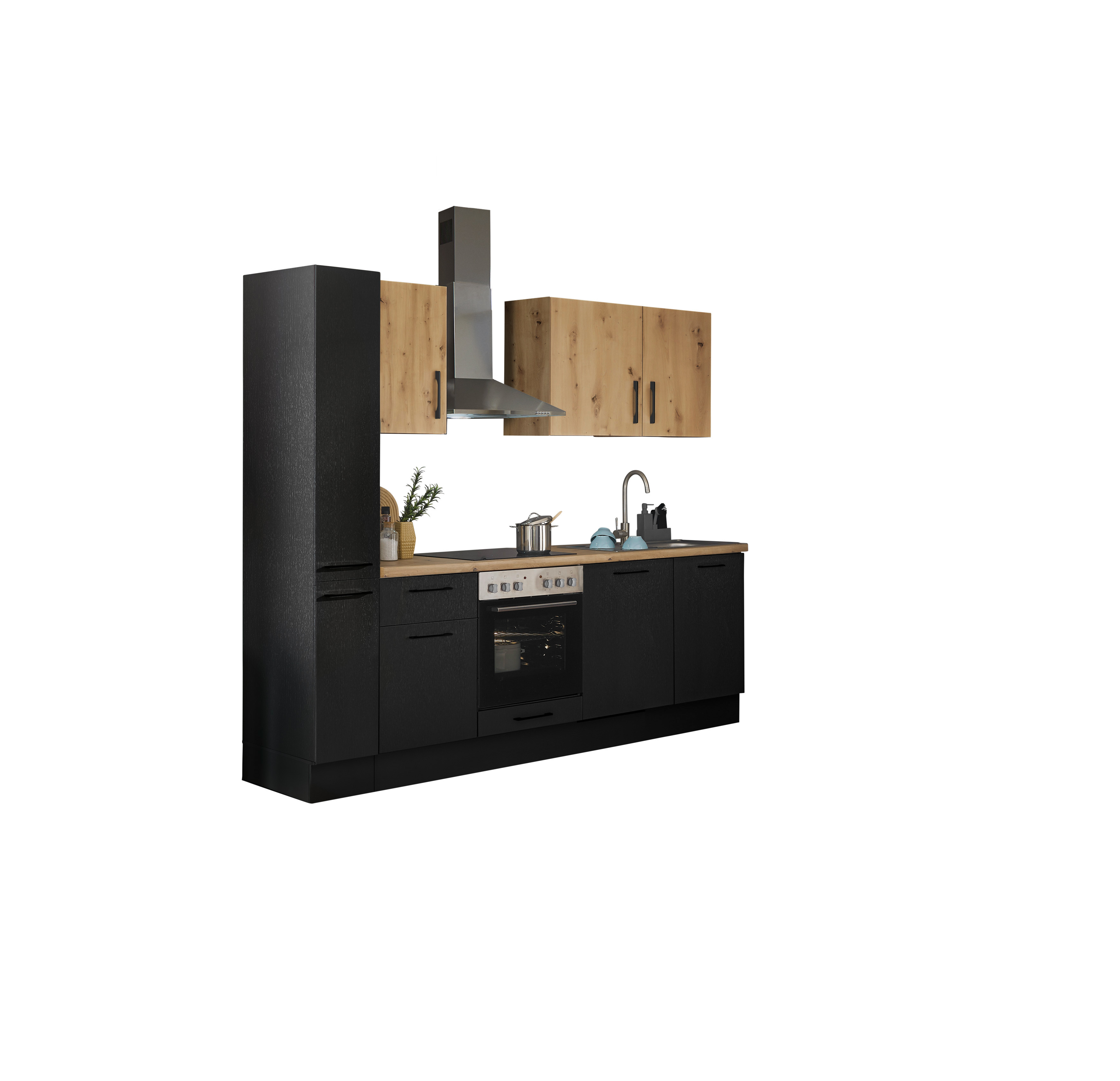 Façade et caisson : imprimé bois (woodprint) ton noir et panneau de particules surfacé mélaminé (PPSM) décor chêne Artisan