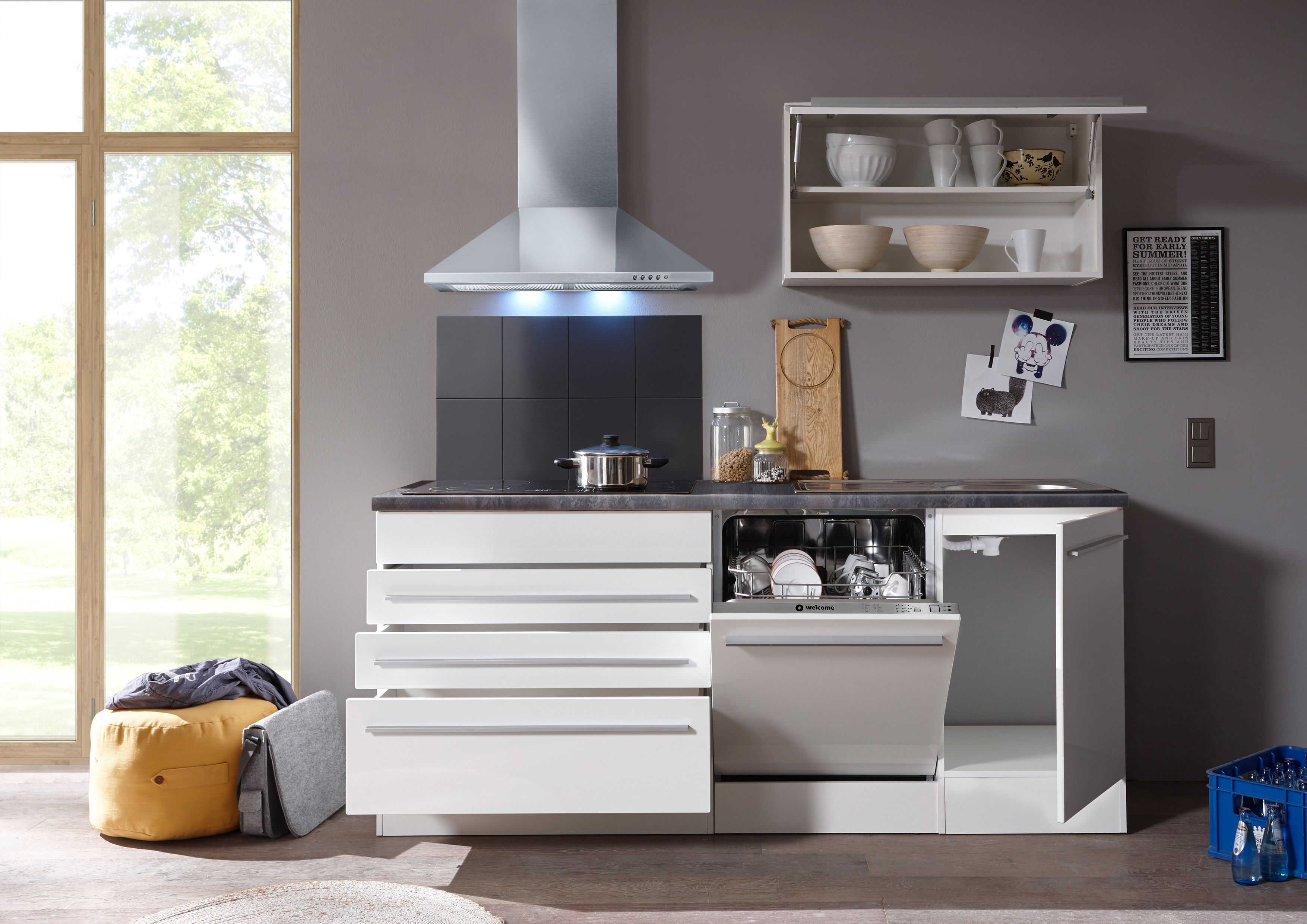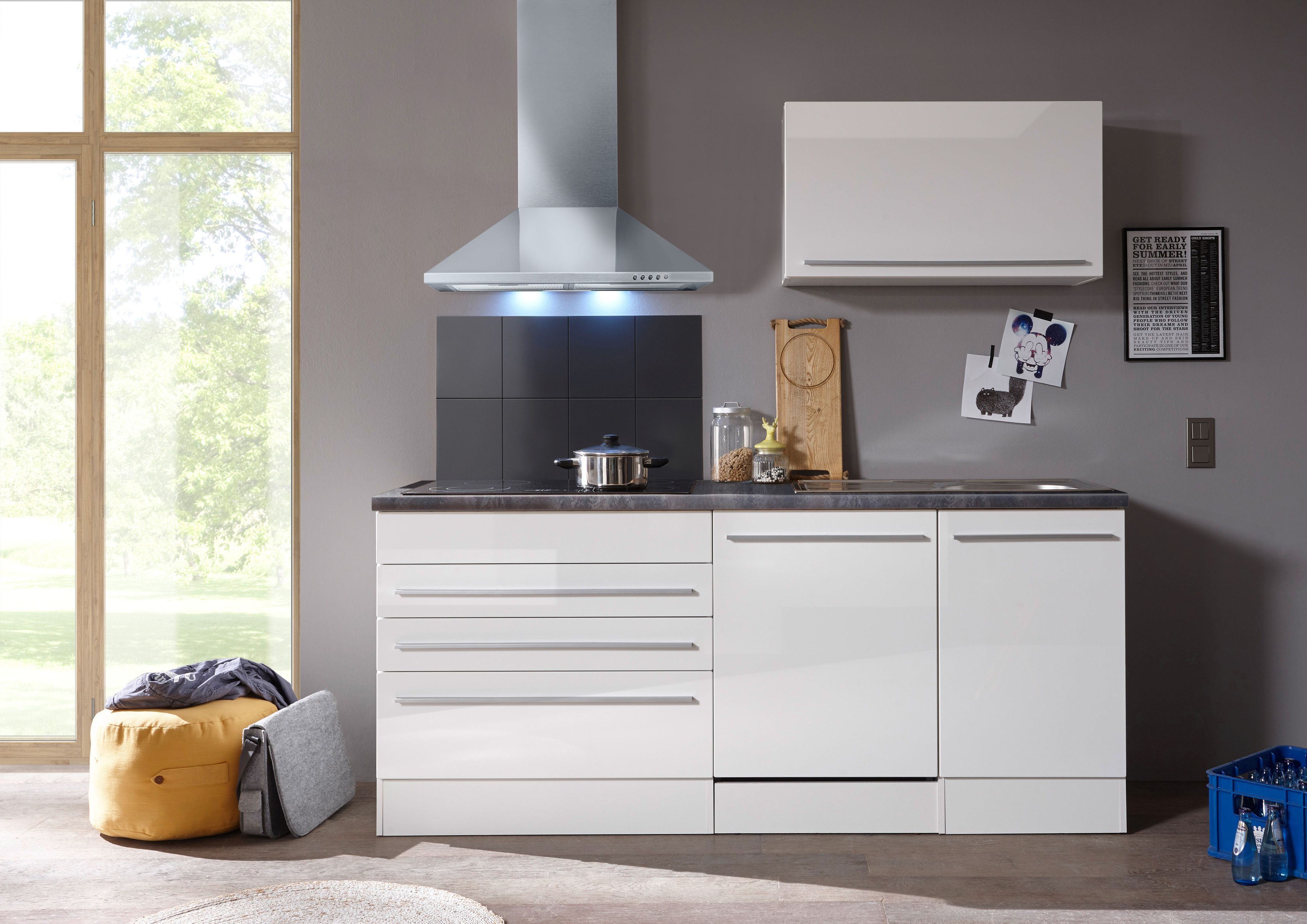 Sans décoration / robinetterie / évier / four / plaque de cuisson / lave-vaisselle / hotte aspirante / réfrigérateur