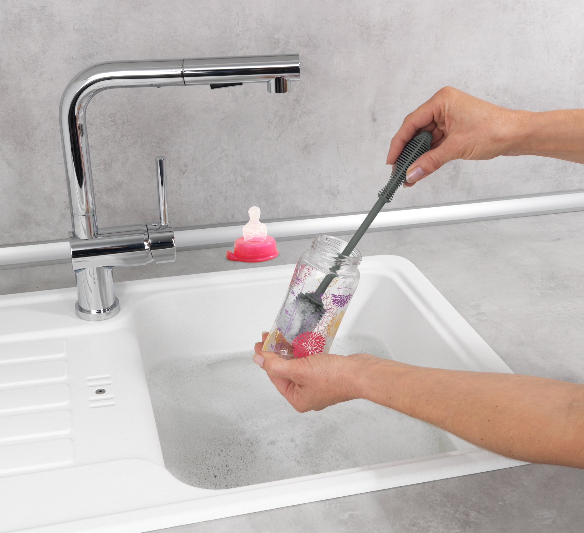 La brosse à vaisselle parfaite Sia met fin aux traces disgracieuses. Cette brosse grise pratique en silicone de qualité nettoie la vaisselle en profondeur sans rayures et lutte efficacement contre la saleté. Grâce à sa petite tête façon goupillon, la brosse est particulièrement adaptée au lavage des verres et des tasses. Même les endroits difficiles à atteindre, par exemple dans les vases étroits, sont nettoyés en profondeur grâce aux picots de cette brosse.