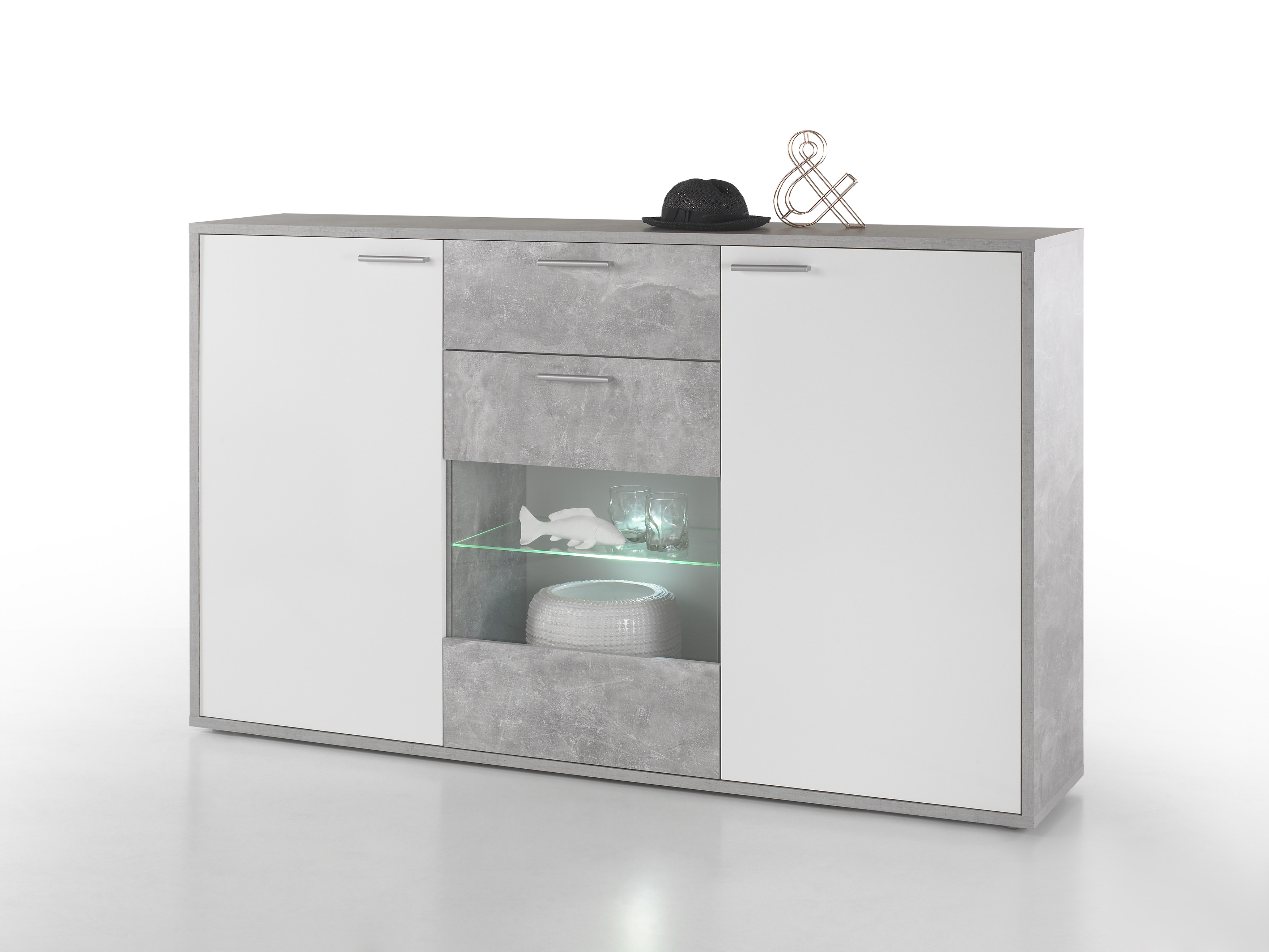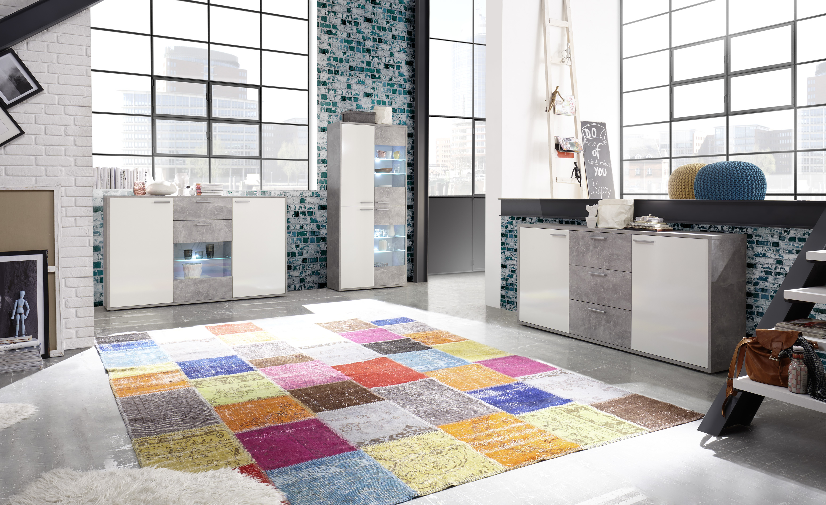 Ce buffet haut moderne combine un aspect béton urbain et un look brillant élégant. Le corps et les contrastes décoratifs aspect béton apportent une touche tendance, tandis que la façade blanc brillant confère un aspect clair et raffiné. Les poignées tiges argentées complètent le design et confèrent au buffet haut une touche élégante et moderne. Avec son espace de rangement généreux derrière les portes et les tiroirs, il est idéal pour ranger de manière ordonnée et décorative la vaisselle, les accessoires de décoration ou les objets du quotidien.