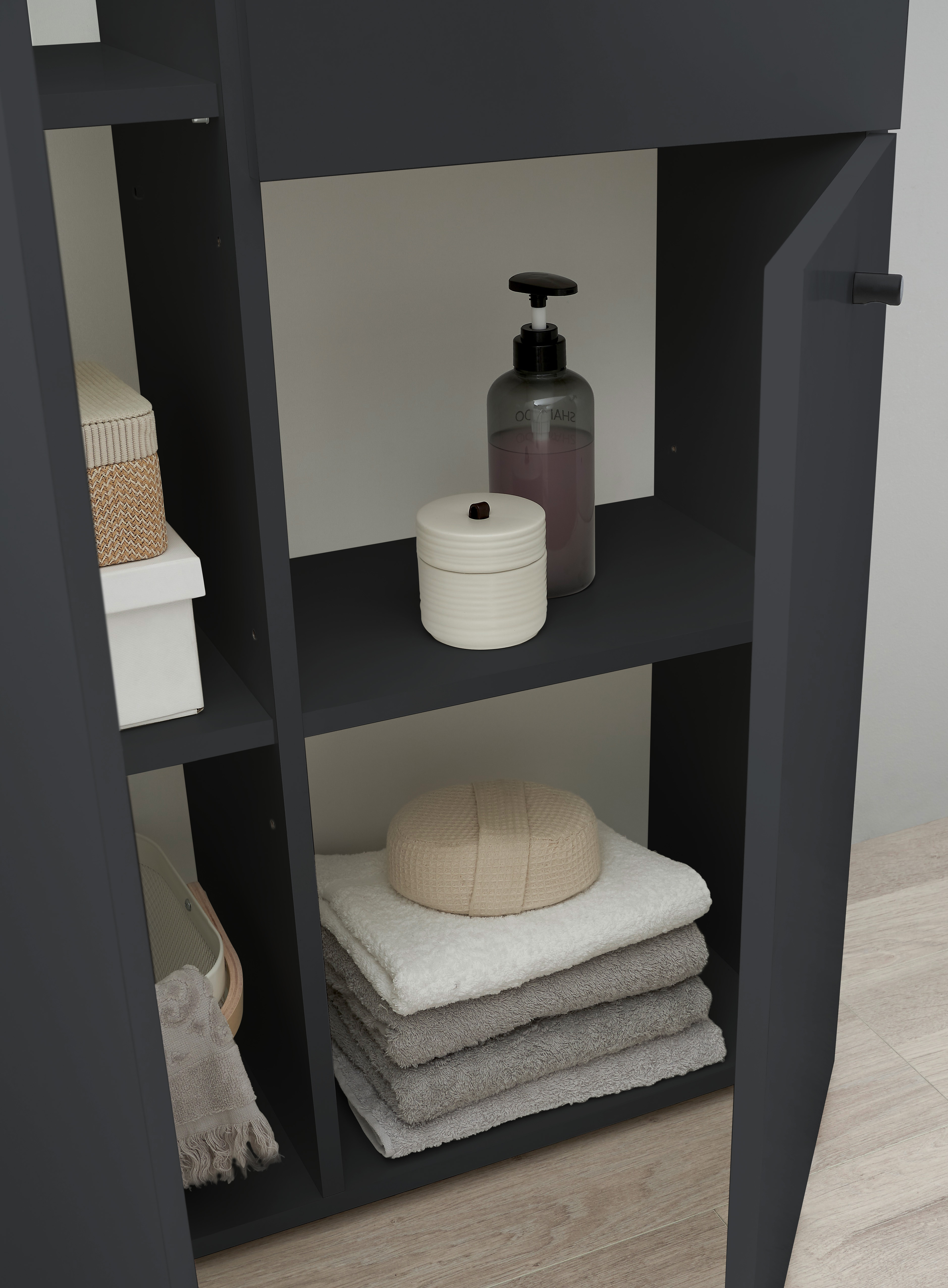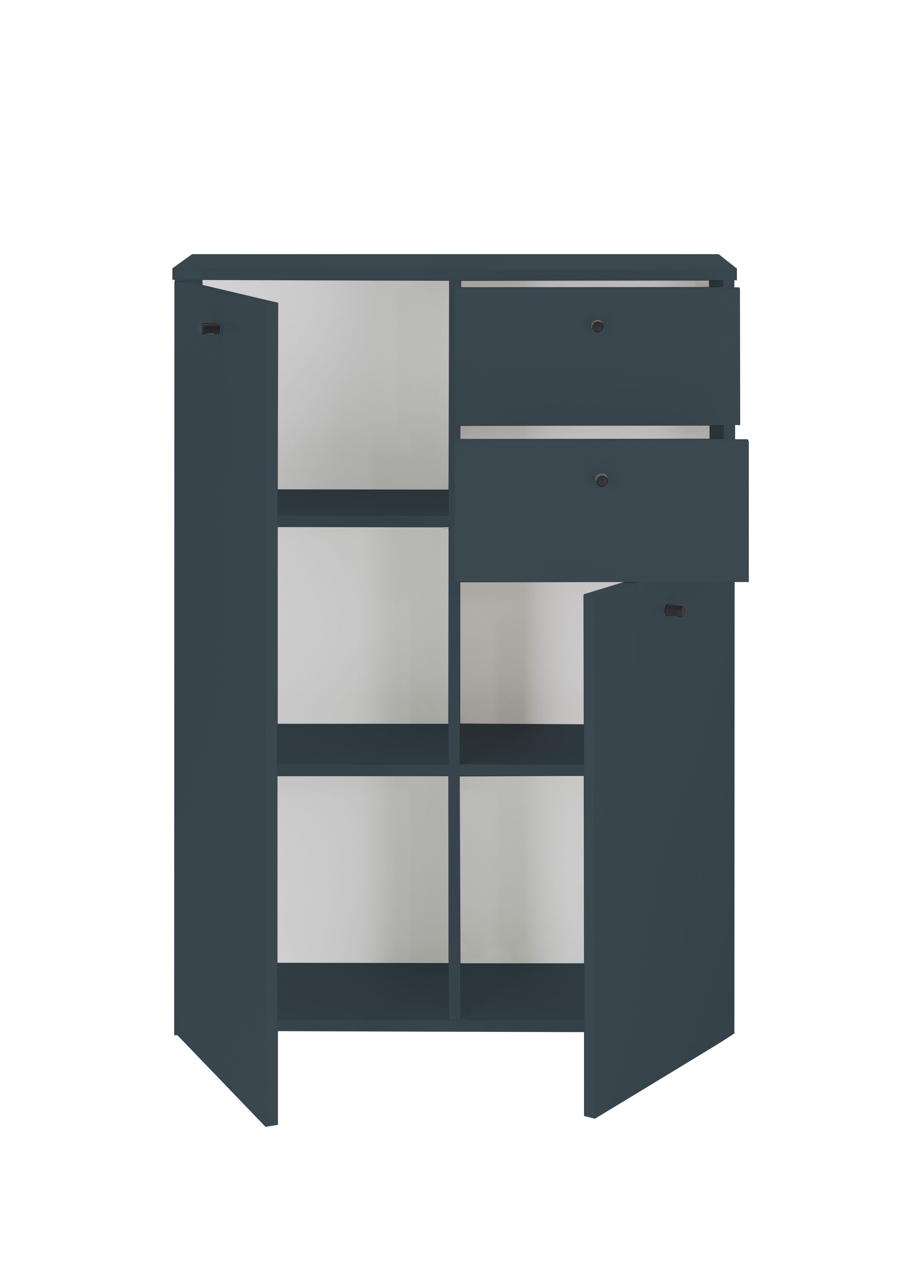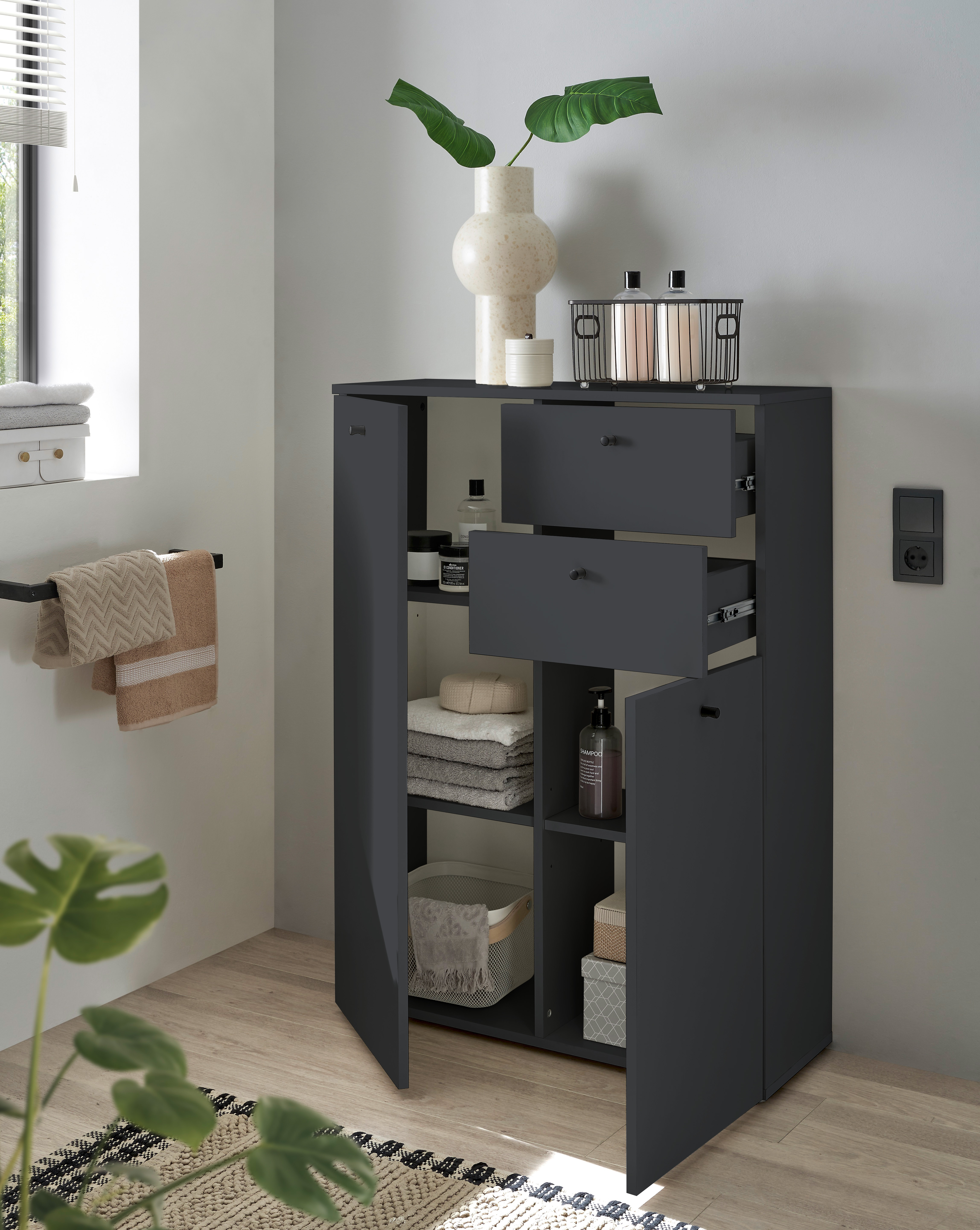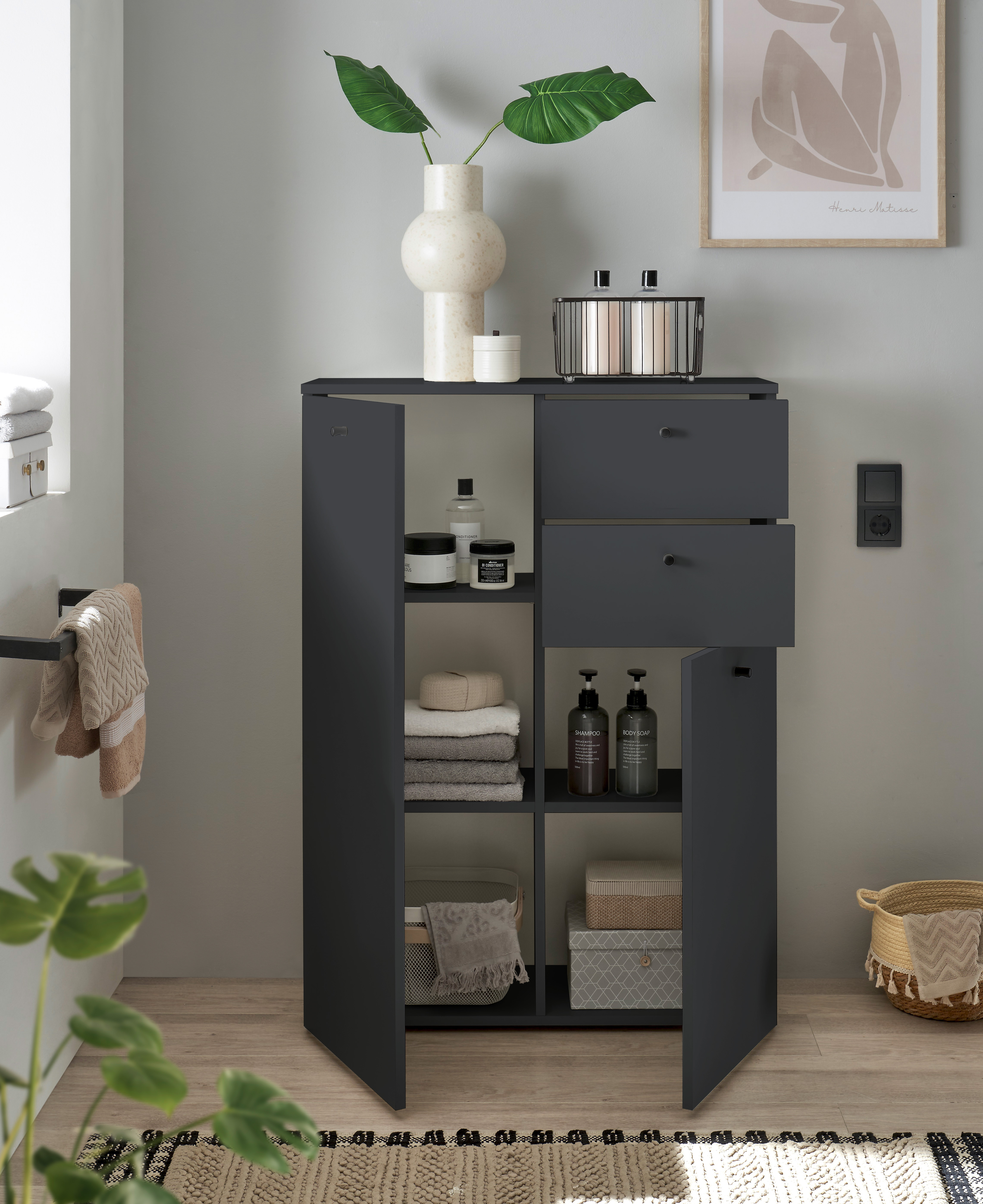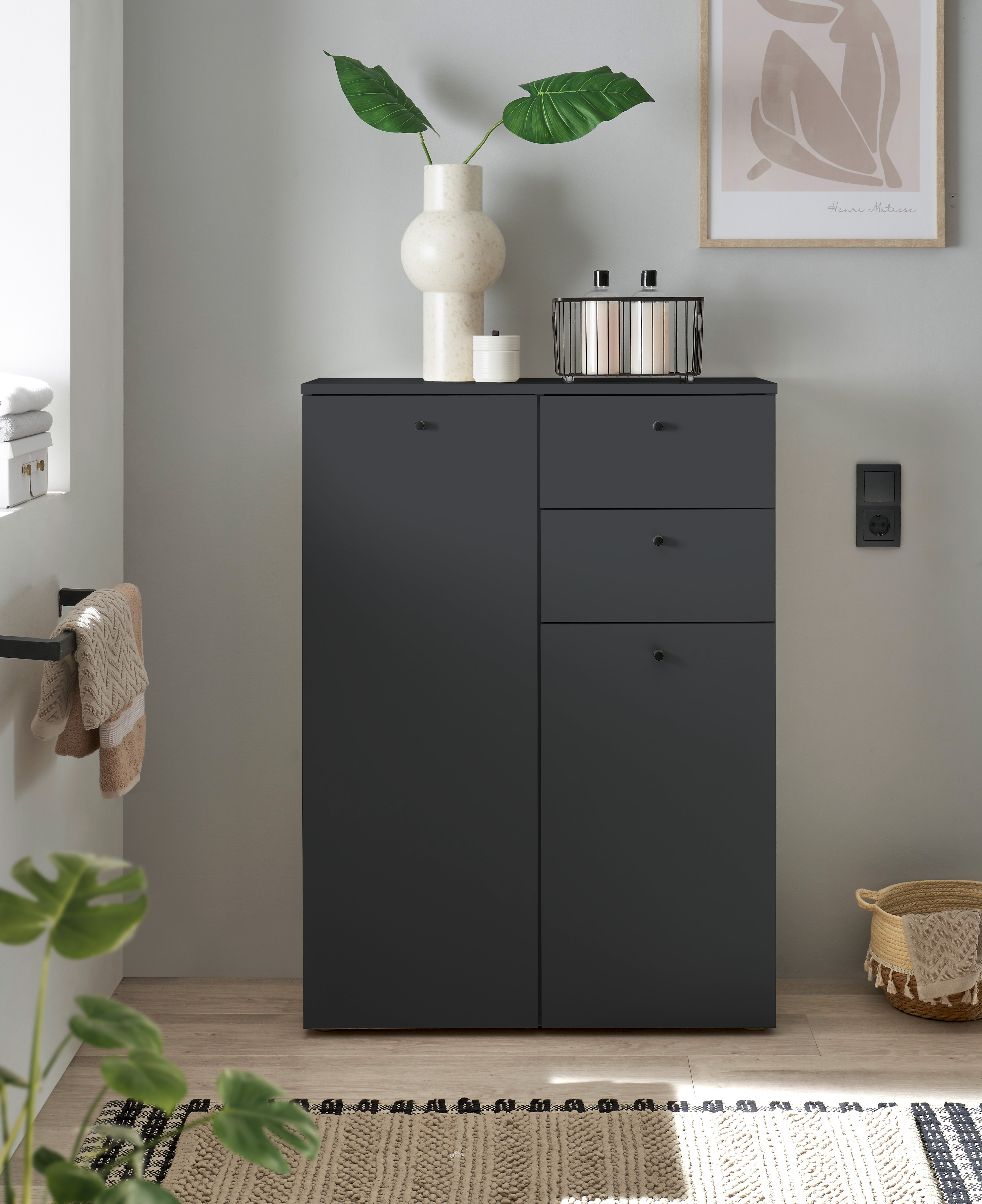 Ce buffet haut allie à la perfection style et fonctionnalité. Avec ses deux portes et ses deux tiroirs, il offre beaucoup d'espace de rangement pour les serviettes, les produits de soin et tout ce qui doit être rangé dans la salle de bains. Ses lignes épurées et son design moderne s'intègrent harmonieusement dans toutes les salles de bains, tandis que ses matériaux de haute qualité garantissent stabilité et durabilité. Ainsi, ta salle de bains reste toujours bien rangée et élégante à la fois.