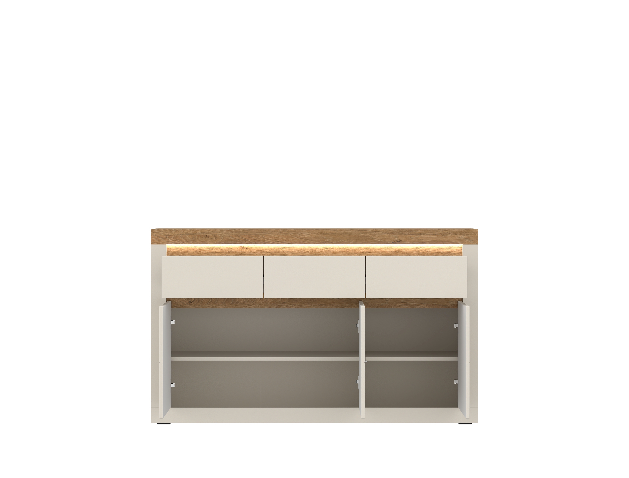 Ce buffet fonctionnel en cachemire avec des contrastes en imitation bois de chene Stone offre beaucoup d'espace de rangement et un look moderne pour le salon ou la salle a manger. Trois portes avec fonction de fermeture douce et trois tiroirs a extension totale assurent une utilisation confortable et permettent un rangement structure. L'eclairage integre met en valeur le contenu et offre une meilleure visibilite. Des materiaux robustes tels que les panneaux de particules melamines, le MDF et les chants ABS garantissent une longue duree de vie au quotidien. Avec son design simple et ses equipements bien penses, ce buffet est la solution ideale pour les acheteurs soucieux de leur budget qui accordent de l'importance a la fonctionnalite et a la qualite - garantie MEGA incluse.