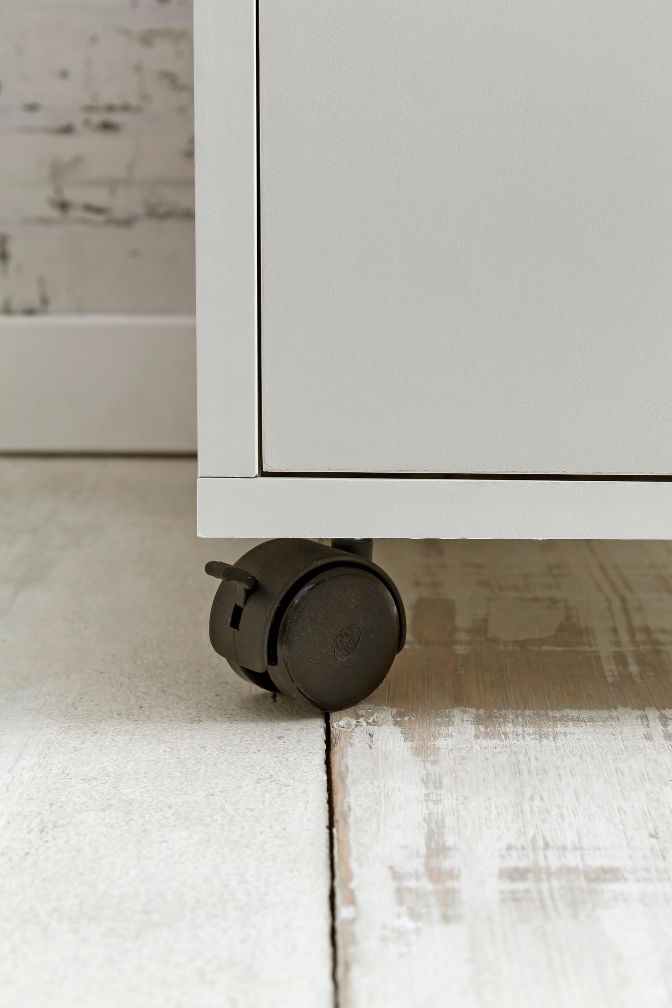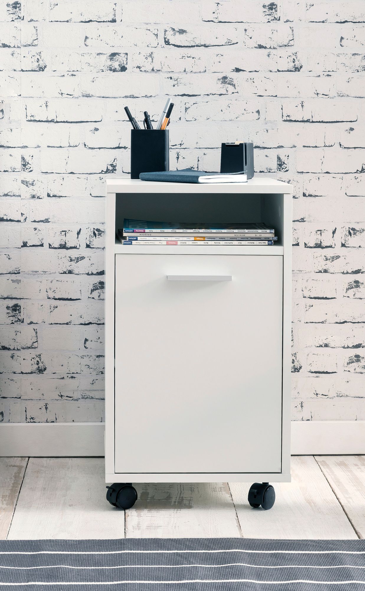 - ASSISTANCE DE BUREAU ✔ Stylos, perforatrice, agrafeuse, etc. sont omniprésents au bureau. Mais pour que ces outils indispensables ne traînent pas sur le bureau, cet élément de rangement à roulettes chic dispose de deux casiers derrière la porte et d'un casier ouvert spacieux et donc de suffisamment d’espace pour accueillir ces accessoires de bureau. Les blocs A4 tiennent également dans les casiers intérieurs et le casier extérieur. Tout est donc bien rangé !