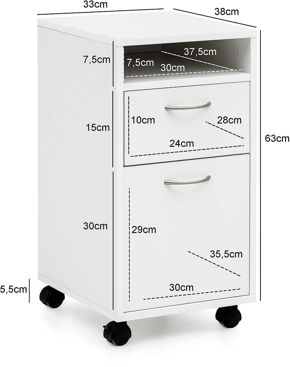 - Deux roulettes pour sols durs garantissent une excellente stabilité une fois le caisson de rangement positionné