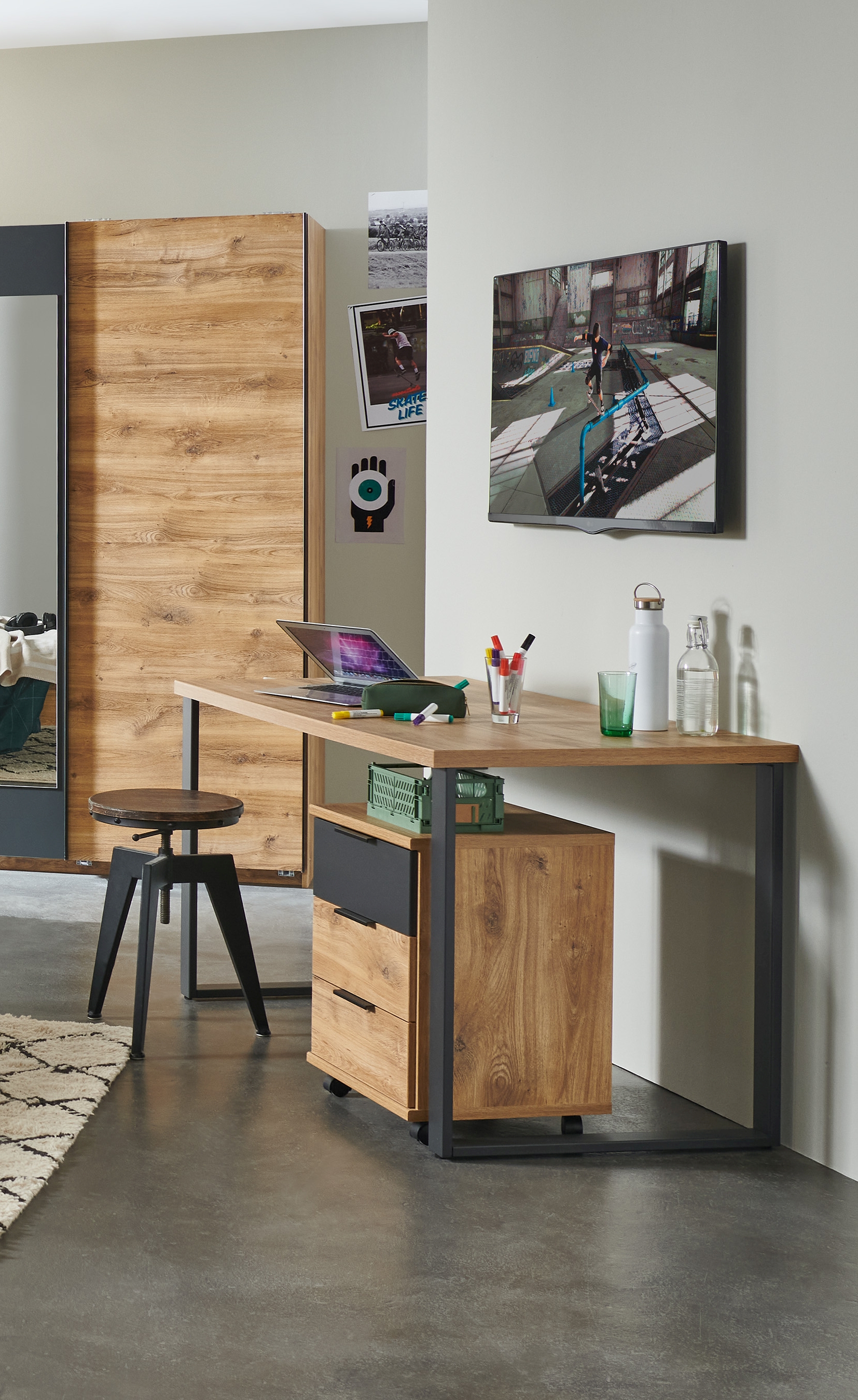 décor planches de chêne avec façade tiroir ton graphite