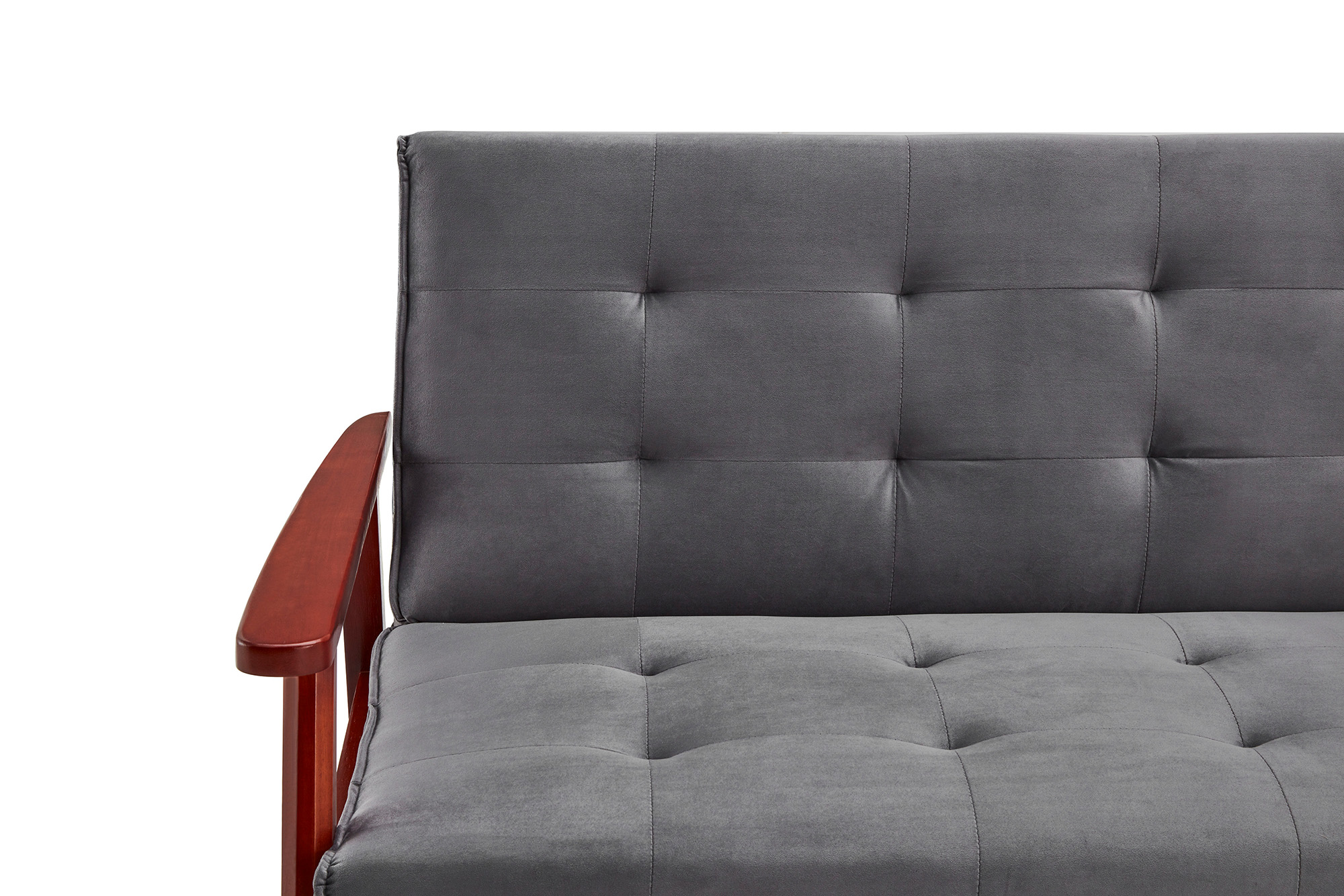 Le canapé convertible à accoudoirs de style scandinave arbore un revêtement élégant aspect velours et une structure robuste en bois massif d’eucalyptus. Ce modèle séduit particulièrement par ses 3 fonctions différentes permettant de s’asseoir, se relaxer et s’allonger. La fonction de rabattement du dossier à 60° permet de placer le canapé en position relax, tandis que la fonction à 180° permet d’utiliser la position allongée. Deux supports au niveau du dossier assurent une bonne stabilité lorsque le canapé est entièrement déplié. La structure en bois massif d’eucalyptus ton merisier garantit non seulement une bonne stabilité, mais offre également un superbe contraste avec le tissu velours. Grâce aux fonctions assise, relax et couchage, ainsi qu'aux accoudoirs, vous bénéficierez d’un niveau de détente optimal. Ce petit bijou en matière de design sera non seulement un élément phare dans votre intérieur, mais également votre nouvel espace de bien-être.
