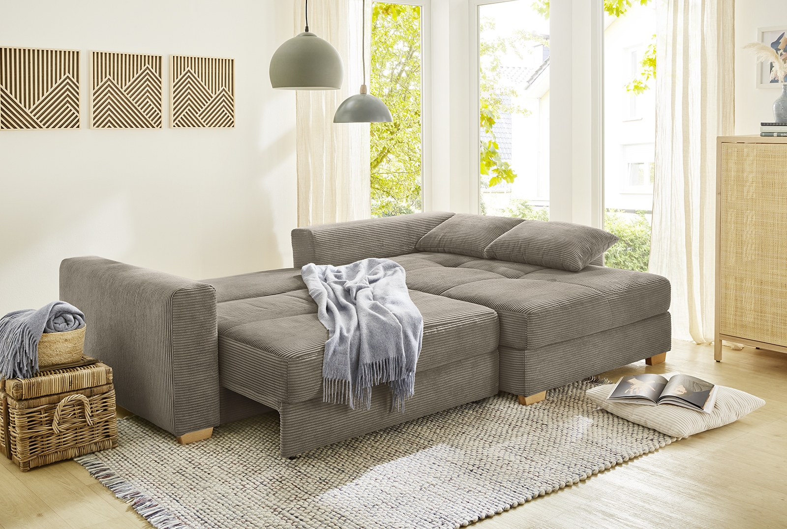 | Equipement canapés: | Dos habillé, Méridienne à droite ou à gauche, incl. coffre de lit, incl. coussins | ||