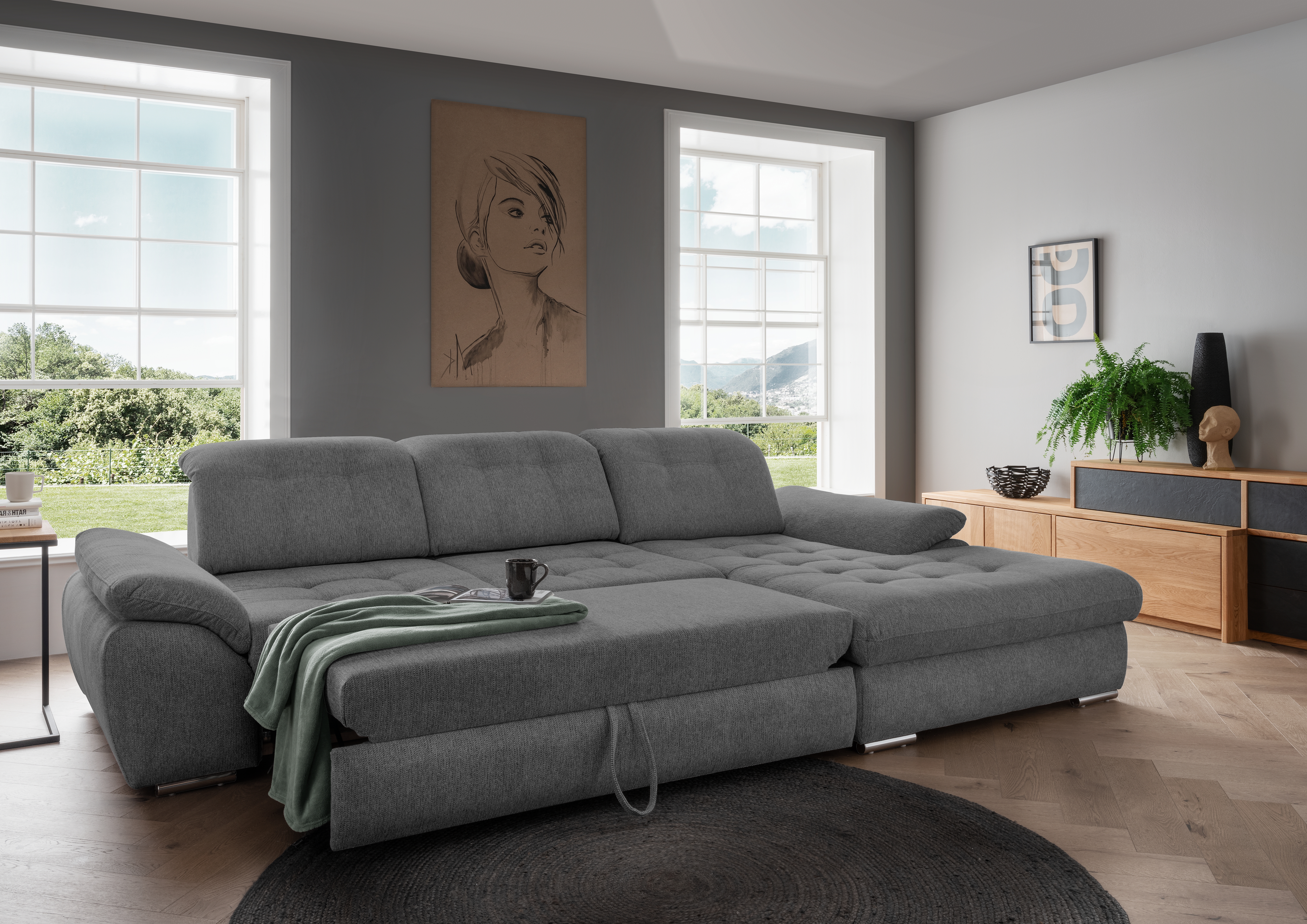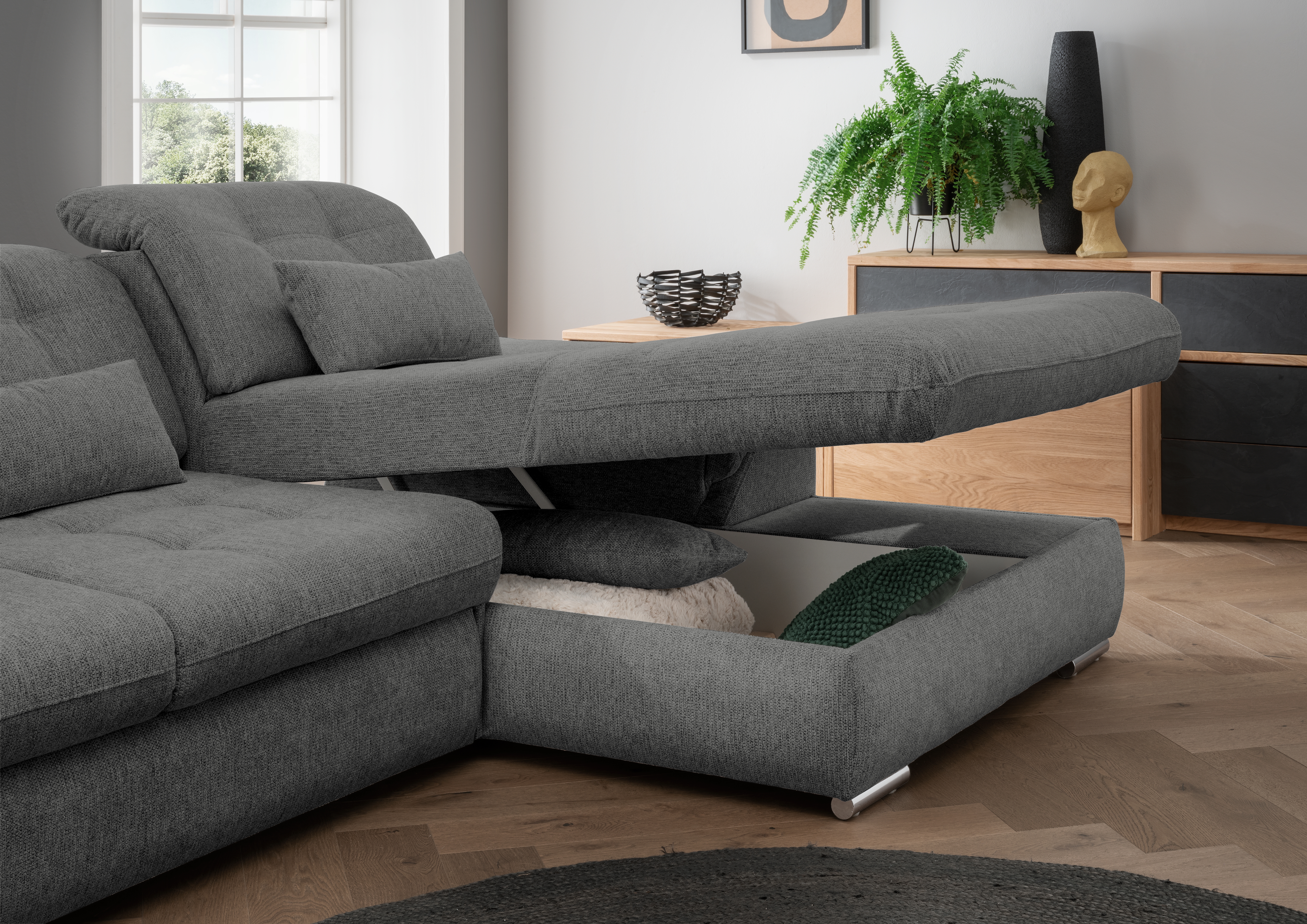 | Equipement canapés: | Appuie-tête(s), Dos habillé, Méridienne à droite, Prolongement de l'assise manuellement, incl. coffre de lit, incl. coussins | ||