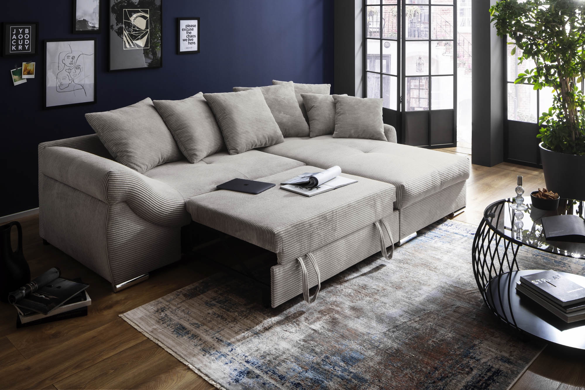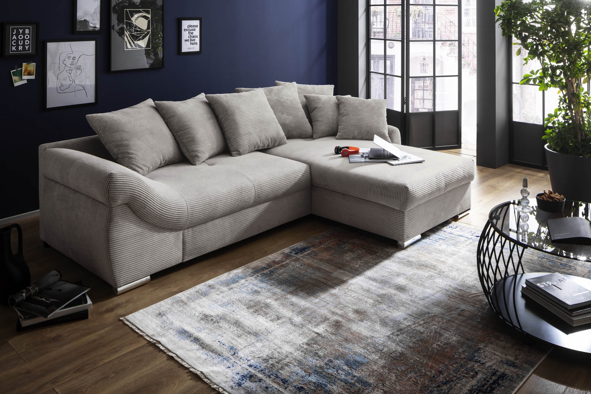| Equipement canapés: | Dos habillé, Méridienne à droite, incl. coffre de lit, incl. coussins | ||