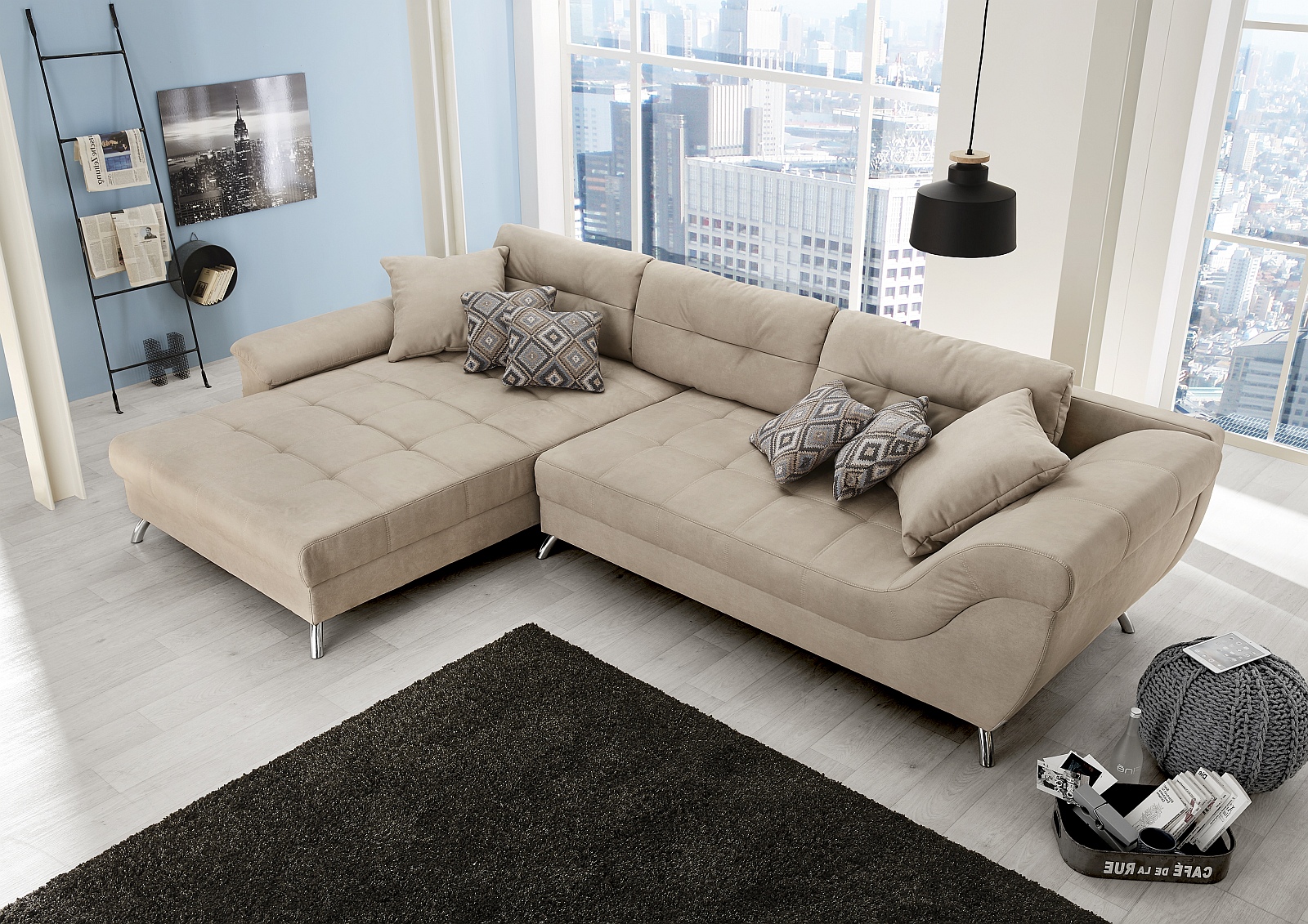 Canapé d'angle ultra tendance aspect nubuck avec une surpiqûre attrayante dans l'assise. Le garnissage de qualité avec suspension nosag, mousse polyéther et couche de mousse haute résilience intégrée garantit un excellent confort d'assise. Grâce à son dos habillé, ce canapé peut être positionné librement dans la pièce.