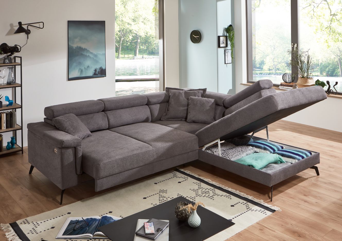 | Equipement canapés: | Appuie-tête(s), Méridienne à droite, Prolongement de l'assise motorisé, incl. coffre de lit, incl. coussins | ||