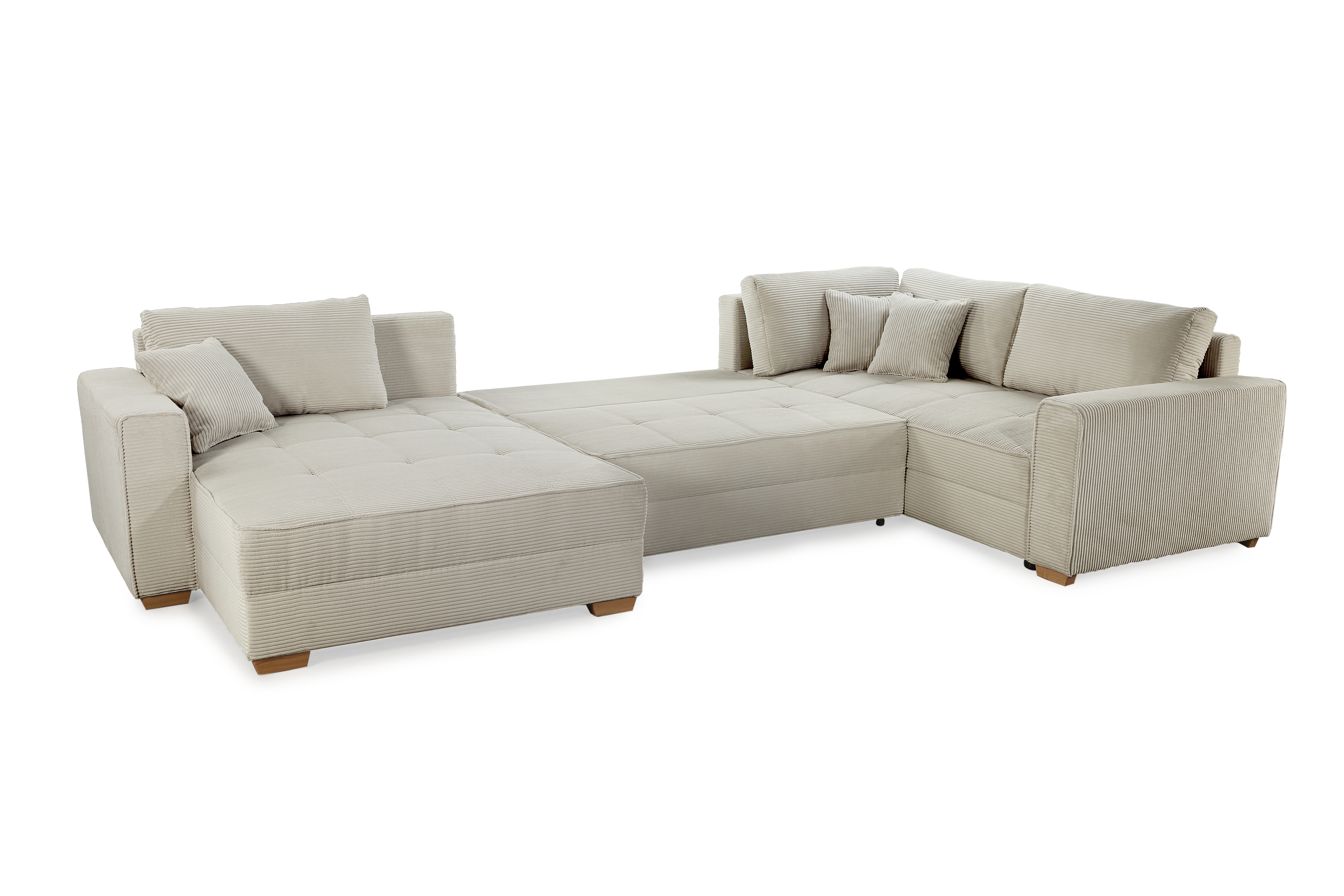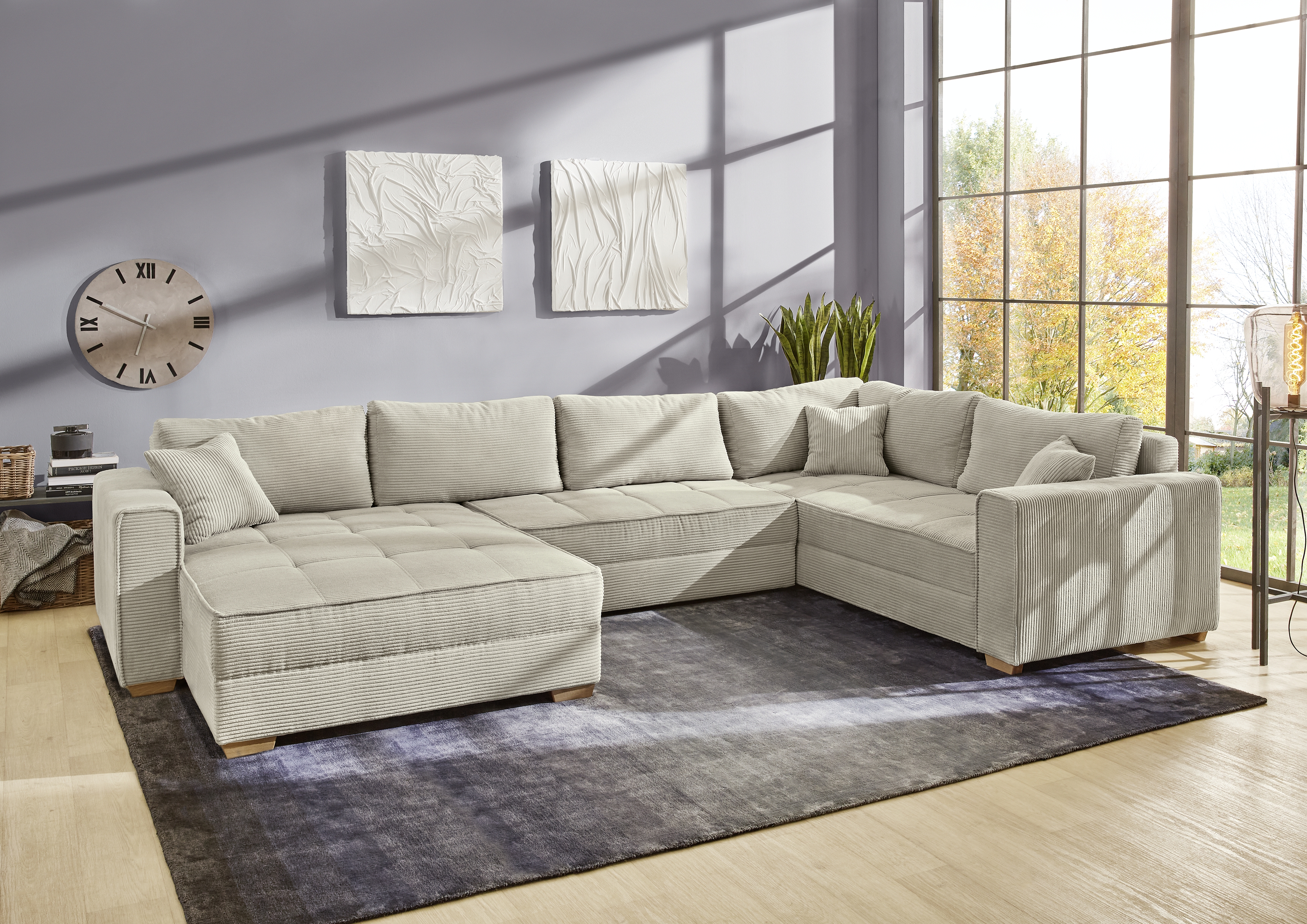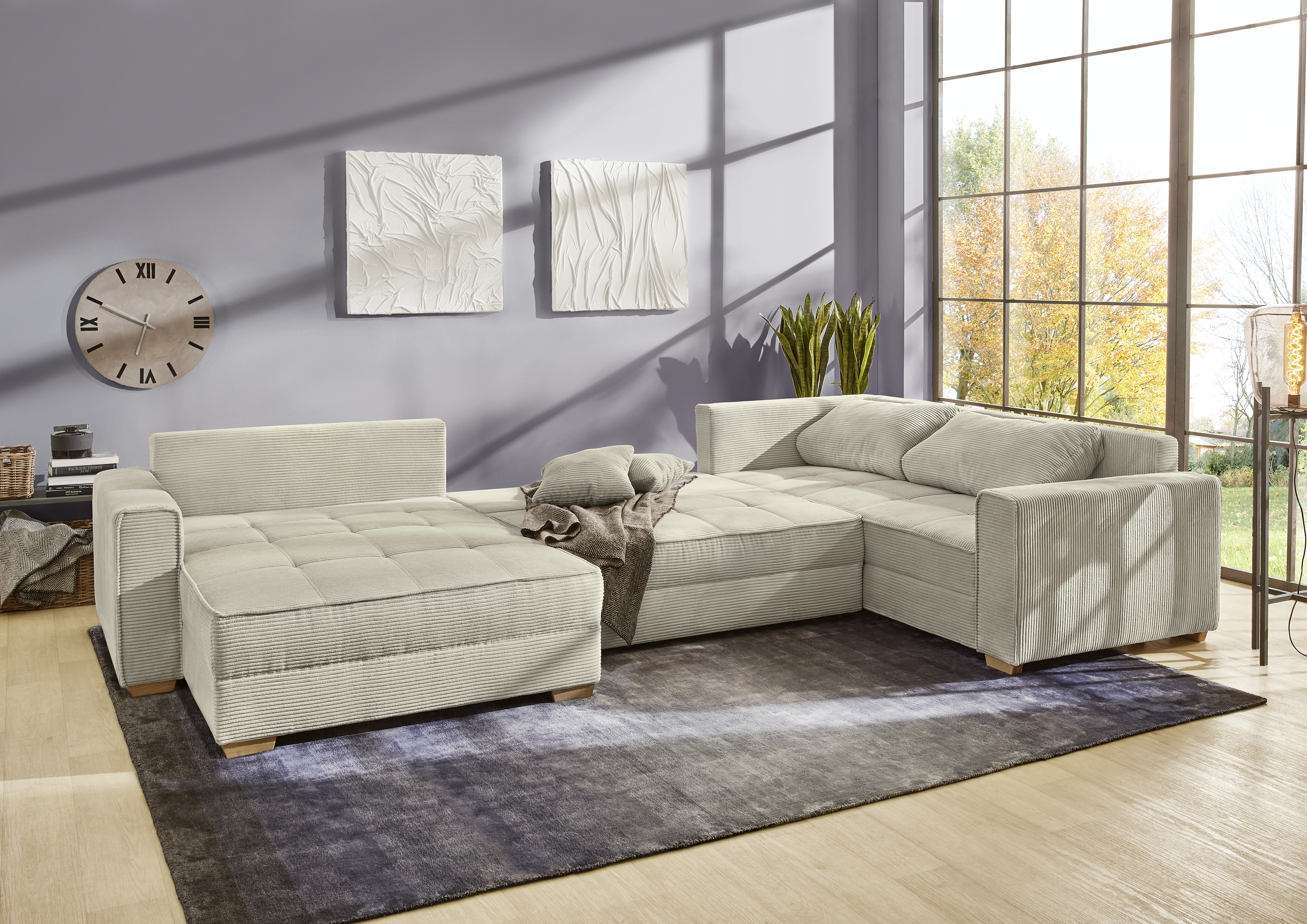 | Equipement canapés: | Dos habillé, Méridienne à droite ou à gauche, incl. coffre de lit, incl. coussins | ||