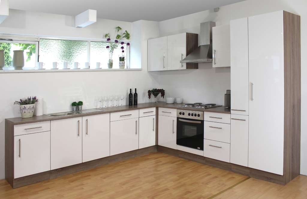 Issu de la série de meubles de cuisine JULIA dans un joli coloris : blanc ultra brillant et imitation chêne Sonoma truffe