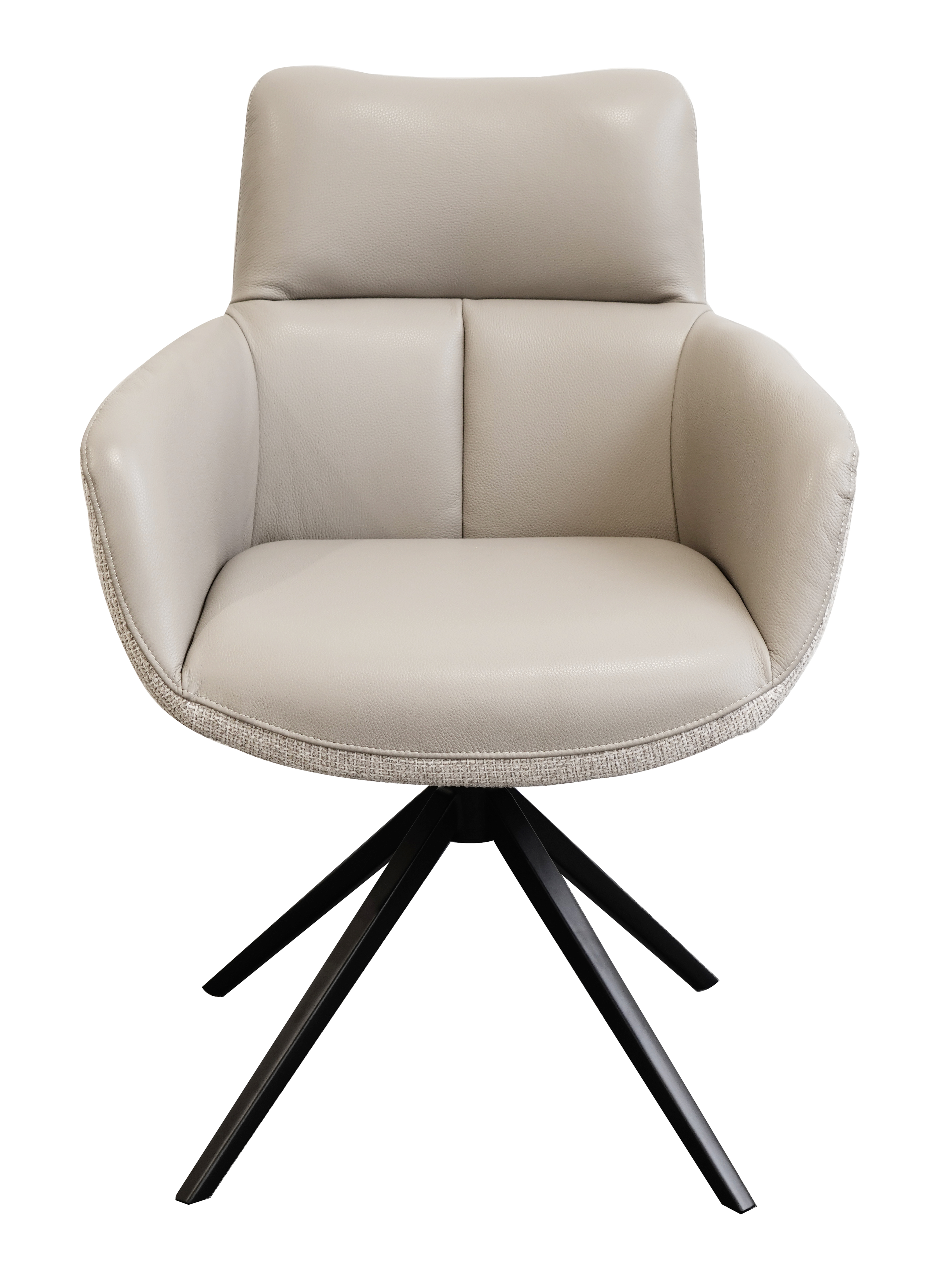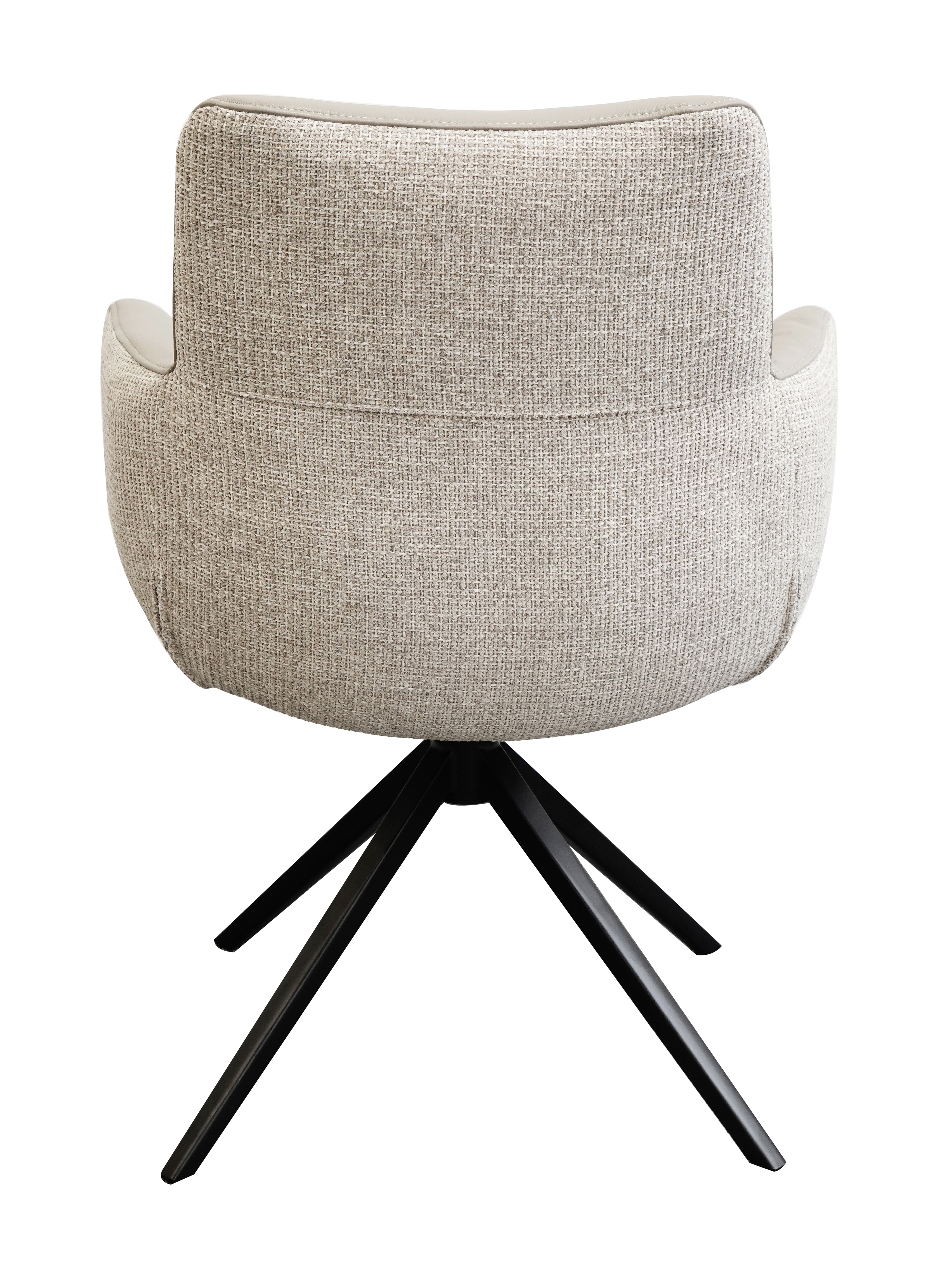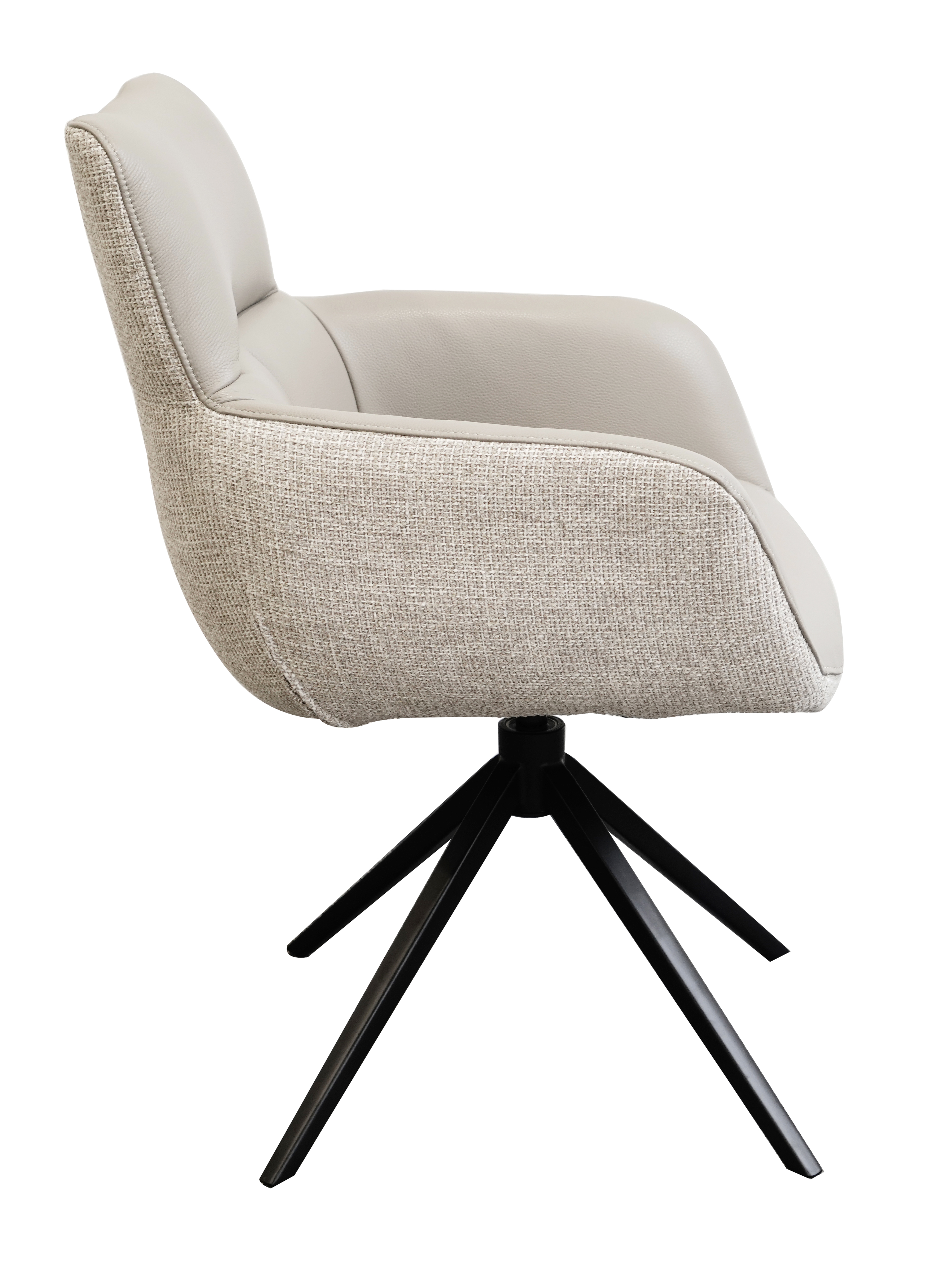 Cette chaise allie un design moderne à un confort fonctionnel. La structure en métal thermolaqué garantit stabilité et longévité. Le revêtement en cuir haut de gamme à l'intérieur offre un confort d'assise agréable, tandis que le revêtement en tissu à l'extérieur confère un aspect chaleureux. Grâce à la fonction de rotation à 360° avec retour automatique, la chaise reste flexible et se repositionne automatiquement. Les accoudoirs complètent le confort d'assise et la rendent idéale pour les salles à manger et les salons.