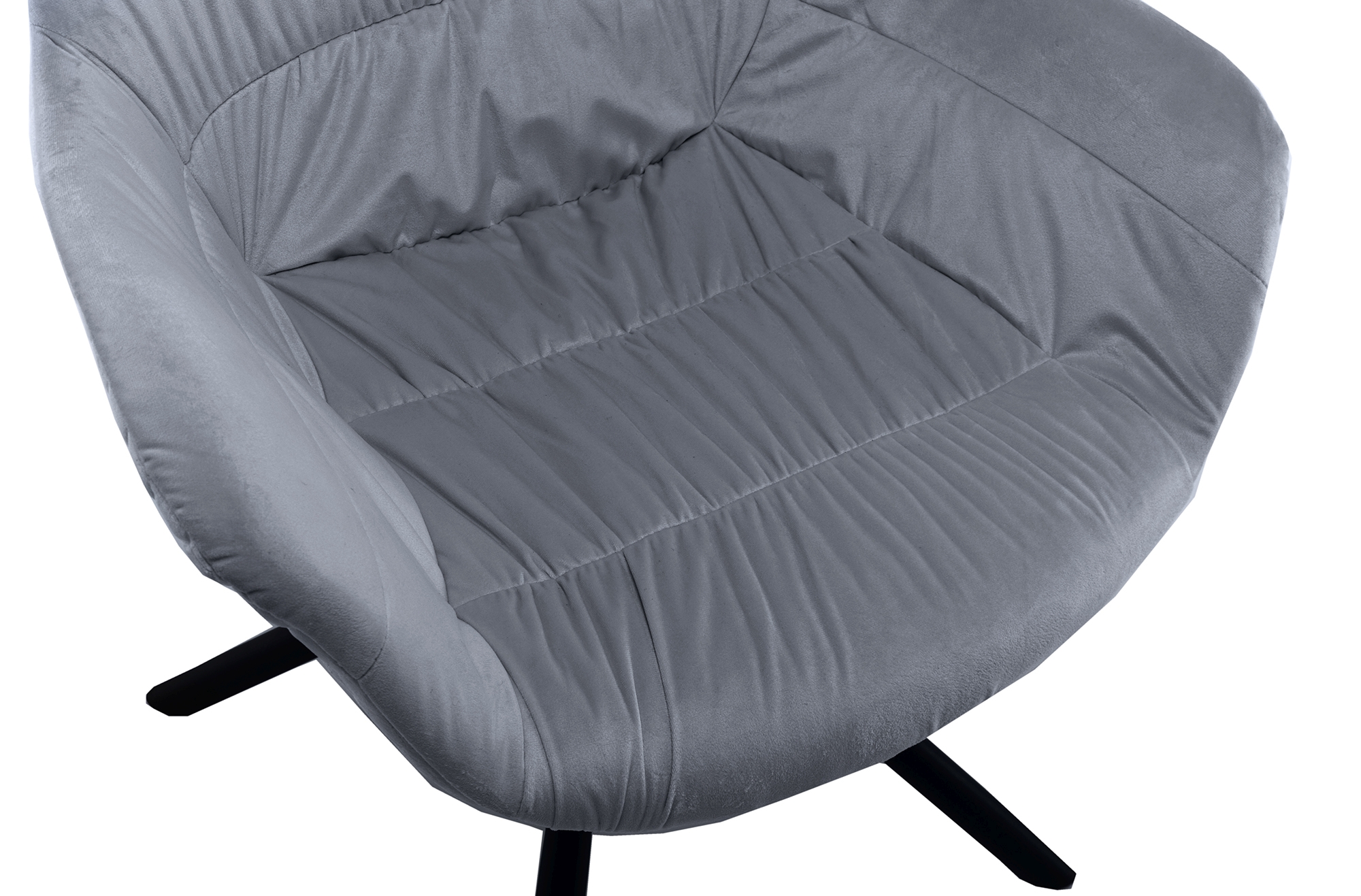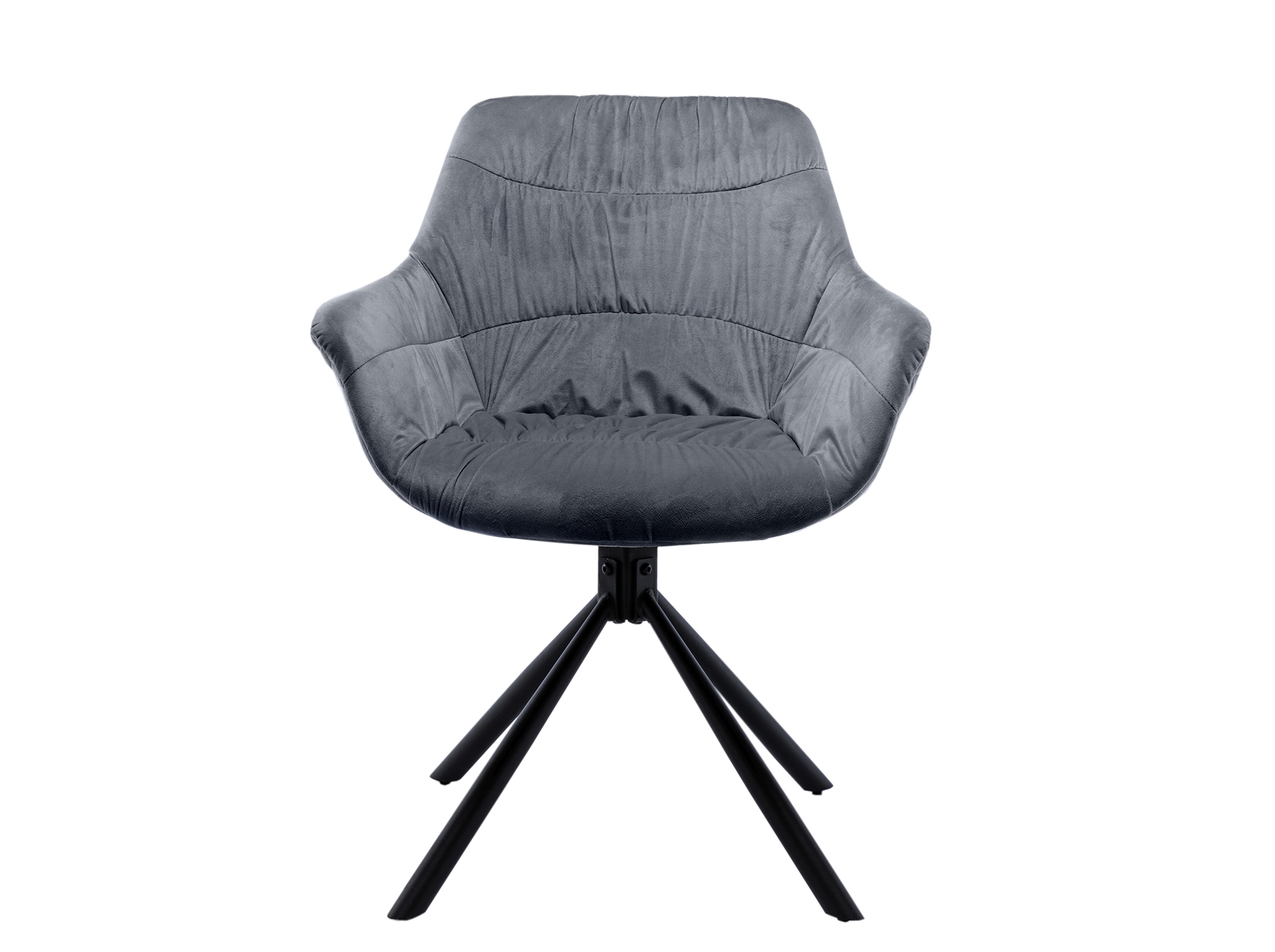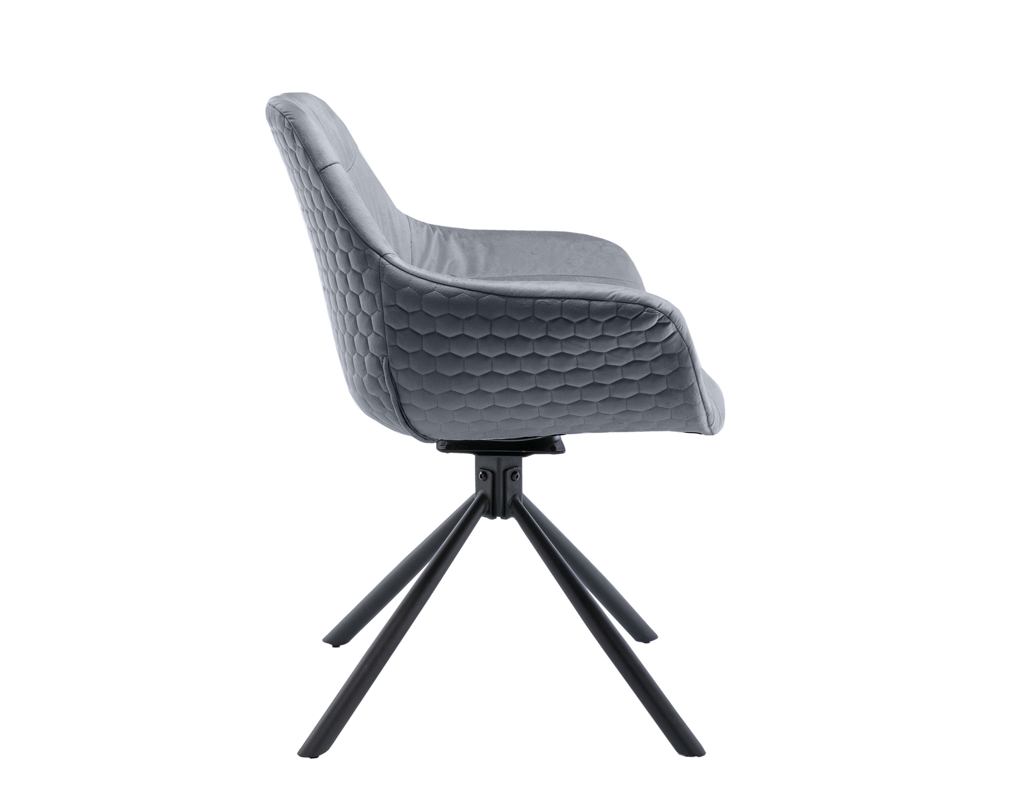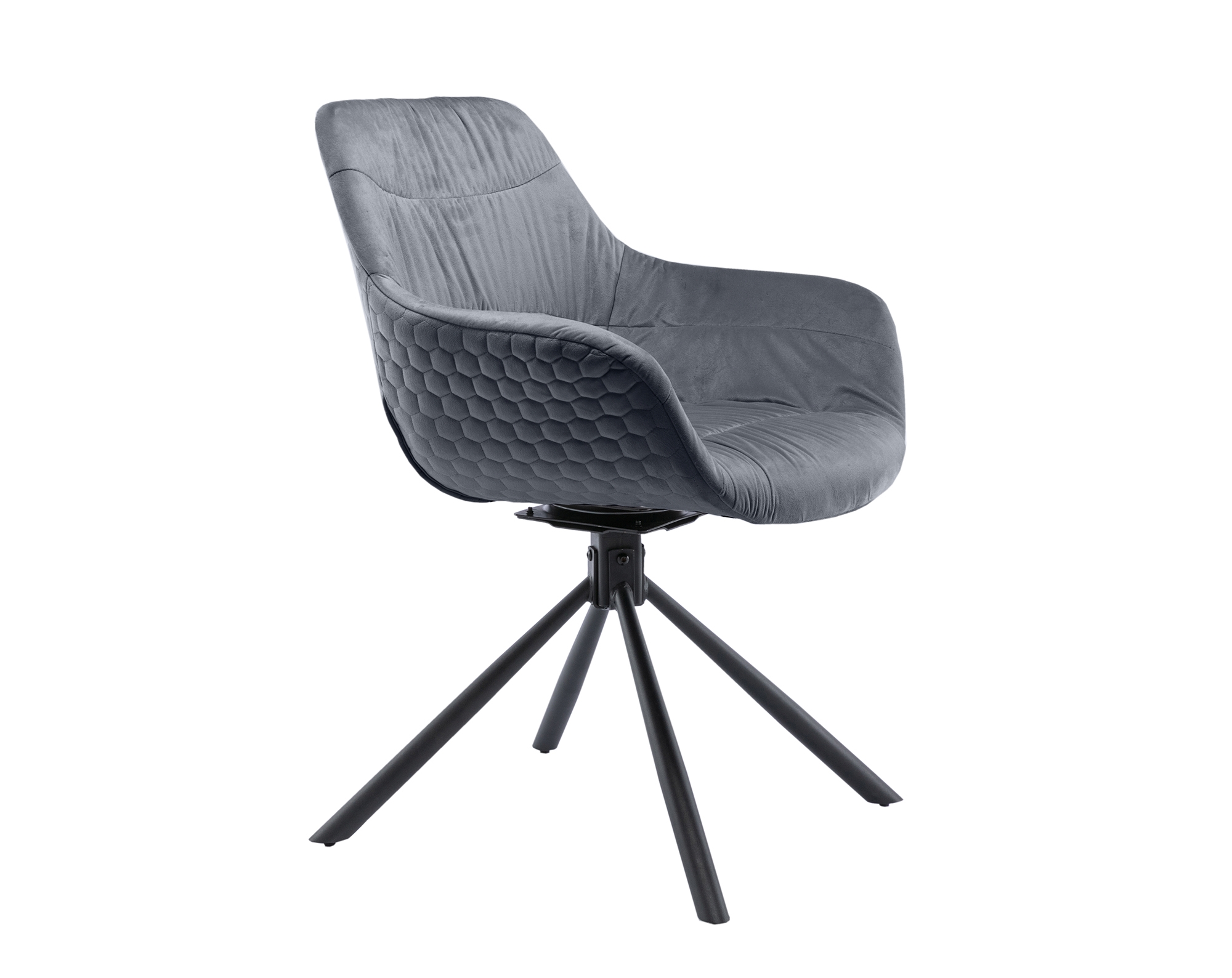 La chaise à accoudoirs tendance séduit par son revêtement en tissu aspect velours et son piètement avec fonction pivotante à 360° en métal finition époxy ton noir. Le piètement garantit une excellente stabilité et s’harmonise parfaitement avec le revêtement de la chaise. Grâce à la coque confortable et aux accoudoirs, vous bénéficierez d'un confort d'assise exceptionnel. Les surpiqûres horizontales au niveau de l'assise et du dossier ainsi que l'aspect nid d’abeilles dans le dos attireront tous les regards dans la pièce. Grâce à sa forme originale, cette chaise rembourrée peut aussi être utilisée comme chaise de réunion. Peu importe où il sera placé, vous allez adorer ce siège confortable… et vos invités aussi vont le plébisciter !