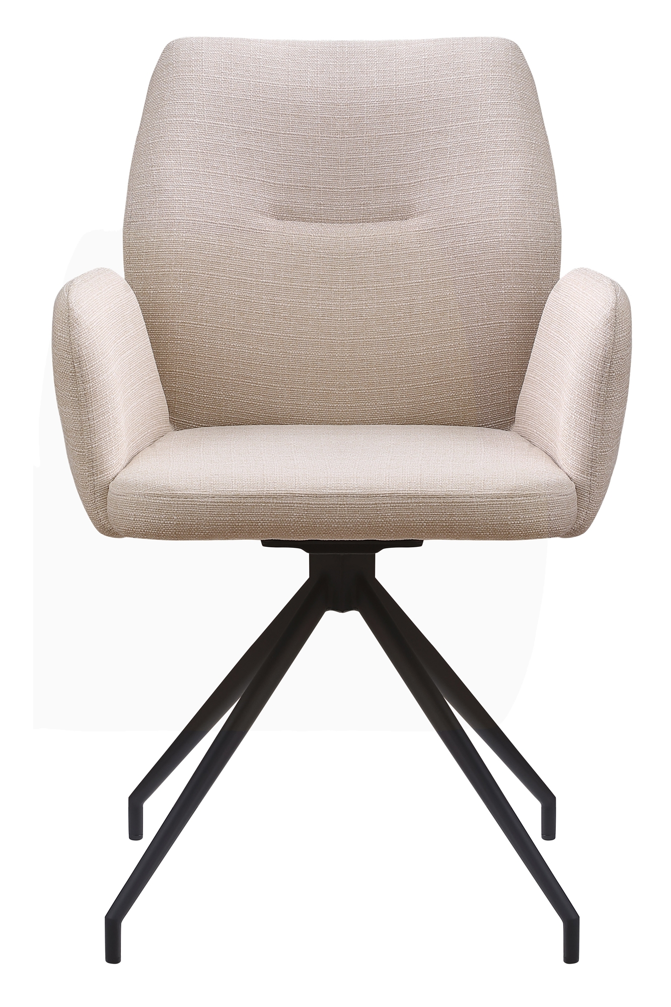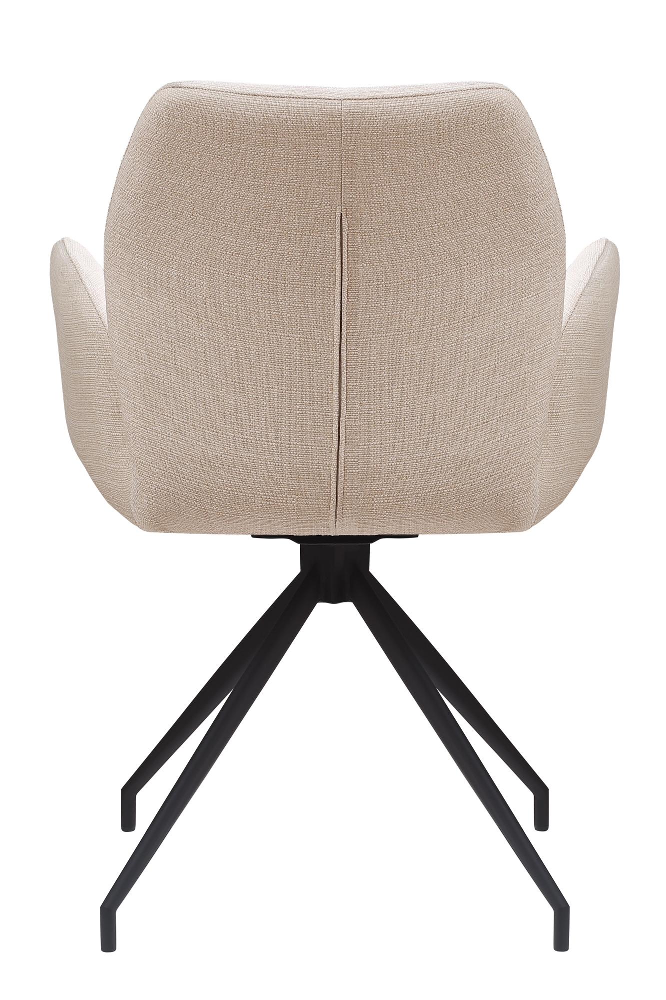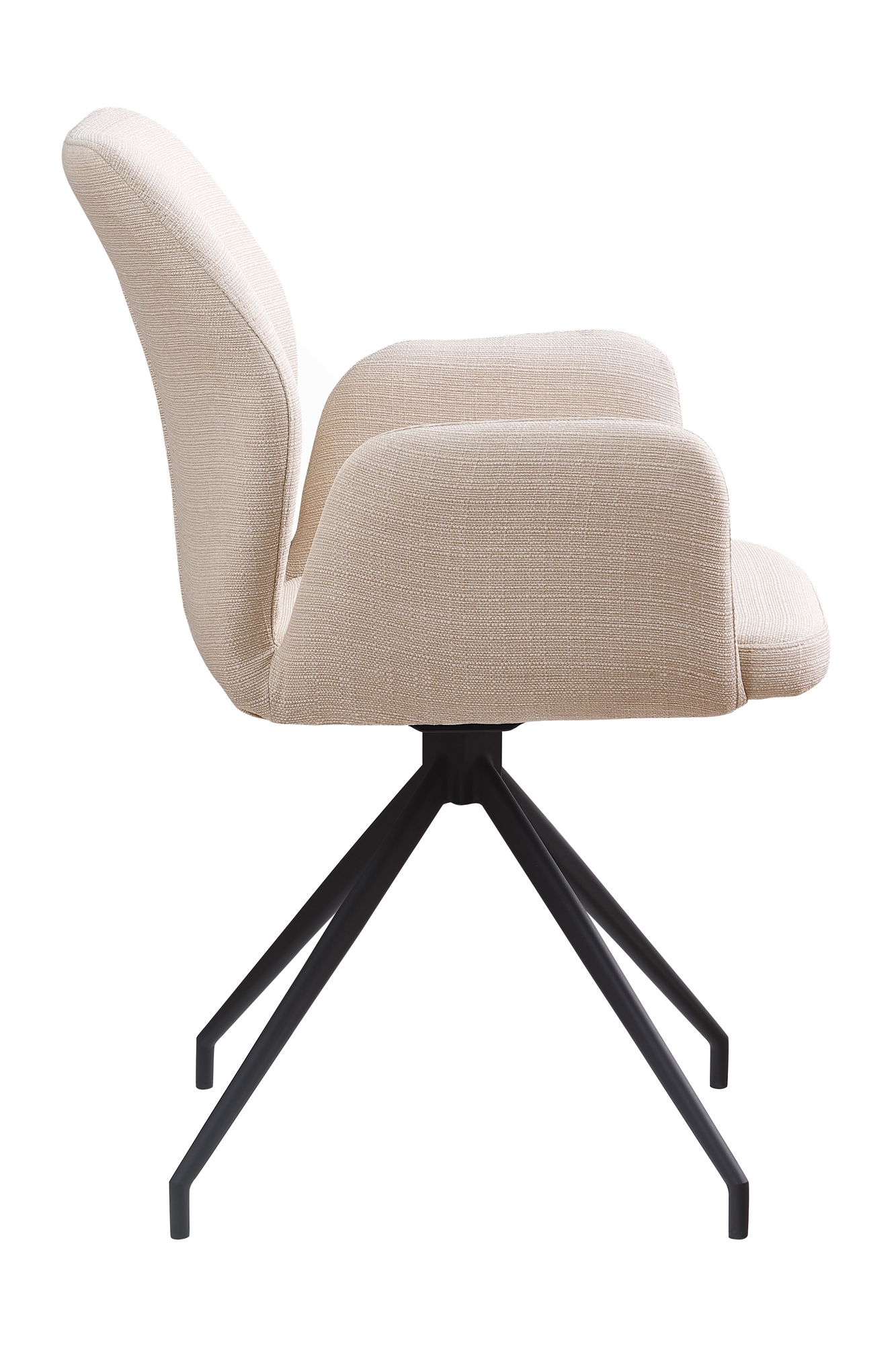 Un modèle qui séduit par son aspect tendance et l'excellente qualité des finitions : grâce à son design moderne, la chaise à accoudoirs pivotante à 180° s'intégrera facilement dans votre intérieur. Elle peut en effet s'utiliser de façon polyvalente comme chaise de salle à manger, pour la coiffeuse ou le télétravail. La chaise rembourrée séduit par ses formes tendance avec un dossier ergonomique pourvu d'une couture décorative, une assise droite et des accoudoirs légèrement évasés. Elle dispose d'un garnissage agréable pour un excellent confort d'assise. Le siège est revêtu d'un élégant tissu texturé robuste proposé dans de nombreux coloris unis au choix. Le piètement design tout en finesse en métal finition époxy est un autre point fort de cette chaise. Grâce au mécanisme pivotant intégré, le fauteuil permet une assise dynamique.