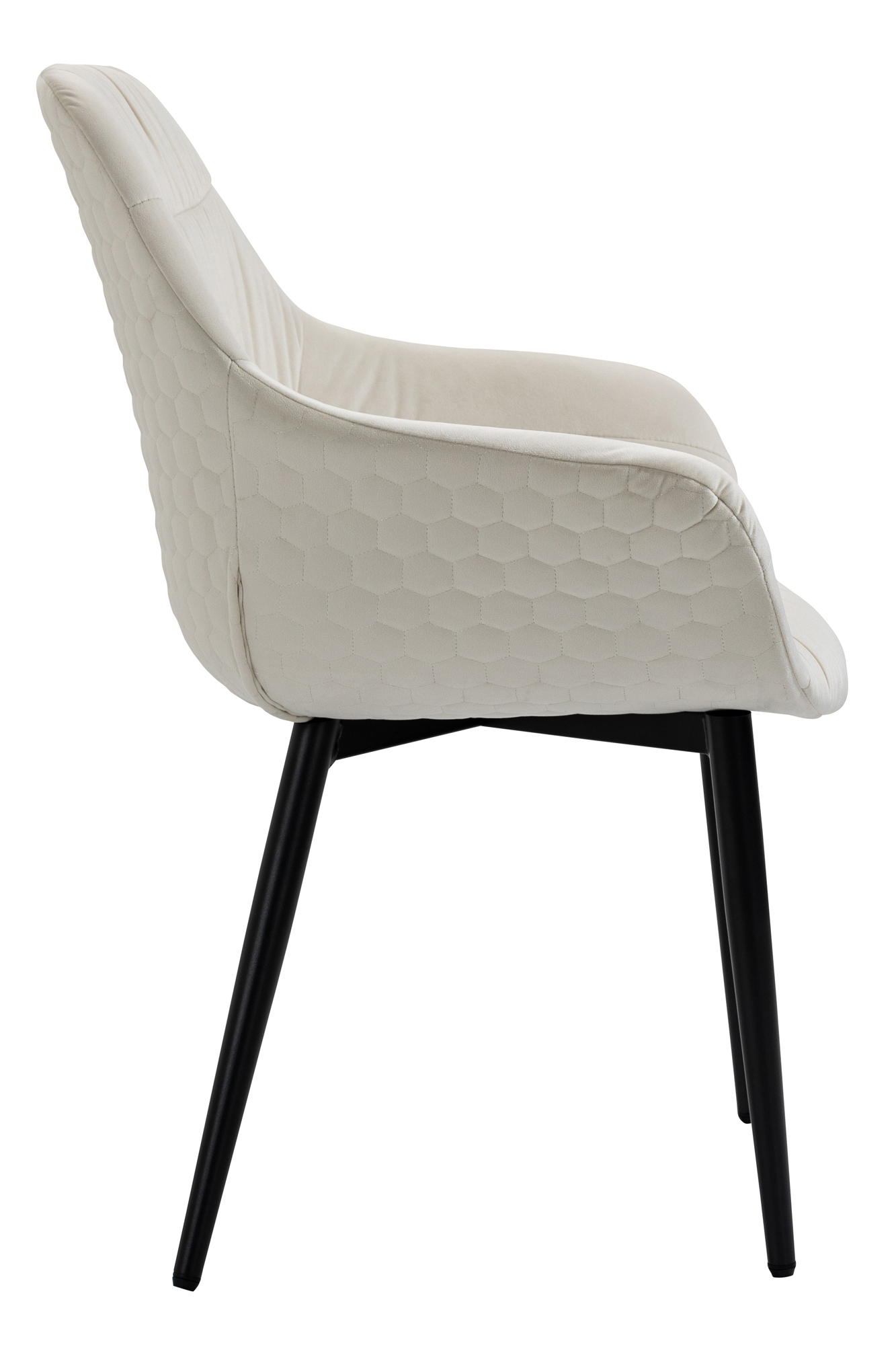 La chaise à accoudoirs tendance séduit par son revêtement en tissu aspect velours et son piètement à 4 pieds en métal finition époxy ton noir. Les pieds en métal garantissent non seulement une stabilité sans vacillement, mais s’harmonisent aussi parfaitement avec le revêtement. Grâce à la coque confortable, vous bénéficierez d'un confort d'assise exceptionnel. Les surpiqûres verticales au niveau de l'assise et de l'intérieur du dossier ainsi que l'aspect nid d'abeilles à l'extérieur attireront tous les regards dans la pièce. Grâce à sa forme originale, cette chaise rembourrée peut aussi être utilisée comme chaise de réunion. Peu importe où il sera placé, vous et vos invités allez adorer ce siège confortable.