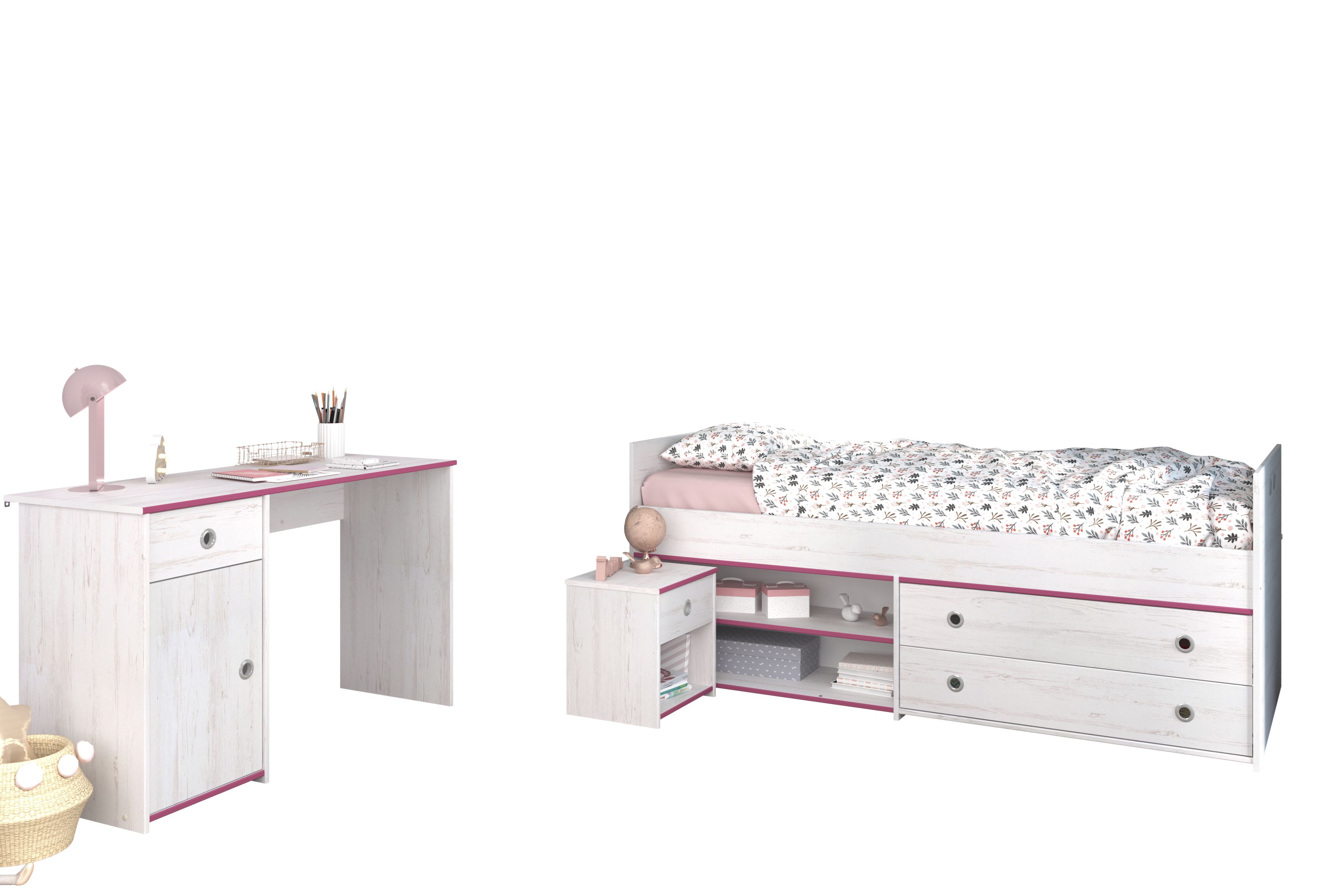 Cette chambre d'enfant 3 éléments est proposée dans un coloris clair et créera une ambiance conviviale pour se sentir bien. Les chants ton rose lui confèrent un aspect tendance. Le lit confortable avec ses grands tiroirs offre beaucoup de place pour les jouets, les livres et bien plus encore. Un chevet à côté du lit avec un tiroir très pratique permet de faire régner l'ordre. Le bureau avec sa grande surface de travail permet de faire rapidement les devoirs.
