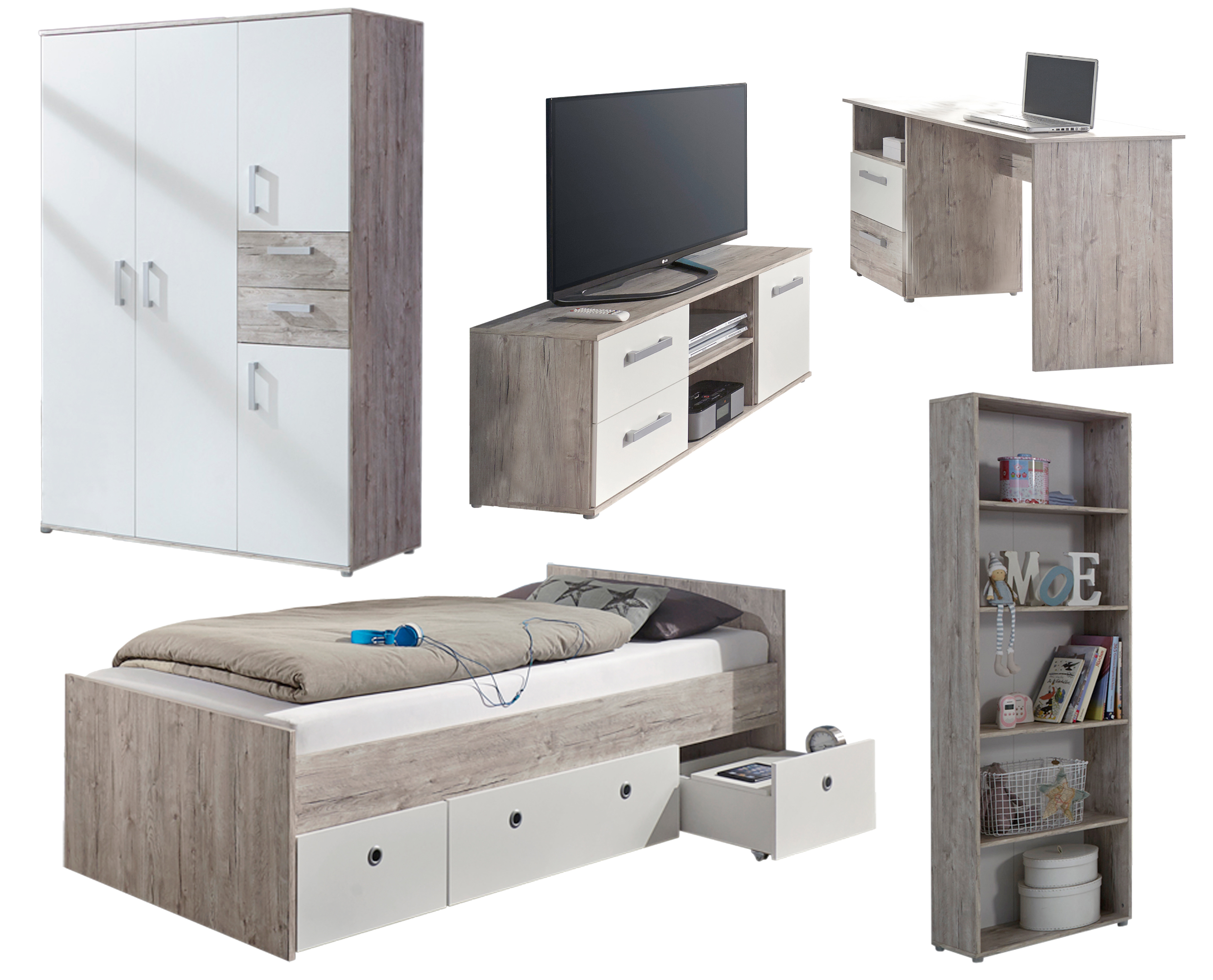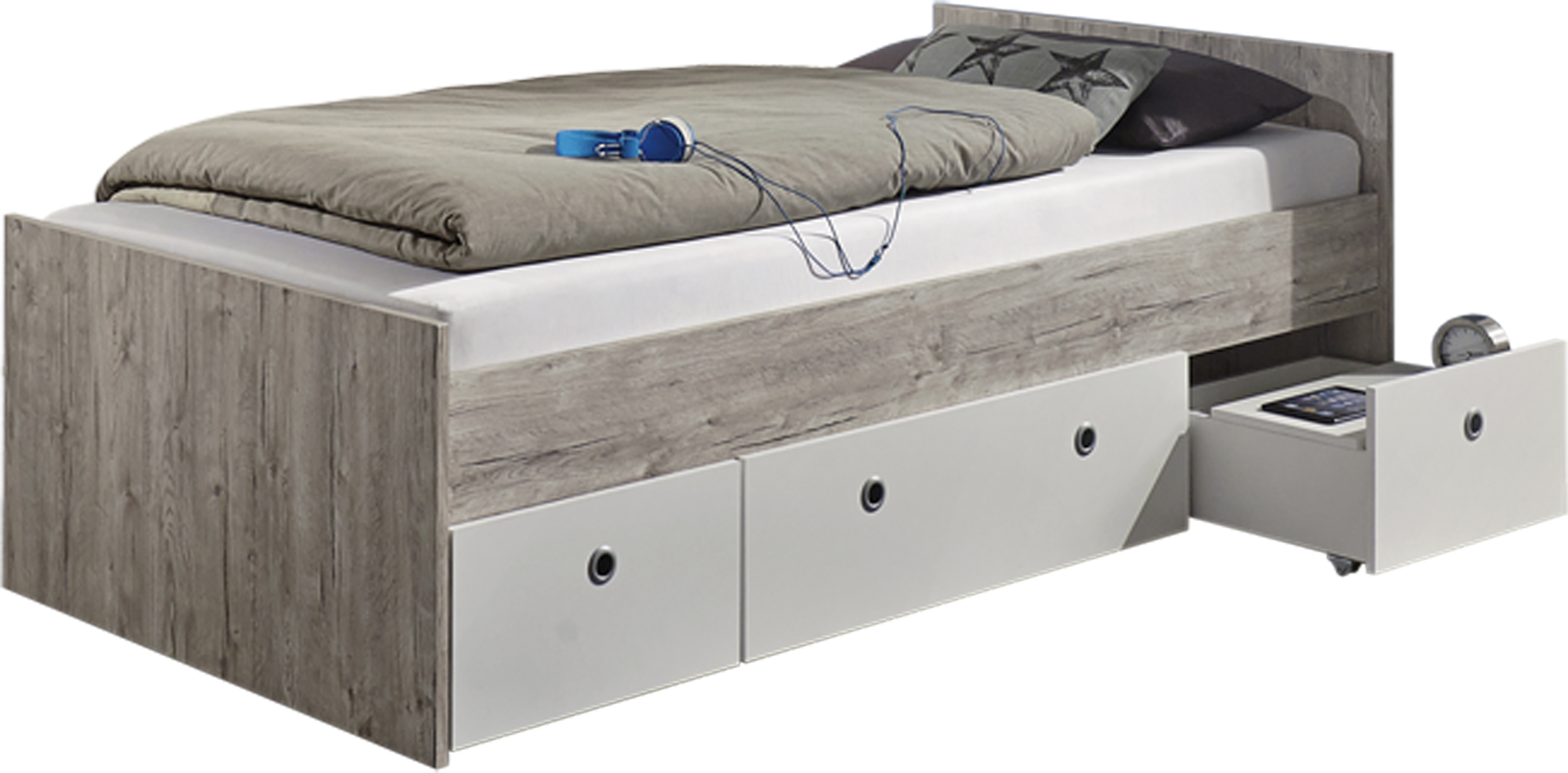 1 lit junior avec 3 tiroirs à roulettes - dont un pourvu d'un couvercle souple pour être utilisé comme chevet