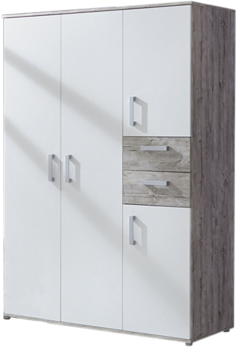 1 armoire à vêtements avec 4 portes et 2 tiroirs ; derrière les 2 portes de gauche se trouvent 1 tablette amovible et 1 barre de penderie ; derrière les deux portes de droite, on trouve, à chaque fois, 1 tablette amovible