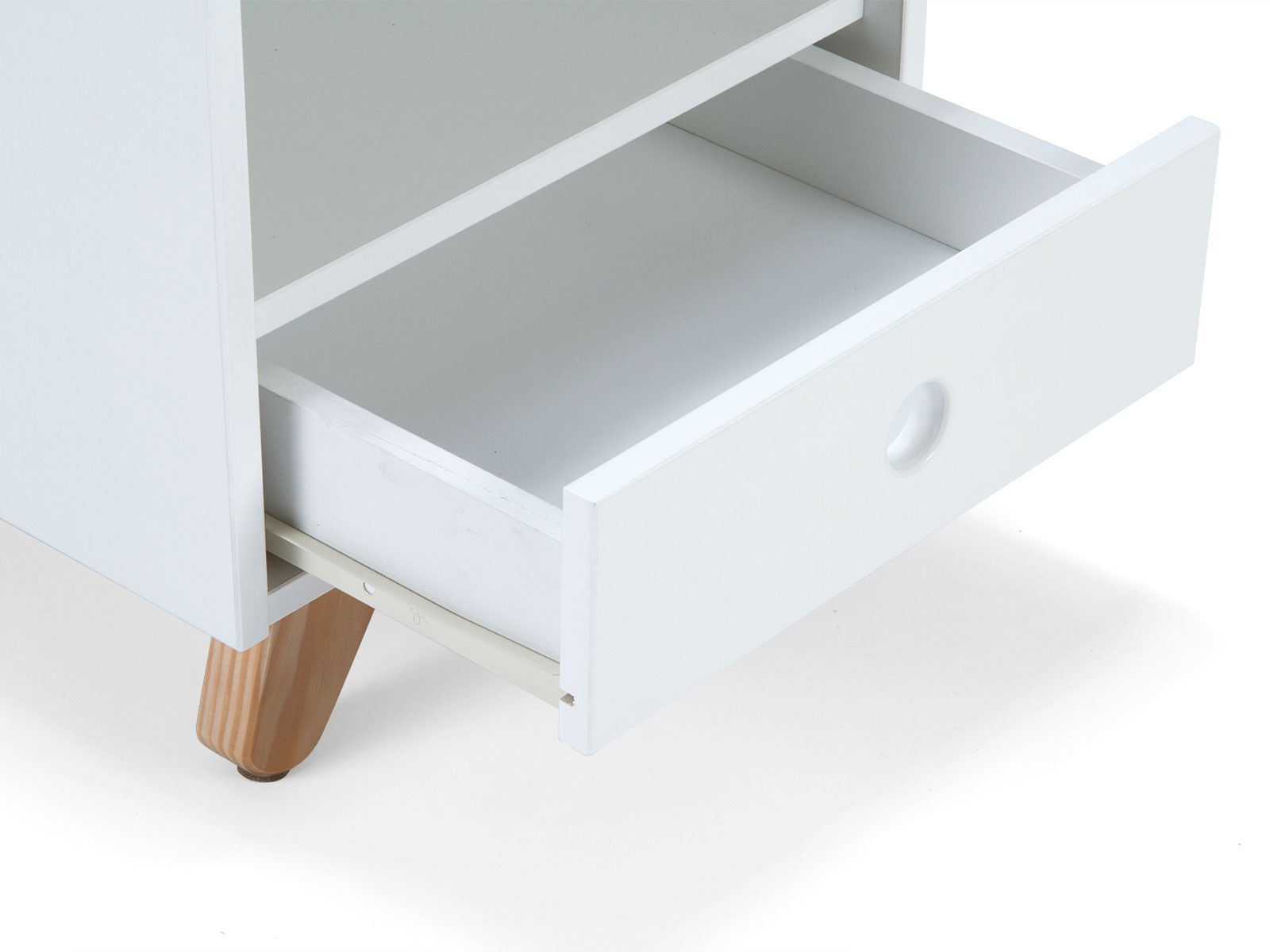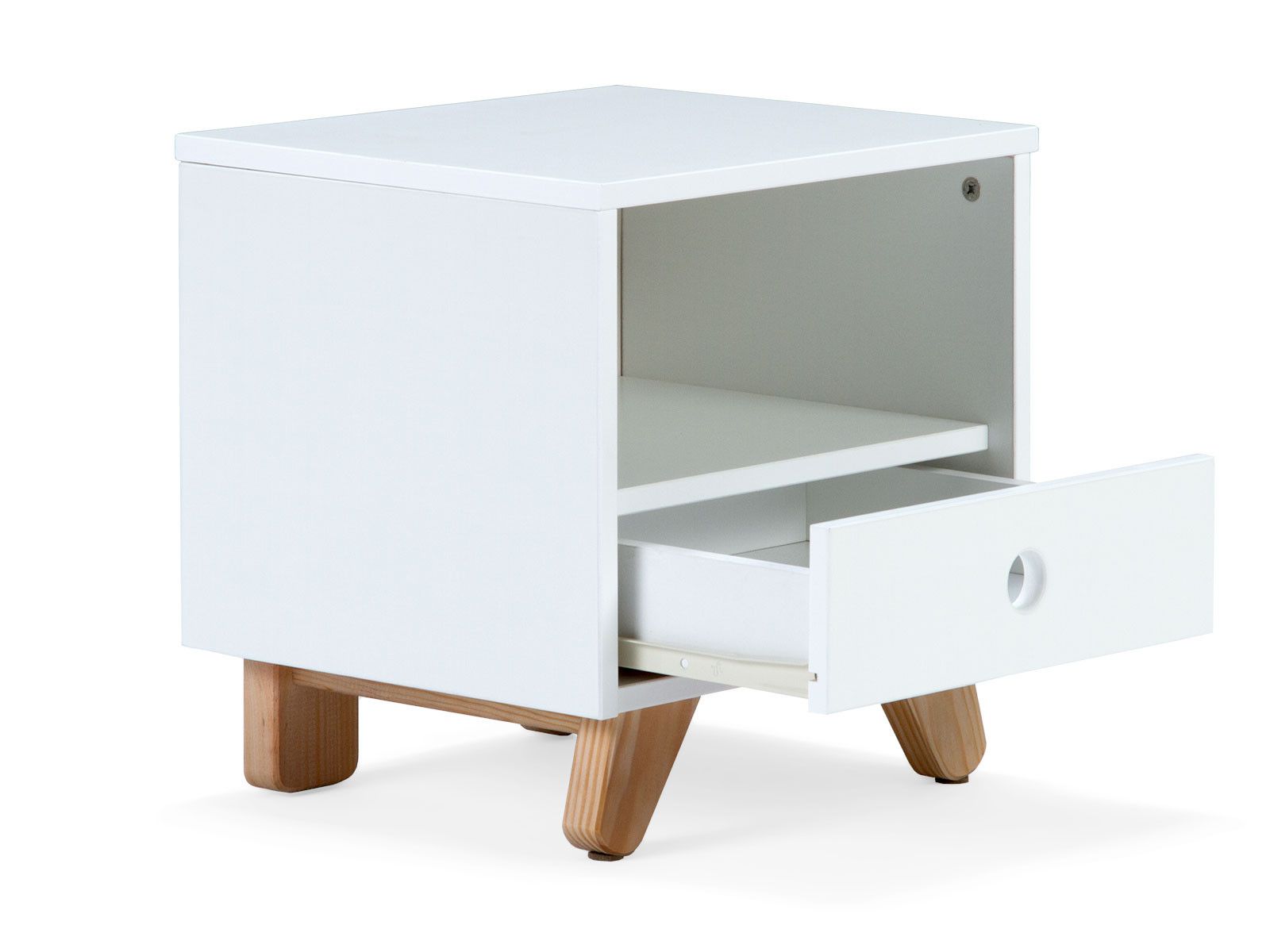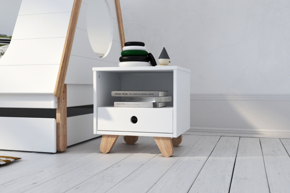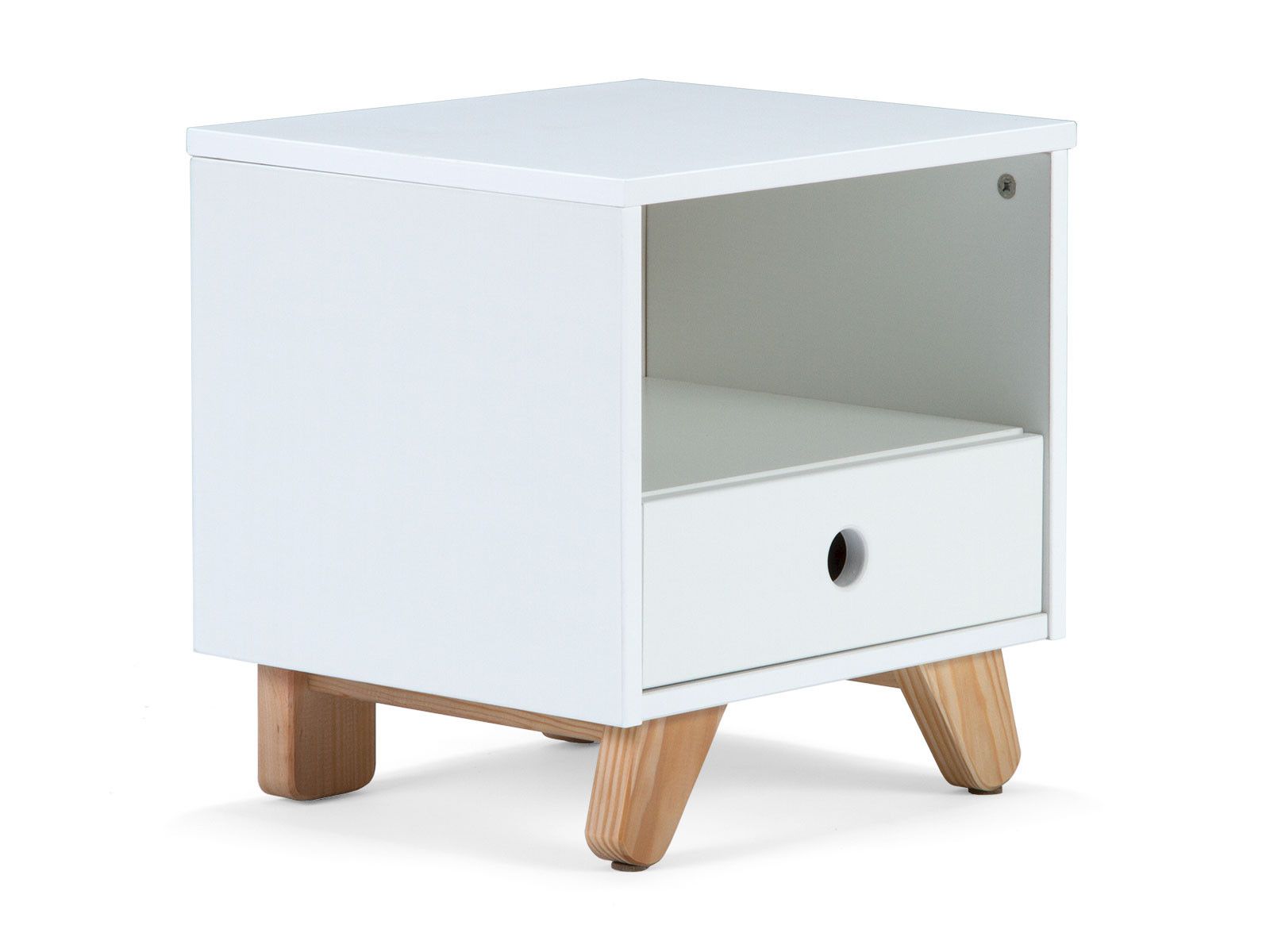Ce chevet dans un design scandinave classique permet de poser la lampe de chevet et les livres ; il dispose d'un casier ouvert pour un accès facile et d'un tiroir pour un espace de rangement supplémentaire. Le mix nordique et moderne entre les différentes teintes - avec le caisson laqué ton blanc et le bois laissé à l'état naturel - attire tous les regards vers cette table de chevet. La sobriété est soulignée par le design sans poignée avec une encoche de forme ronde. Les pieds en biais en bois de pin confèrent à ce chevet un look particulièrement tendance.