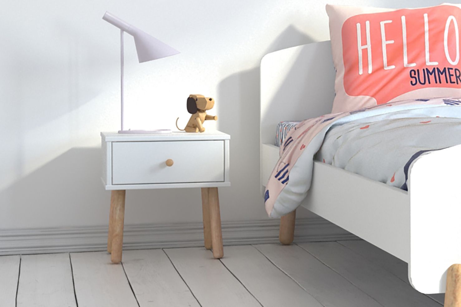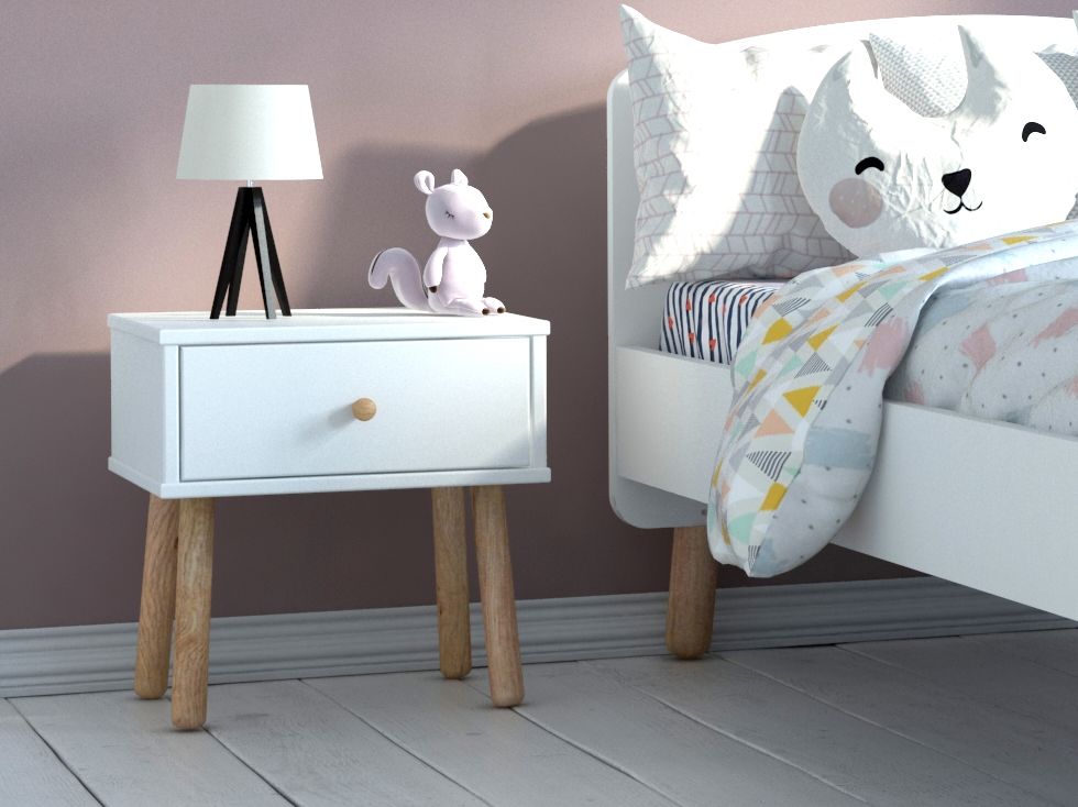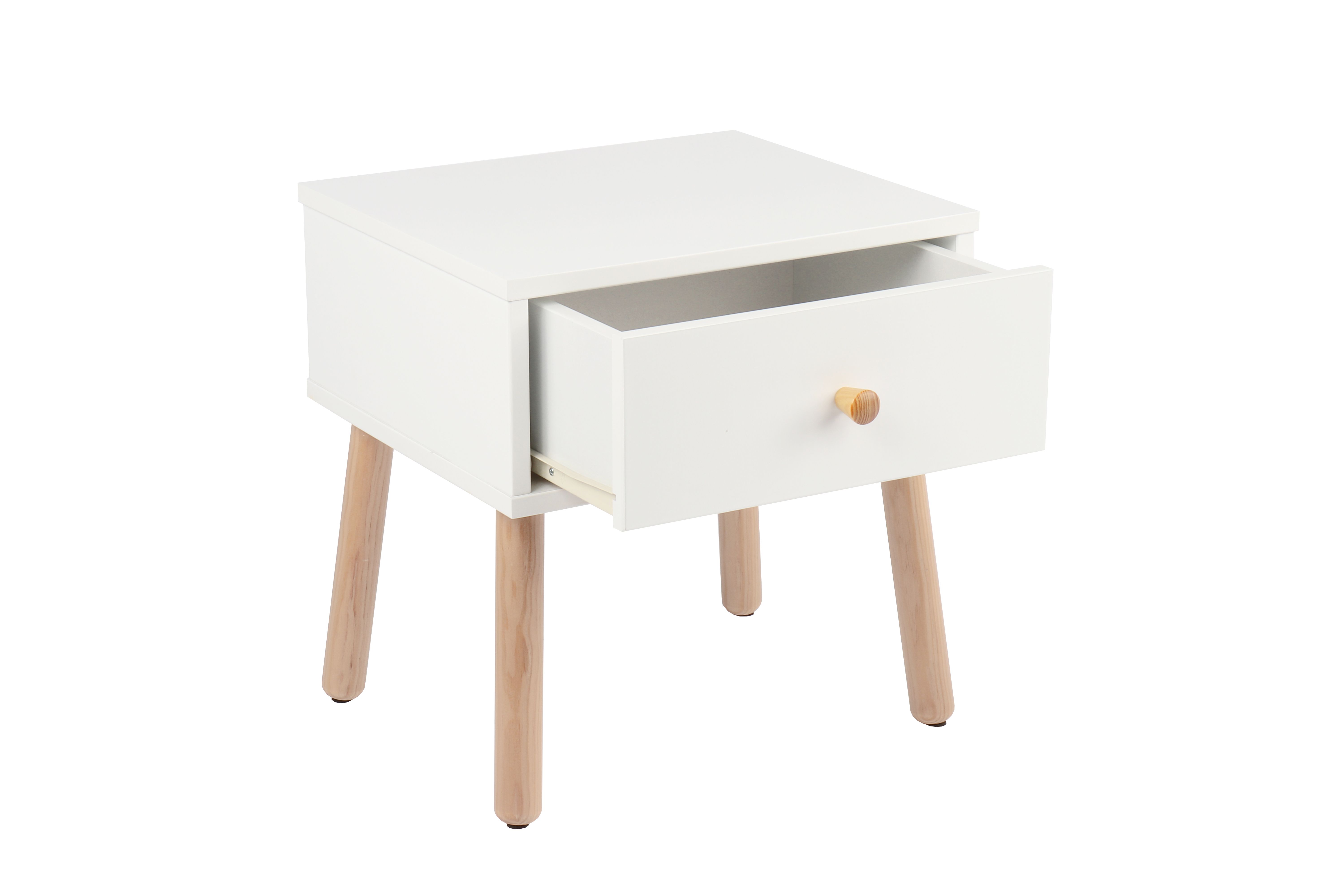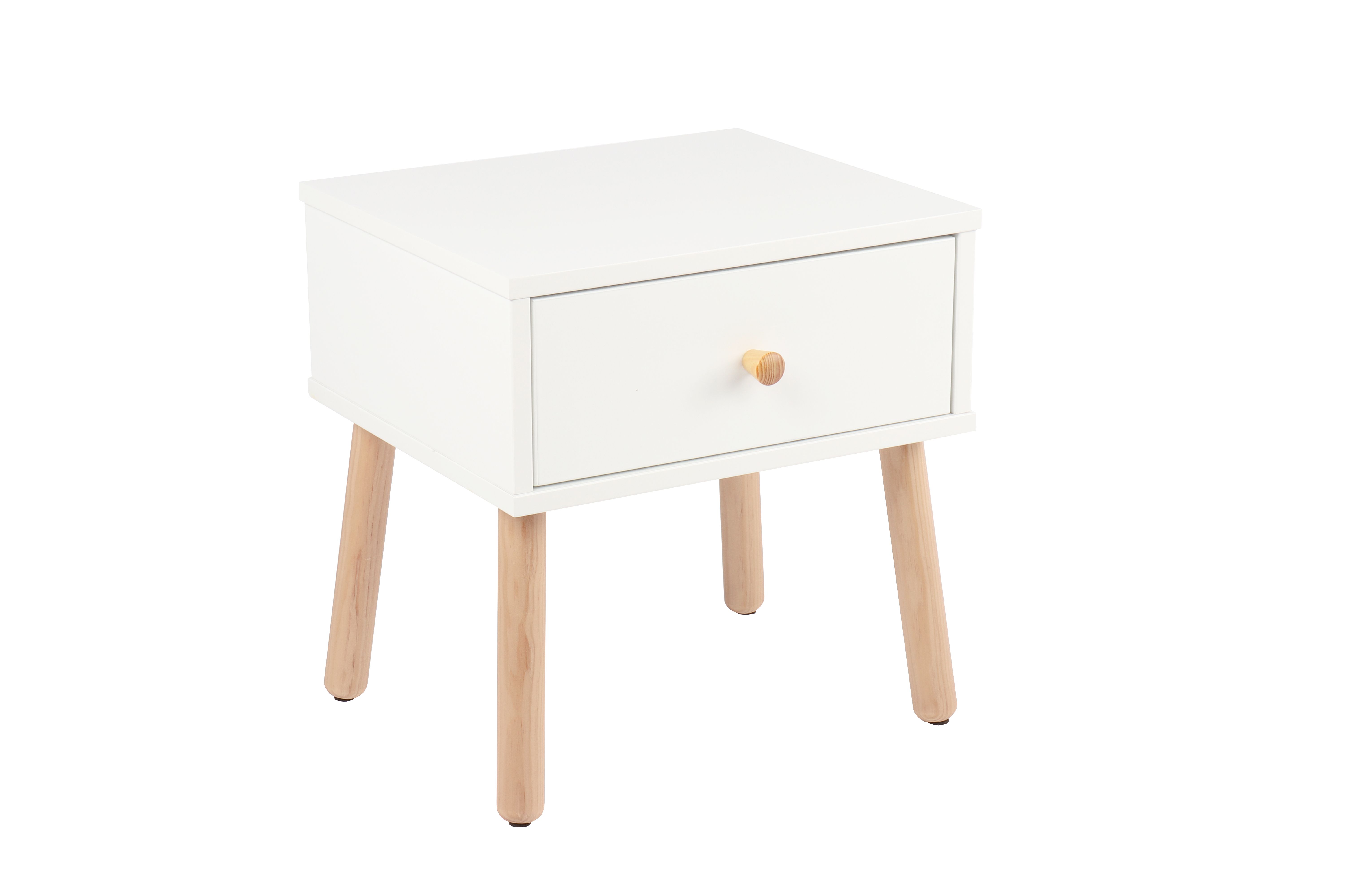 Ce chevet dans un design scandinave classique permet de poser la lampe de chevet et les livres et dispose d'un tiroir pour un espace de rangement supplémentaire. Le mix nordique et moderne entre les différentes teintes - avec le caisson laqué ton blanc et le bois laissé à l'état naturel - attire le regard. Les pieds en biais et la poignée bouton en pin confèrent à la table de chevet un look particulièrement tendance.