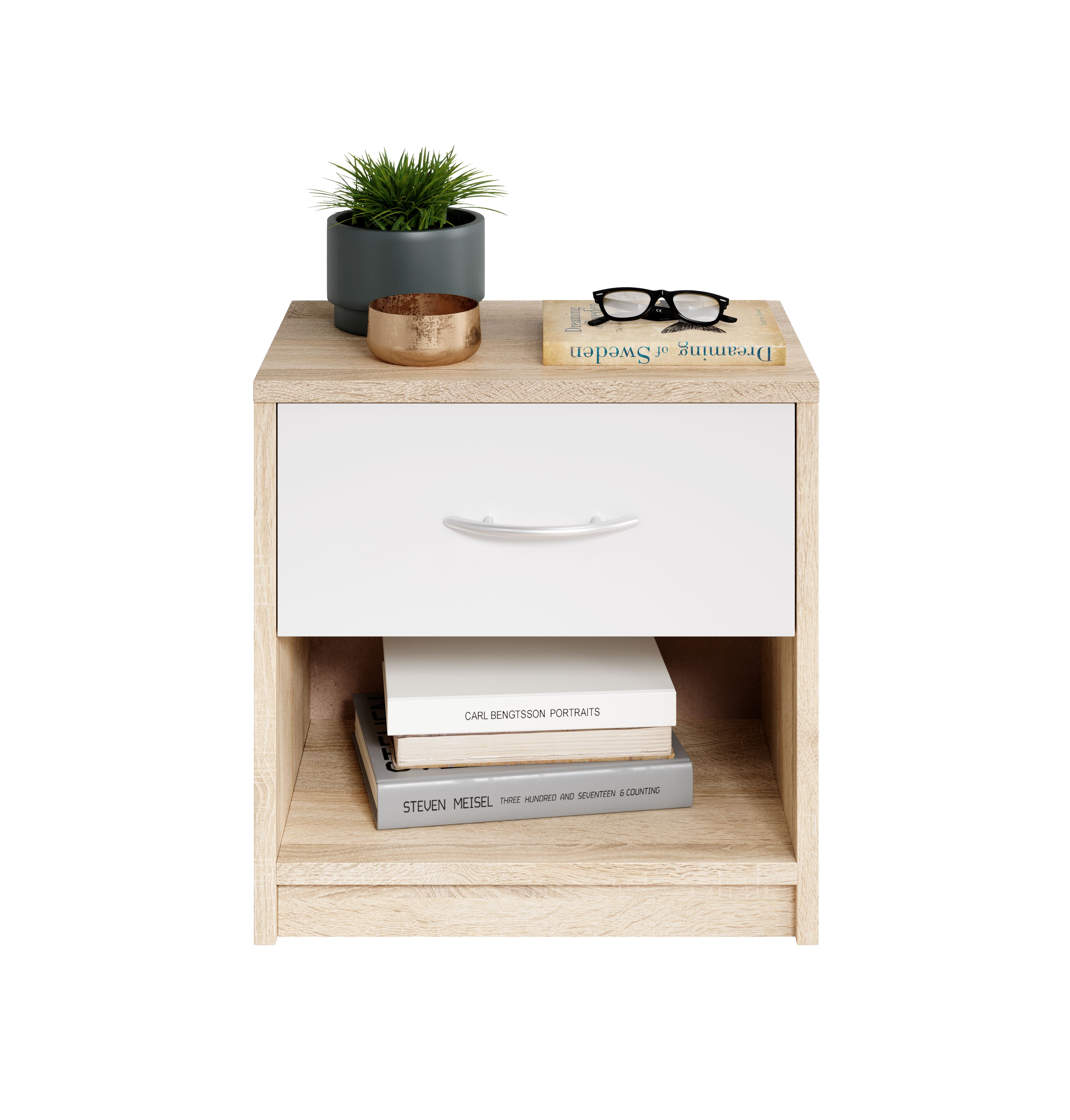 Façade : imitation chêne Sonoma et tiroir ton blanc