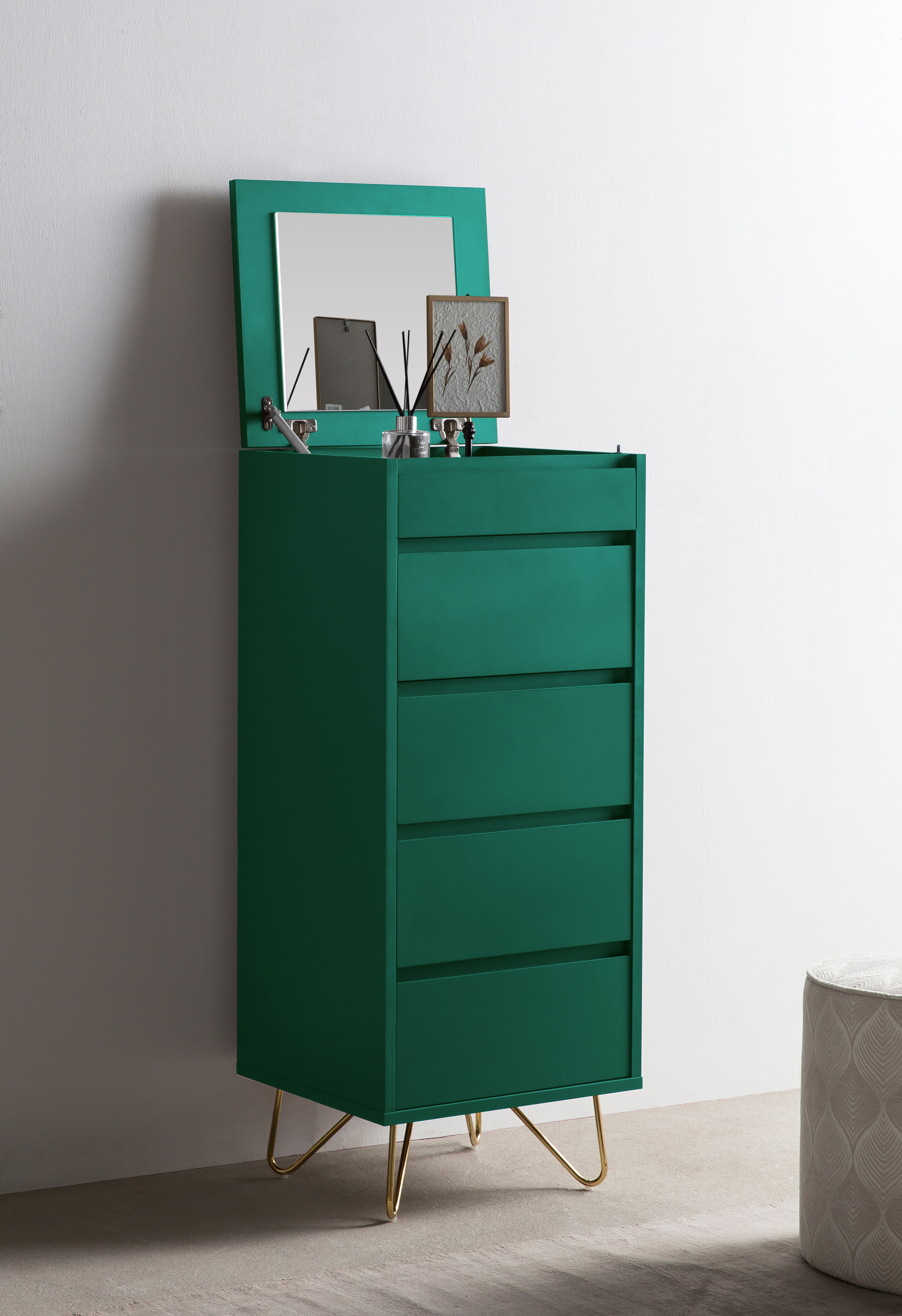 Cette commode moderne dans un joli design scandinave attirera tous les regards. L'association de teintes sobres et des pieds métalliques ton doré fait de ce chiffonnier un meuble très particulier. Grâce à quatre tiroirs spacieux, vous disposerez de beaucoup d'espace de rangement stylé pour les petites choses du quotidien. Un miroir se trouve dans le couvercle rabattable, de sorte que cette commode peut également être utilisée comme coiffeuse. Le design scandinave moderne de cette commode sera toujours tendance et se combinera à merveille avec votre ameublement déjà existant.