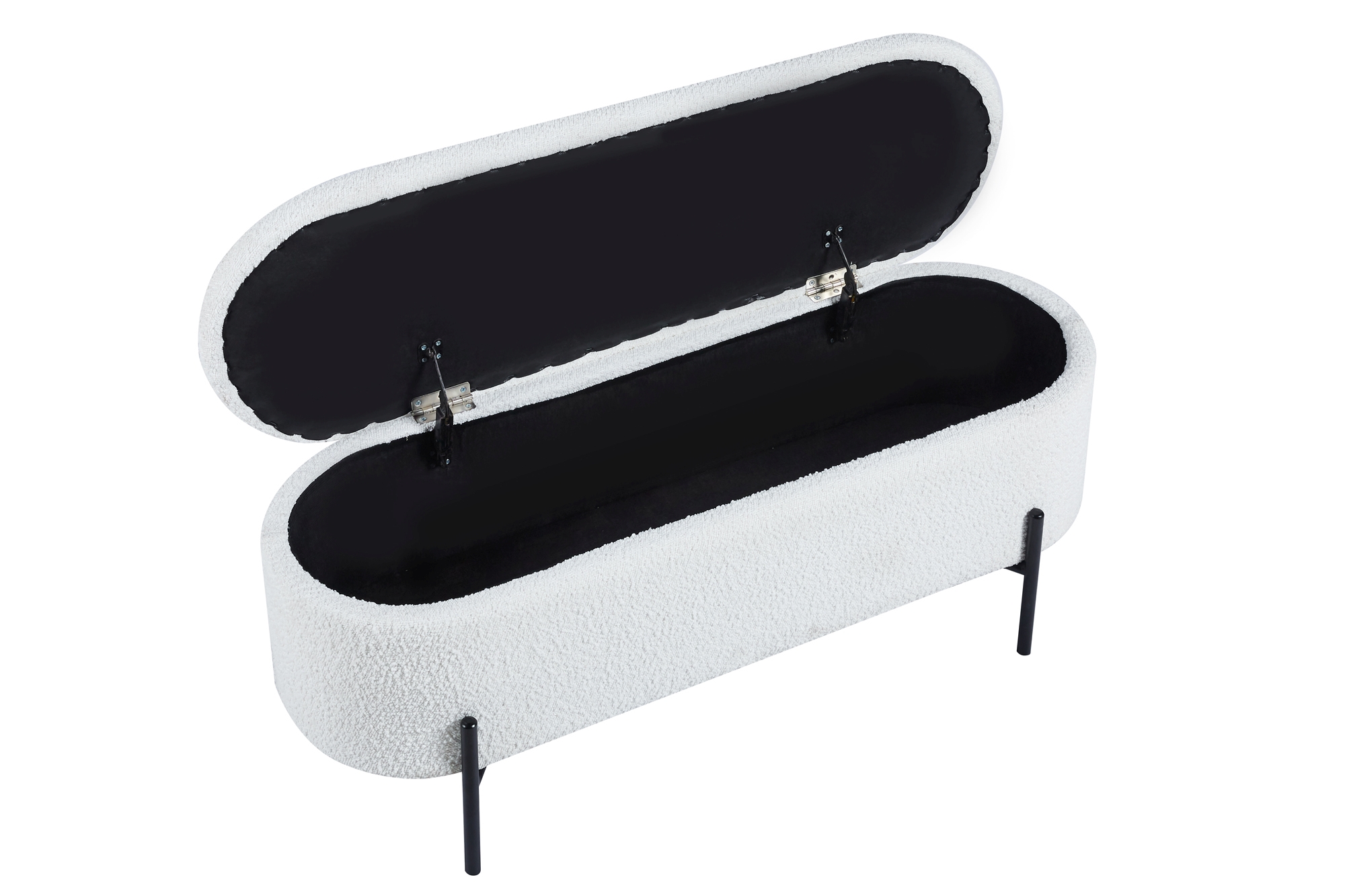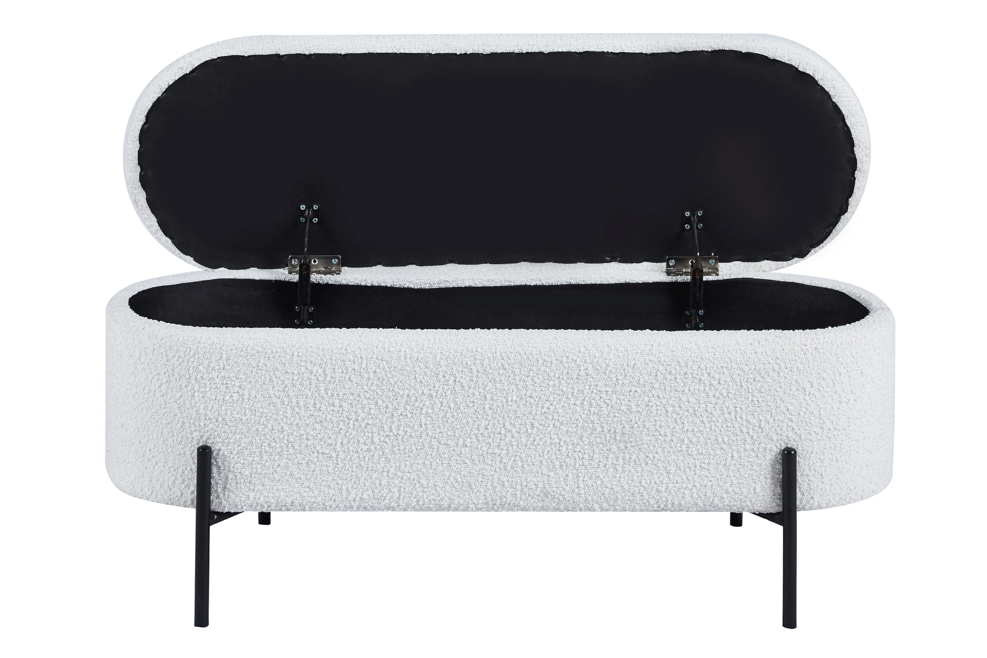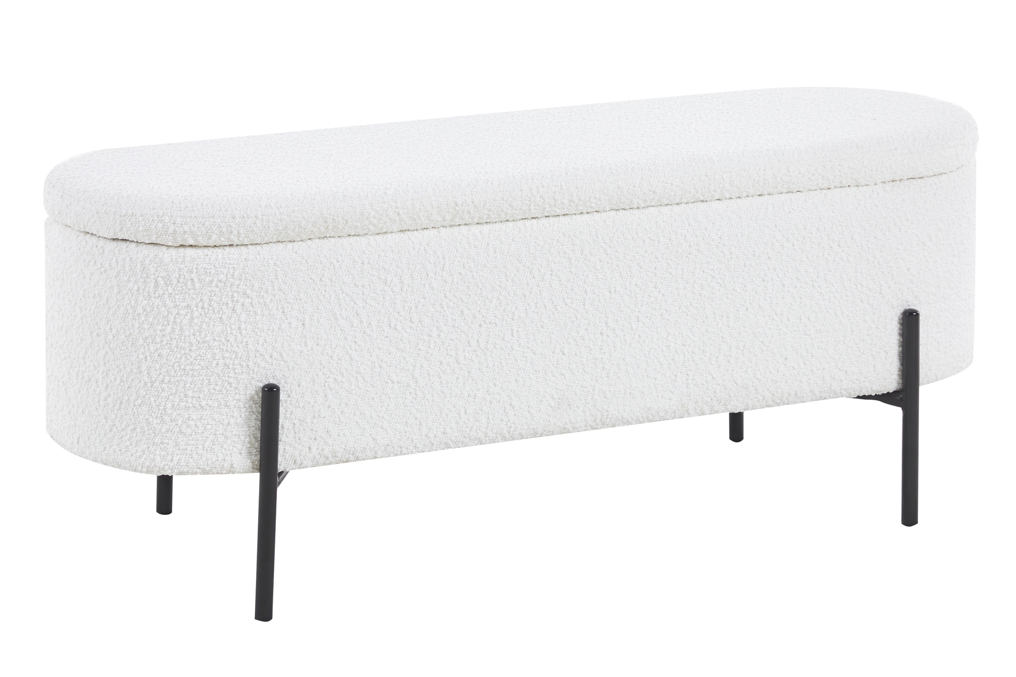 Si vous cherchez un meuble au design scandinave ultra pratique, ce bout de lit dans un tissu bouclette tendance est fait pour vous ! Ce pouf rembourré marque des points par son design ultra moderne, mais aussi par le couvercle rabattable et l’espace de rangement astucieux. Couvertures, linge de lit ou vêtements : vous pourrez faire régner l’ordre de façon stylée et ranger tout ce qui traîne dans la chambre à l’intérieur de ce coffre de lit. Le tissu bouclette, qui a fait depuis longtemps son apparition dans nos salons et salles à manger, exhale chaleur et convivialité pour une ambiance cosy. De plus, le tissu, dans son aspect laineux, incarne parfaitement l’essence du style scandinave à la popularité inégalée. Le piètement design à pieds hauts est fabriqué en métal noir finition époxy et apporte la touche finale à l’ensemble.