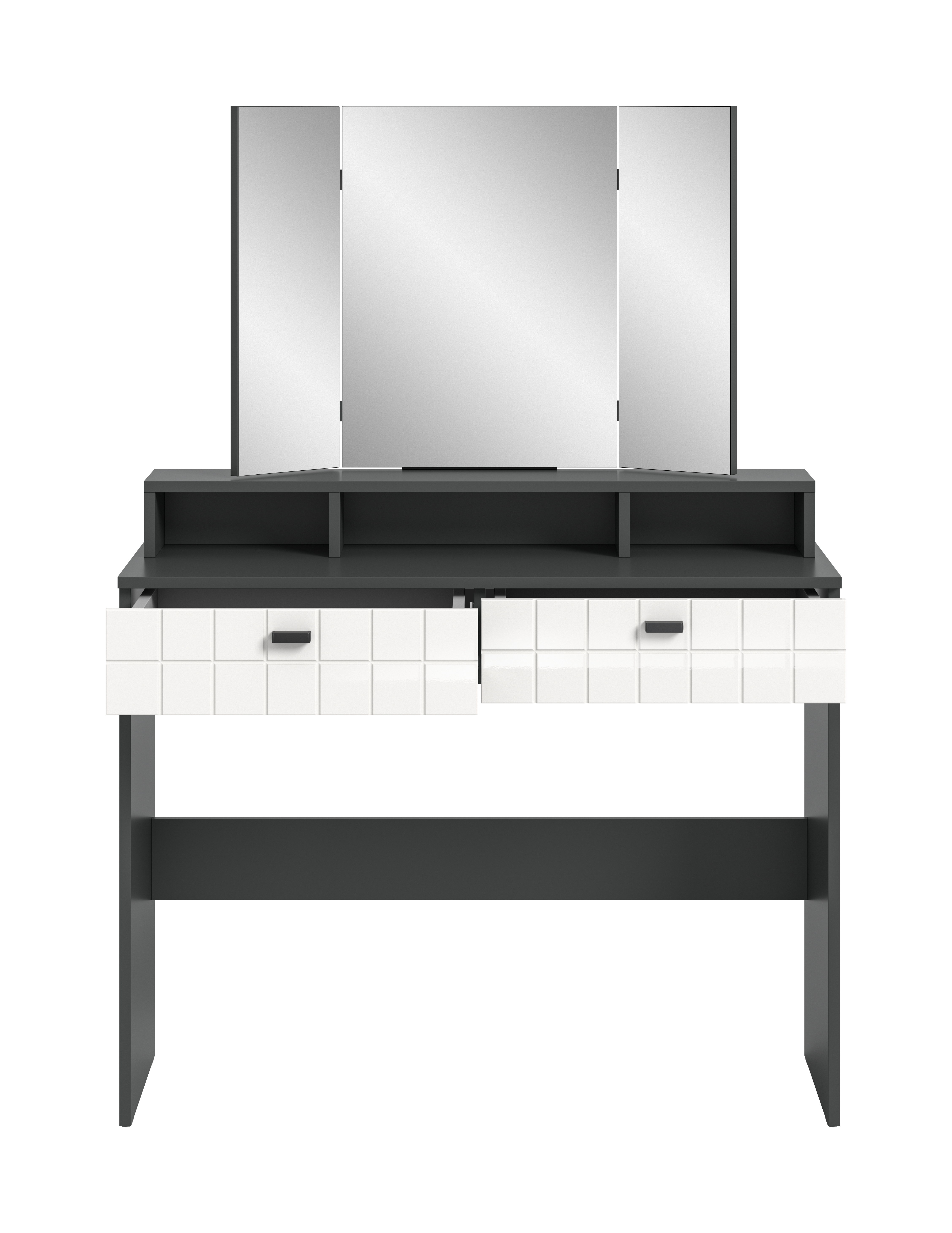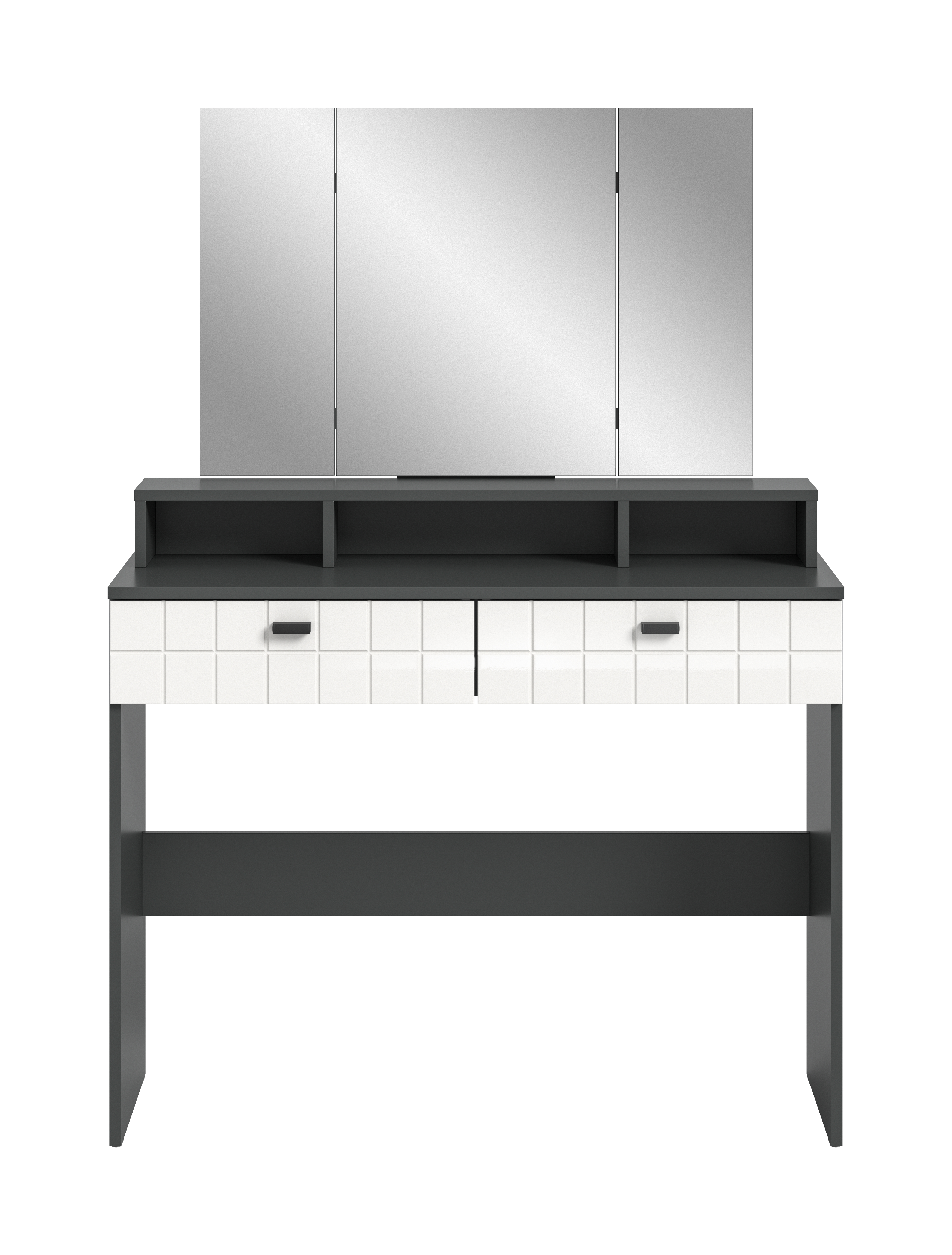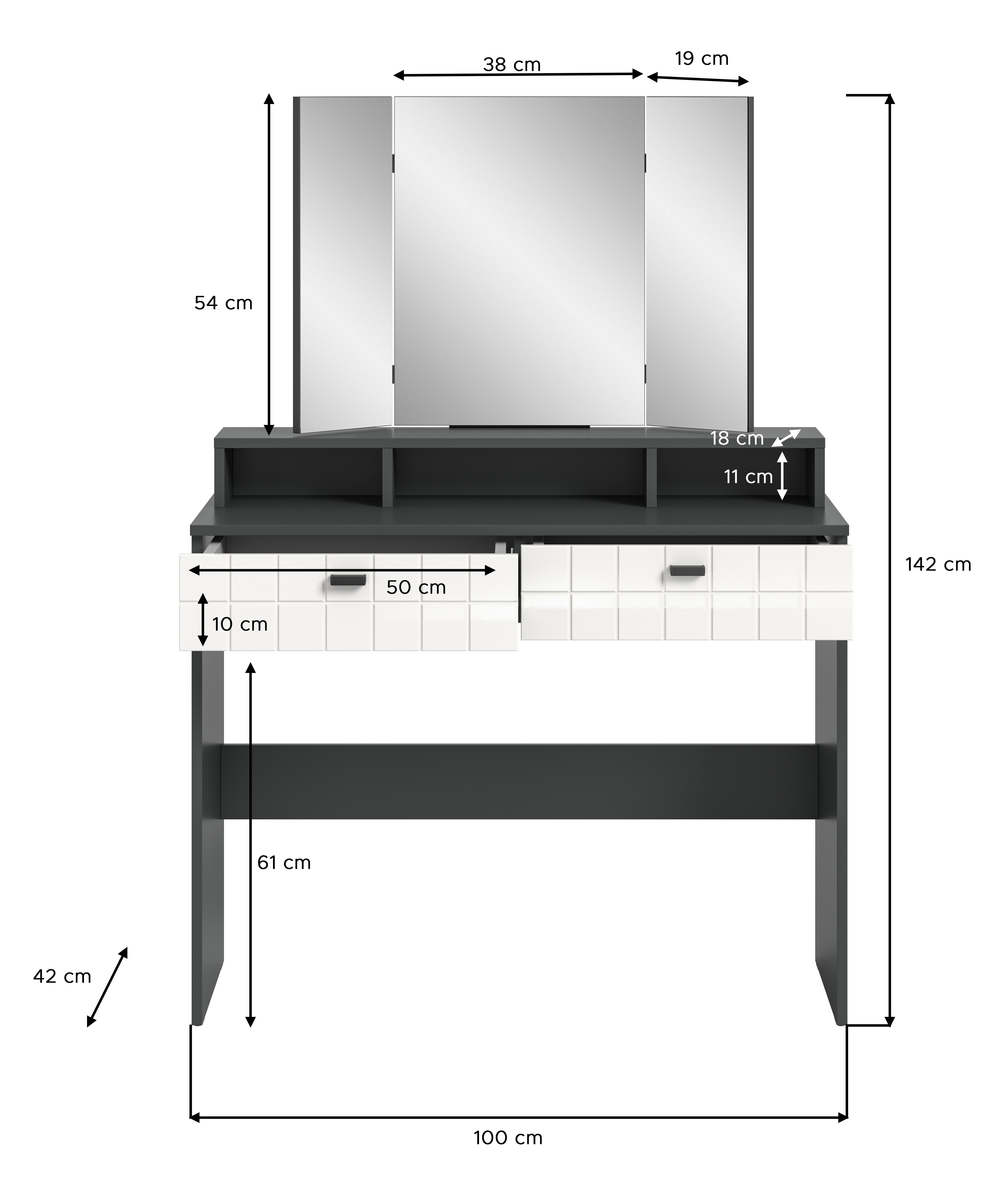 • Design/style : la coiffeuse décor anthracite et ton blanc ultra brillant séduit par son design moderne et élégant. Le grand miroir à abattants assure une visibilité optimale.