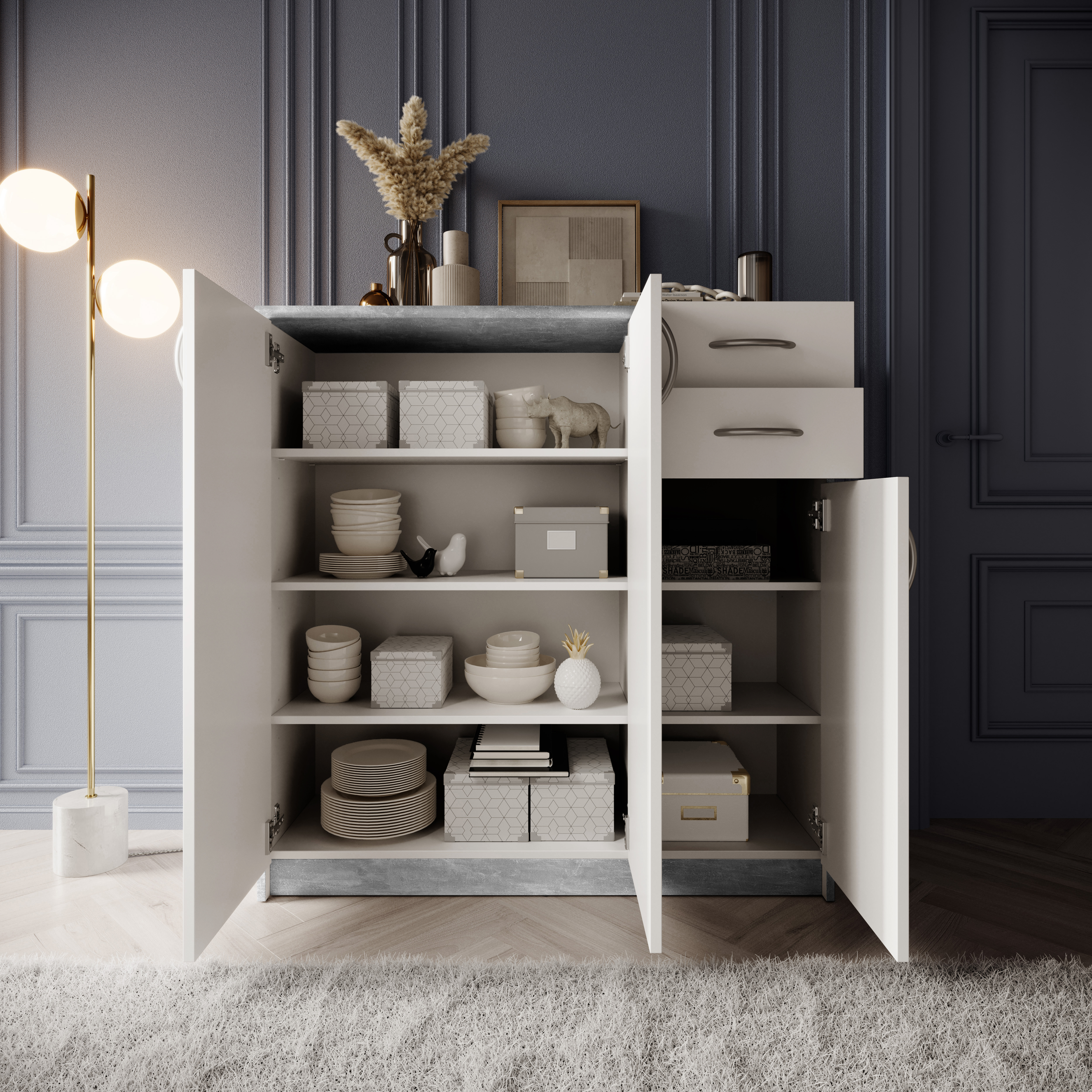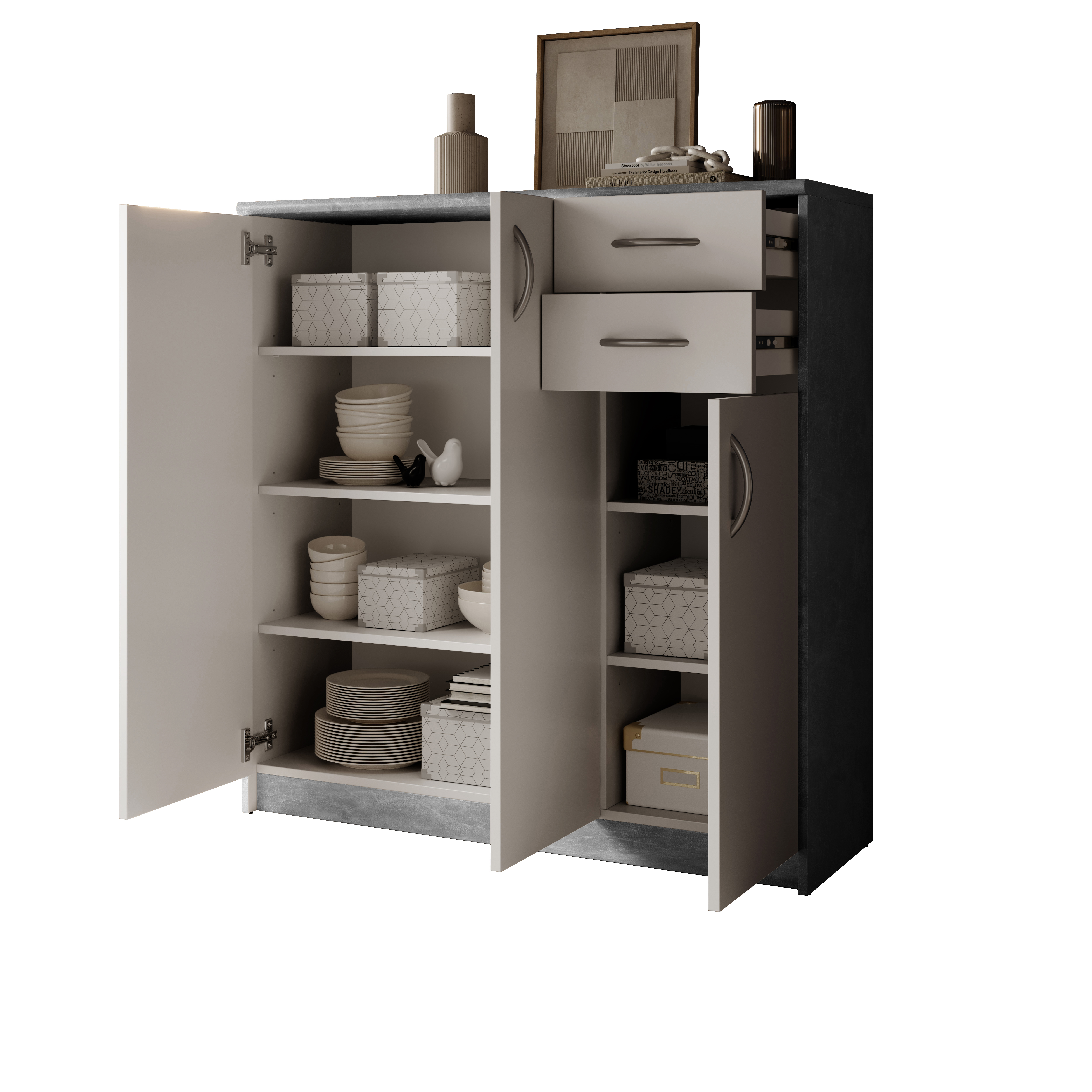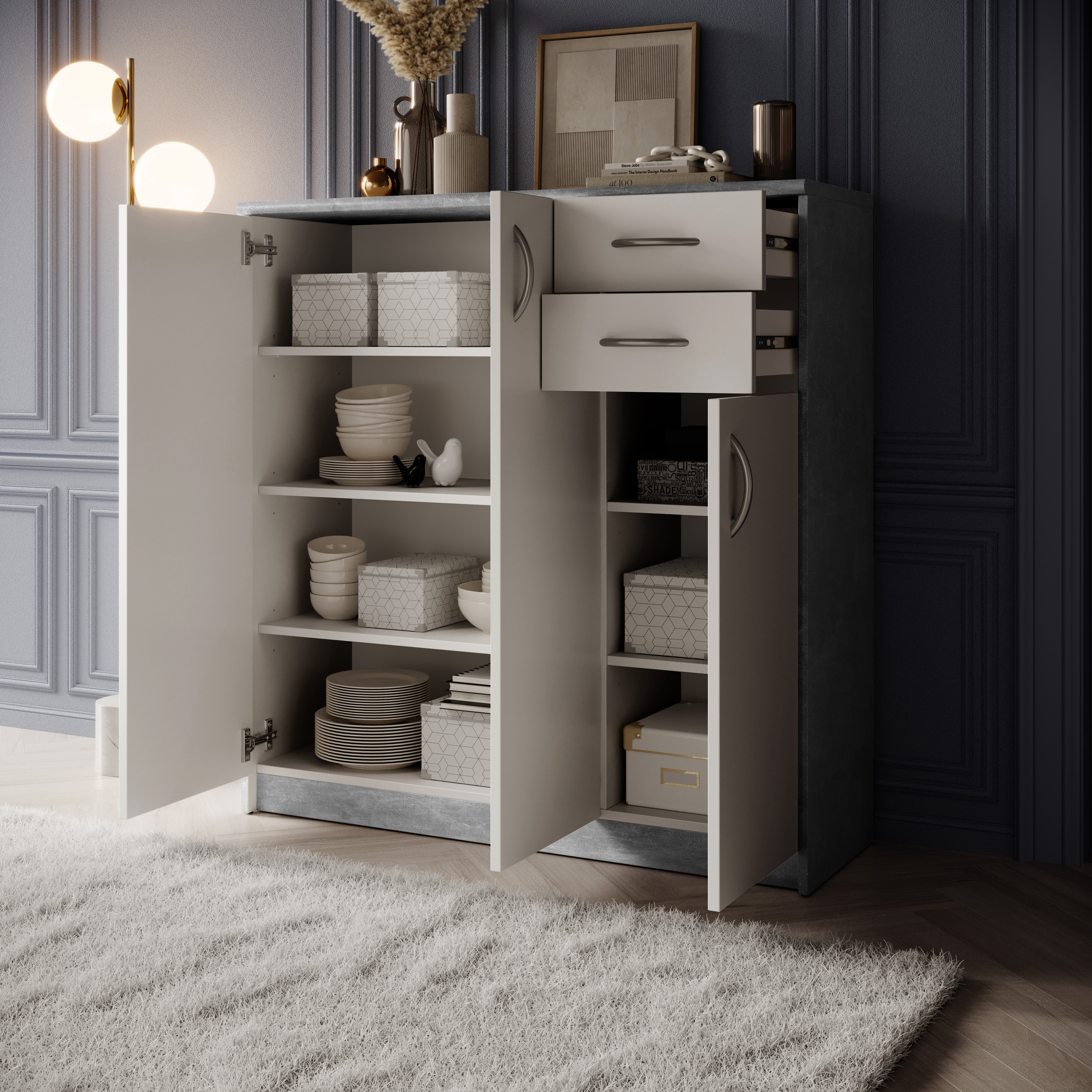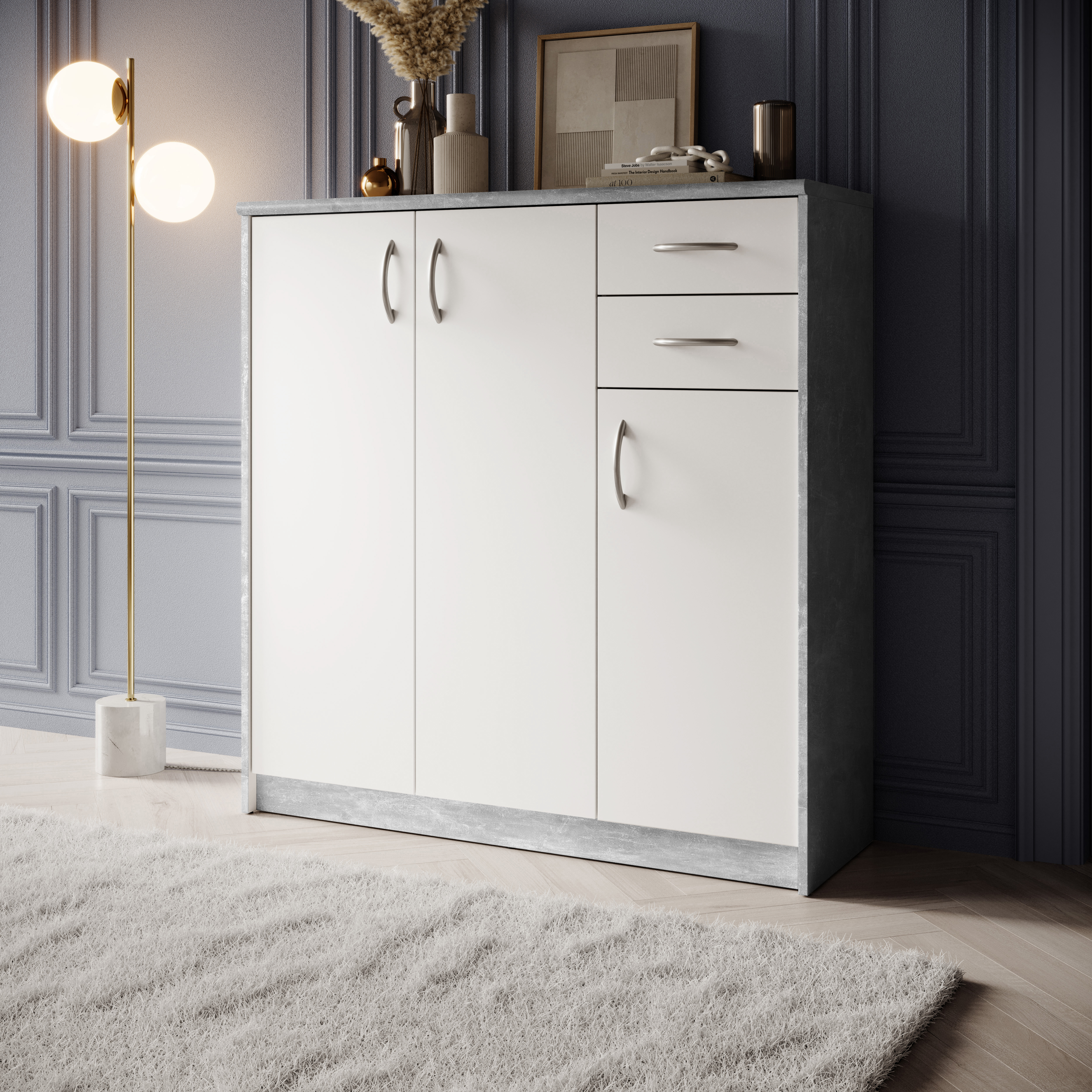 Avec trois portes, des étagères réglables et deux tiroirs, elle offre beaucoup d’espace de rangement tout en conservant une largeur réduite, ce qui permet de l’intégrer facilement même dans de petites pièces. Les surfaces en panneaux bois blanc sont faciles à entretenir et robustes, tandis que les poignées argentées apportent une touche discrète. Livrée démontée, la commode se monte facilement avec un peu d’habileté. Grâce à son design intemporel, elle peut être combinée de manière polyvalente avec d’autres meubles.