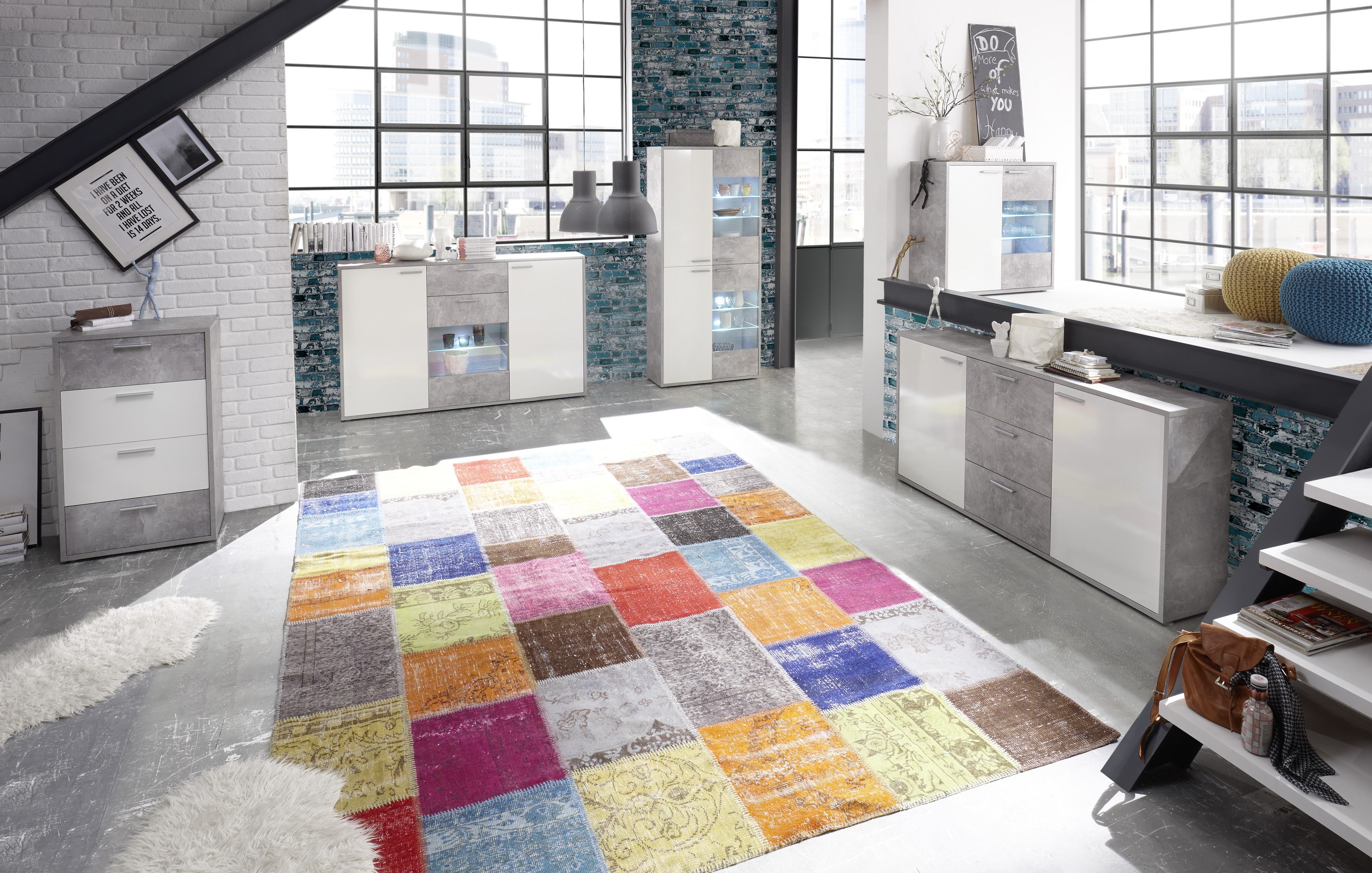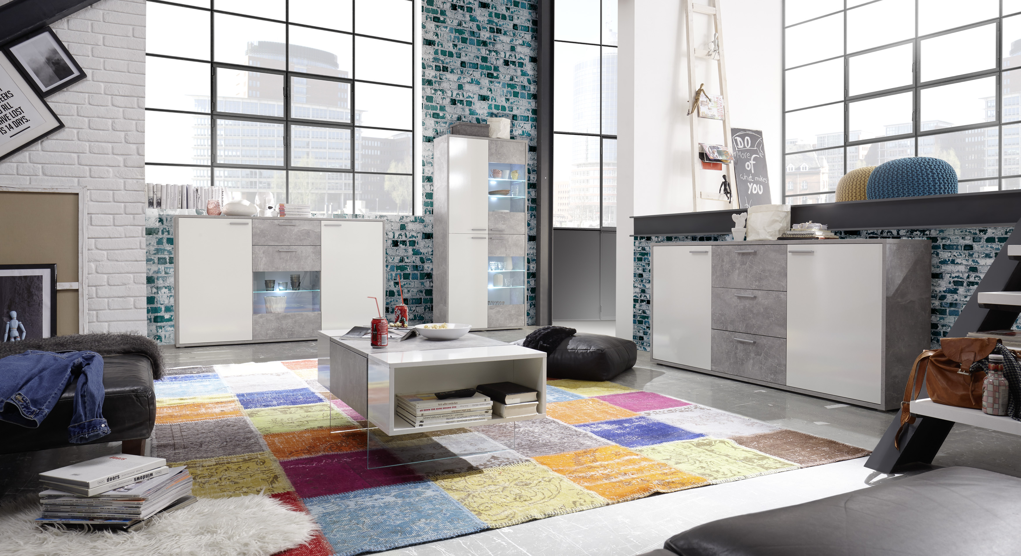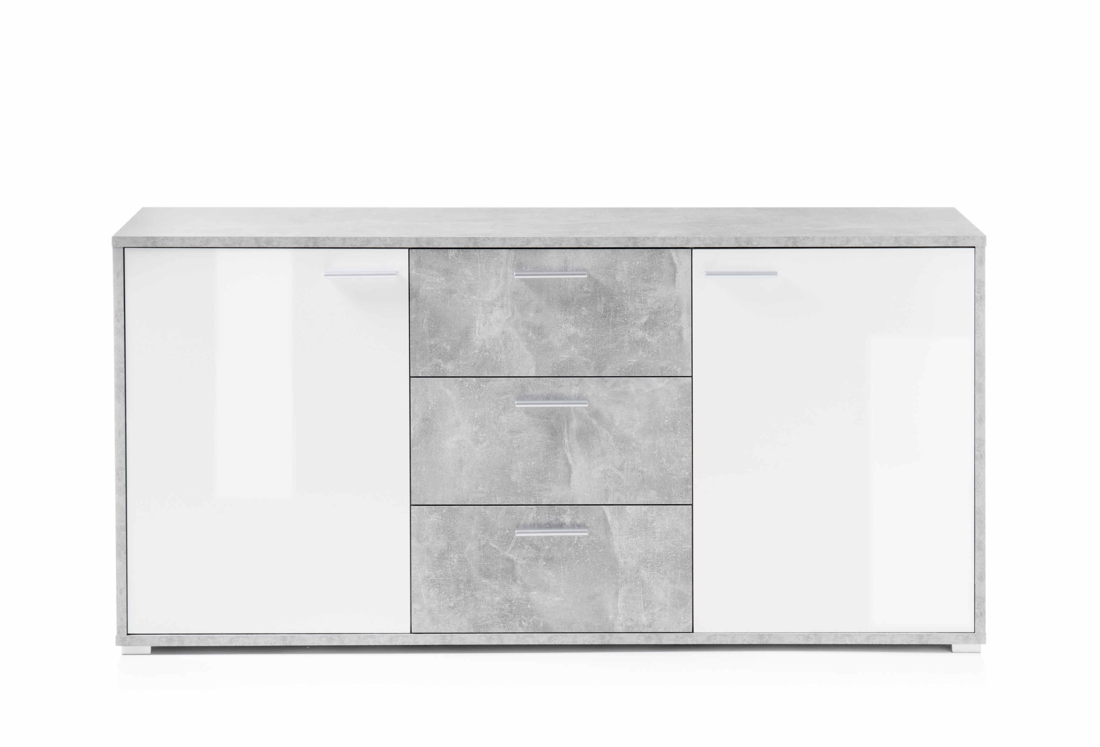 Cette commode moderne allie un look béton urbain à une finition brillante élégante. Le corps et les inserts décoratifs en aspect béton apportent une touche tendance, tandis que la façade en blanc brillant éclatant confère à l'ensemble un aspect épuré et élégant. Les poignées tiges argentées complètent le design et apportent une touche moderne à la commode. Derrière ses tiroirs spacieux, elle offre beaucoup d'espace pour ranger vêtements, accessoires de décoration ou objets du quotidien – à la fois pratique, ordonnée et décorative.