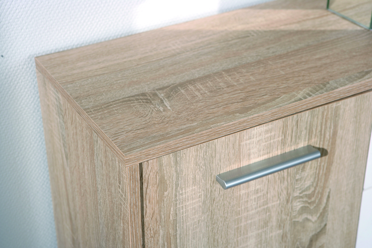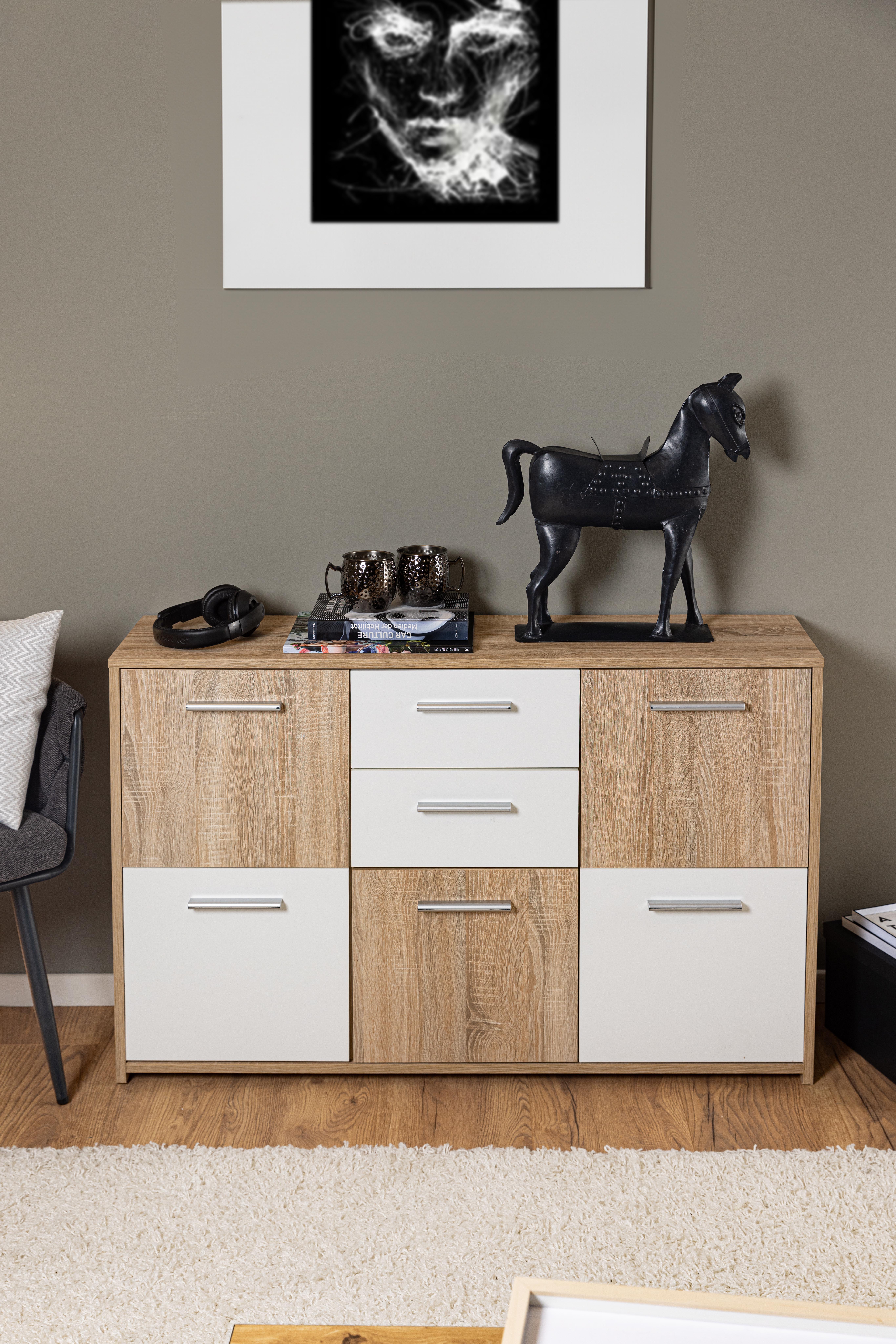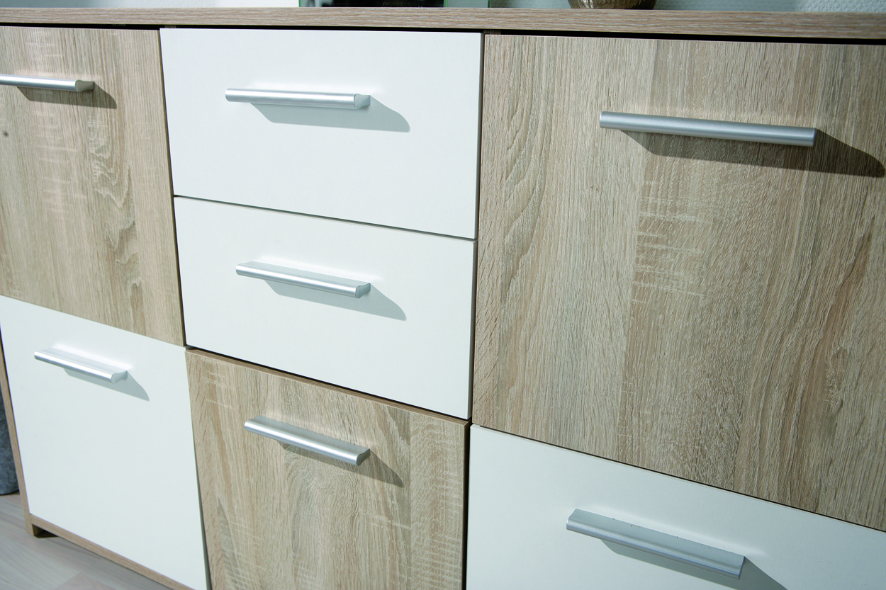 La surface associe les coloris tendance décor chêne Sonoma et blanc, conférant au meuble une allure à la fois moderne et chaleureuse. Grâce à son revêtement mélaminé, le bahut est résistant aux rayures et à l’abrasion, ce qui la rend particulièrement facile d’entretien.