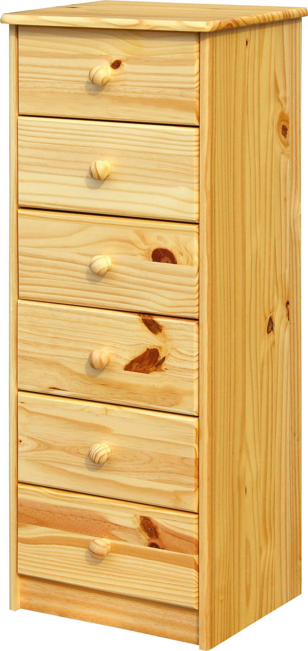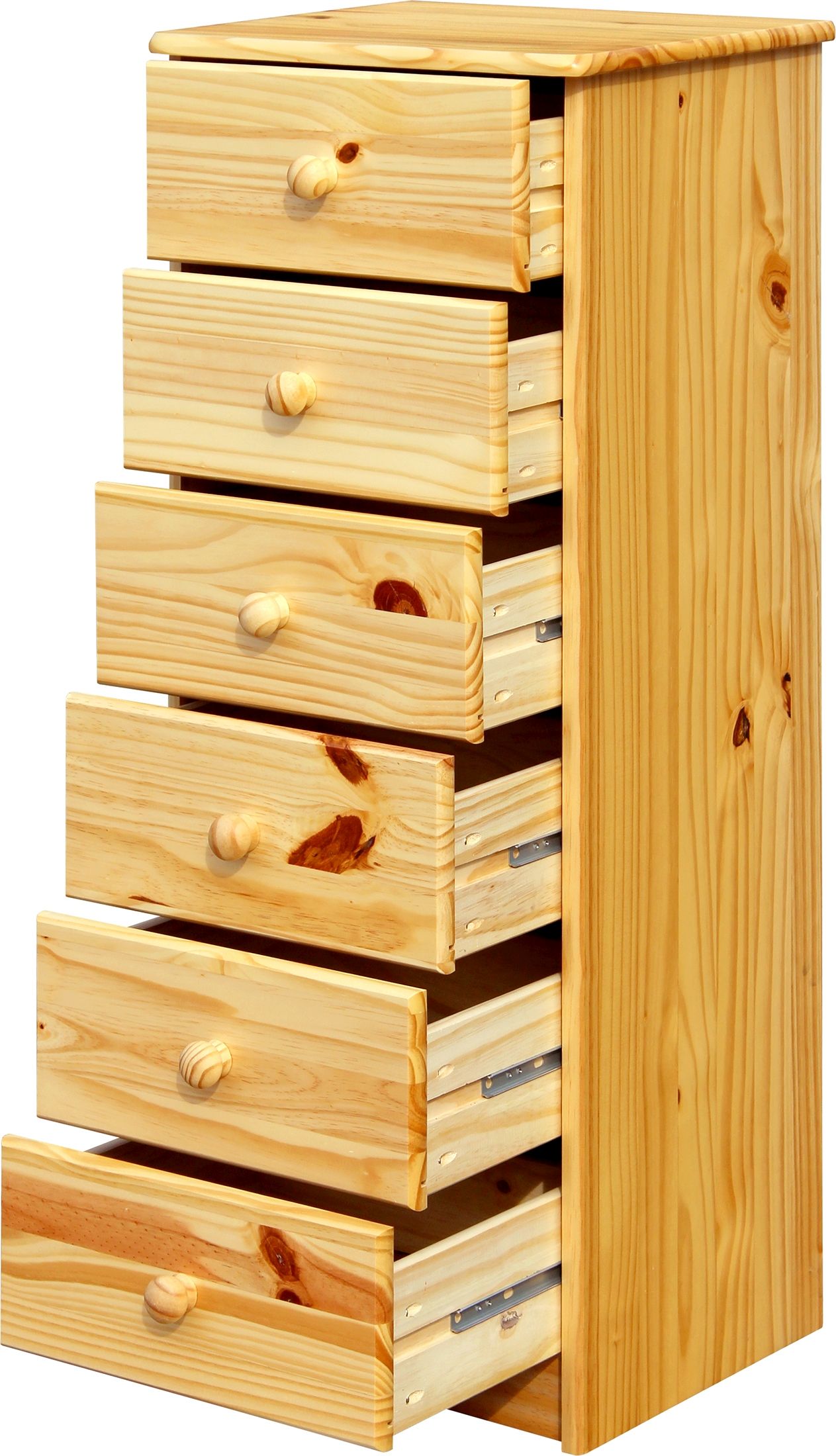 Cette commode robuste et de qualité est fabriquée en bois de pin massif ; les surfaces sont laquées pour la protéger. Les 6 tiroirs avec rails métalliques offrent un bel espace de rangement et de la place pour stocker différents objets. Il s'agit d'un meuble pratique qui n'est pas seulement facile d'entretien, mais aussi ultra polyvalent : il est donc idéal, par exemple, pour une chambre d'étudiant ou dans de petites piècest.