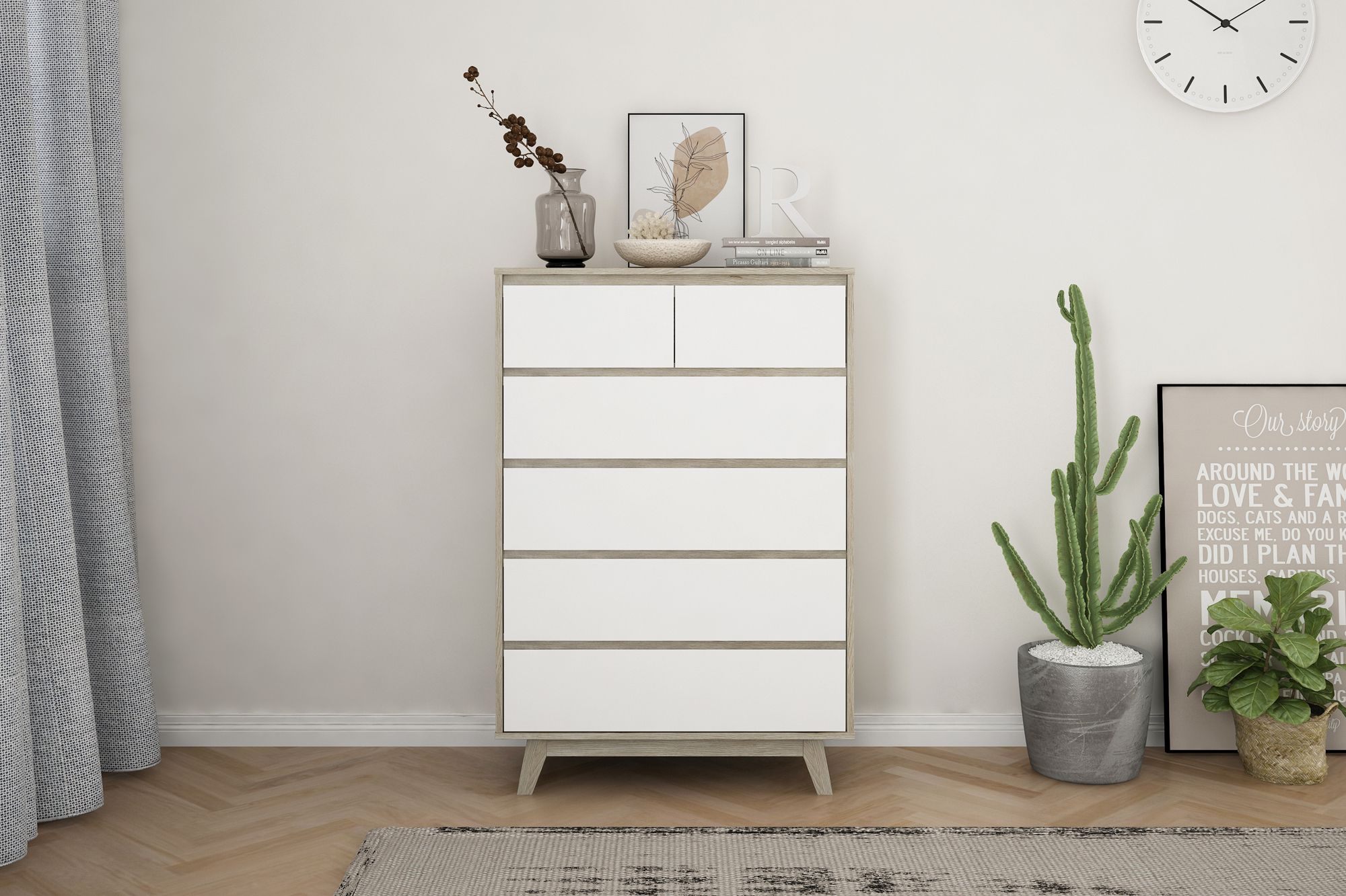 La commode intemporelle dans un look scandinave ultra chic est proposée dans une combinaison de couleurs ton naturel et ton blanc qui se combine à merveille avec différents styles grâce à sa neutralité. Quatre grands et deux petits tiroirs offrent un bel espace de rangement fermé pour vos affaires. La commode peut s'utiliser de différentes façons dans tout type de pièces. Elle est pratique et fonctionnelle dans le salon, la salle à manger et la chambre qu'elle met joliment en valeur. Les portes sans poignées apportent la touche finale à l'ensemble.