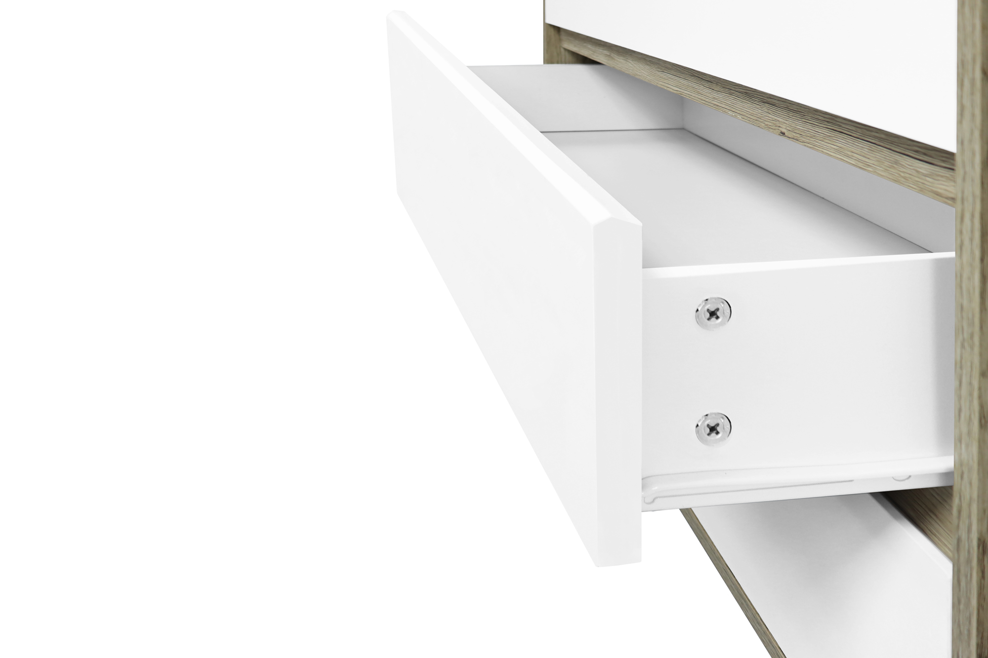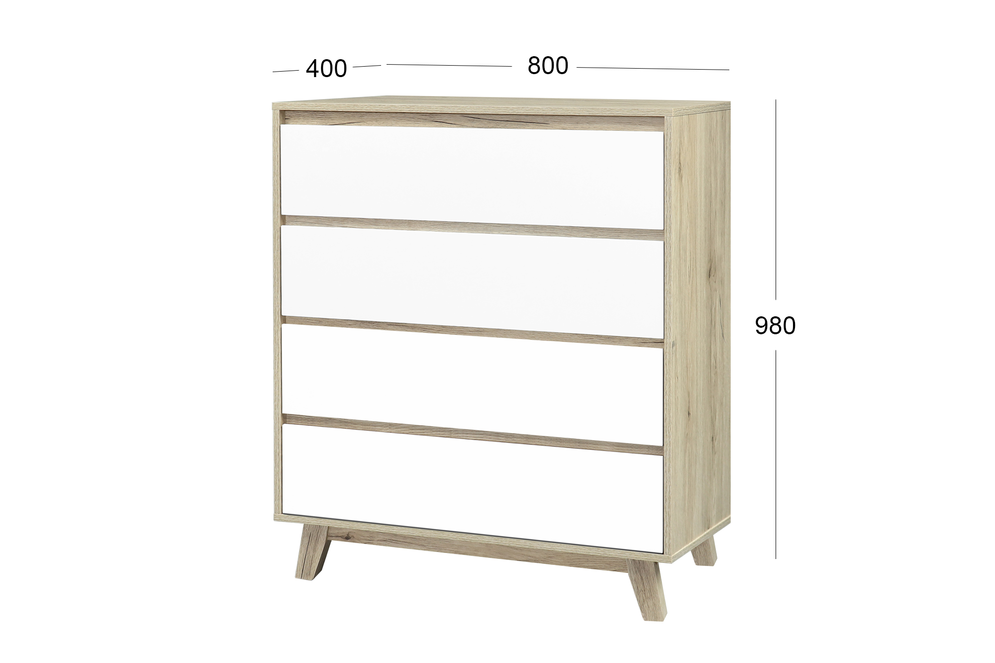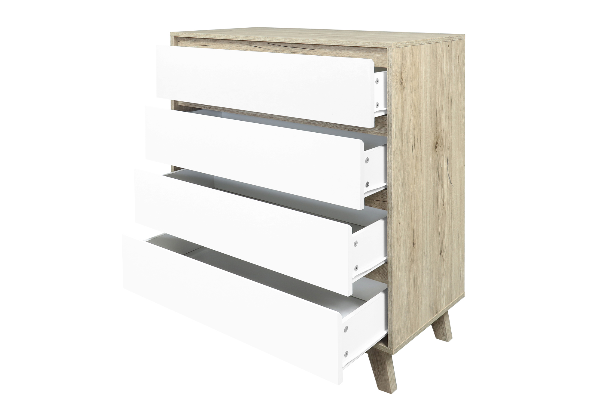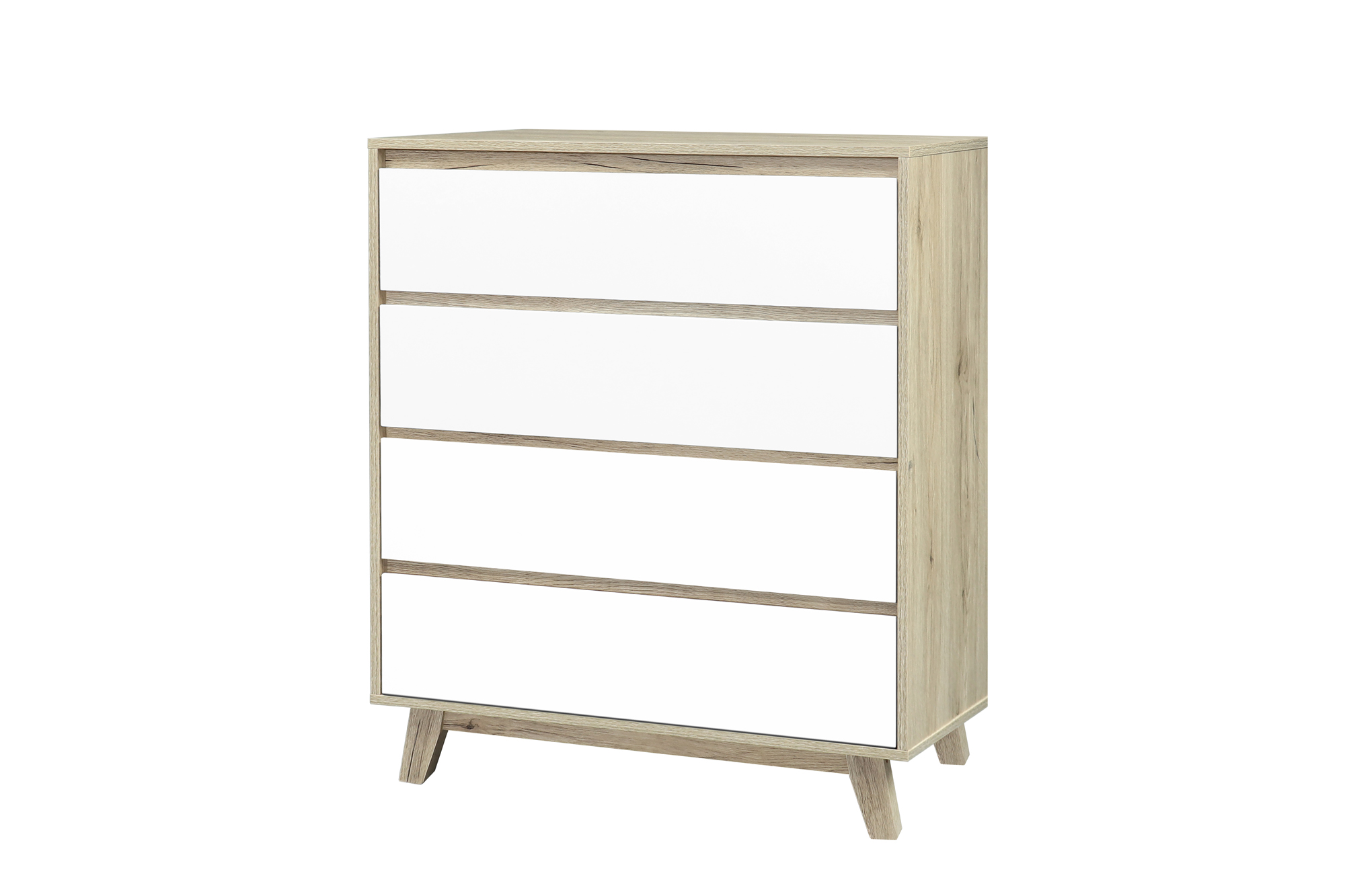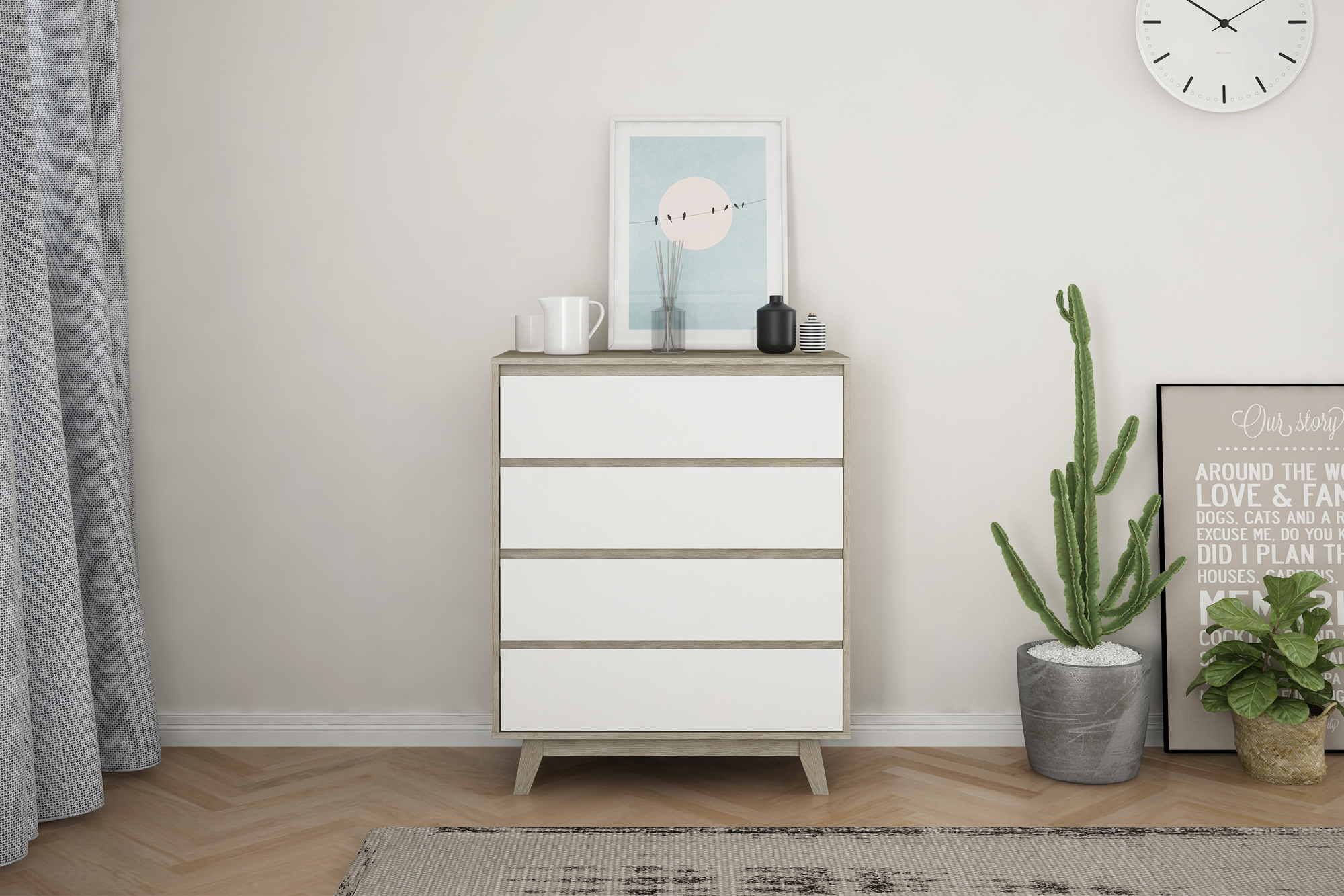 La commode intemporelle dans un look scandinave ultra chic est proposée dans une combinaison de couleurs ton naturel et ton blanc qui se combine à merveille avec différents styles grâce à sa neutralité. Quatre tiroirs offrent un bel espace de rangement fermé pour vos affaires. La commode peut s'utiliser de différentes façons dans tout type de pièce. Elle est pratique et fonctionnelle dans le salon, la salle à manger et la chambre qu'elle met joliment en valeur. Les portes sans poignées apportent la touche finale à l'ensemble.