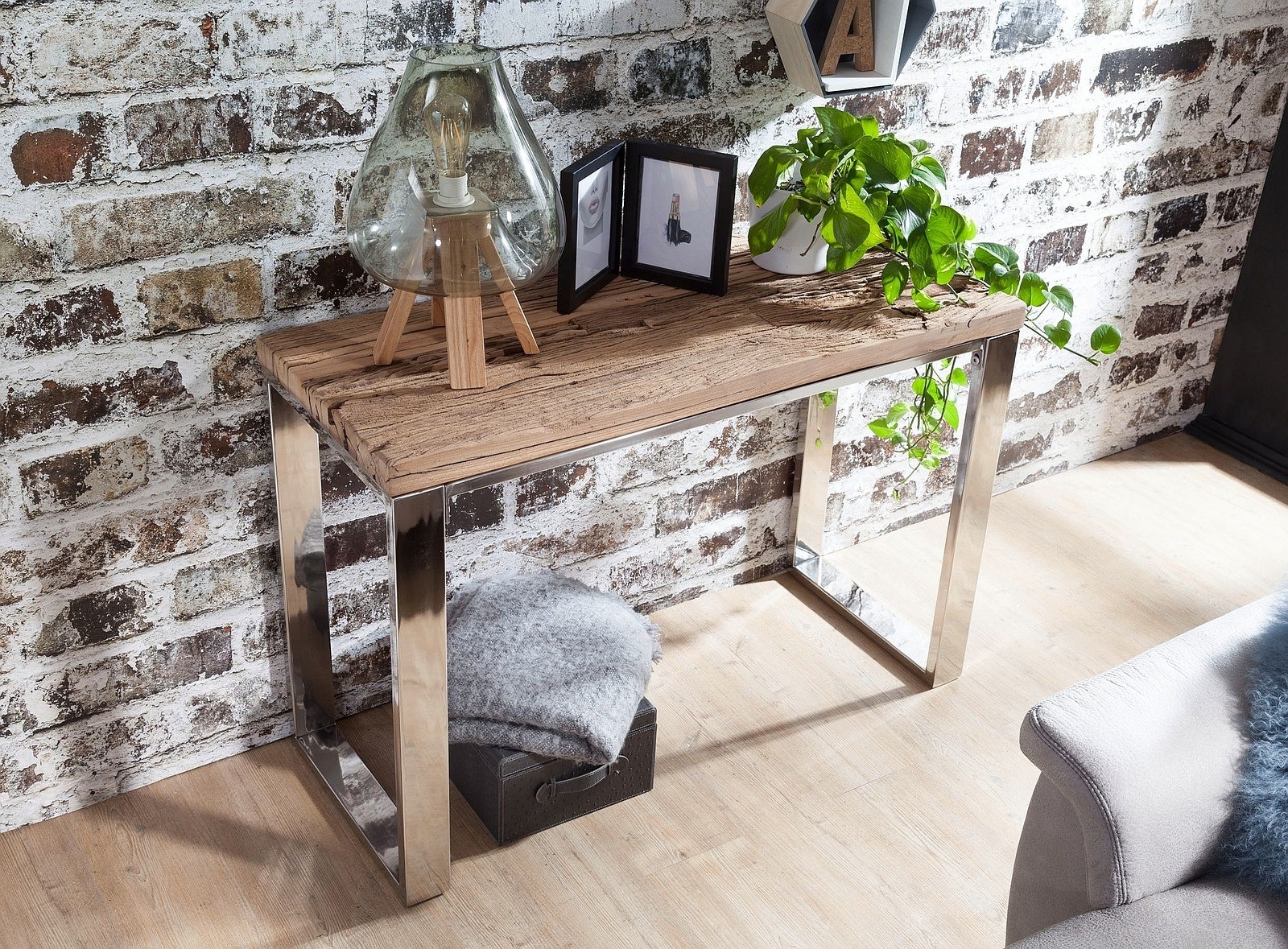- POUR L'AMOUR DE LA NATURE ✔ Le mélange de matériaux habilement combinés (bois laissé à l'état naturel et pieds métalliques chromés) apportera un vent frais dans votre salon. Le veinage original et la surface non traitée du plateau est un vrai régal pour les yeux. Avec notre console PRIYA vous pourrez ressentir la richesse de la nature.