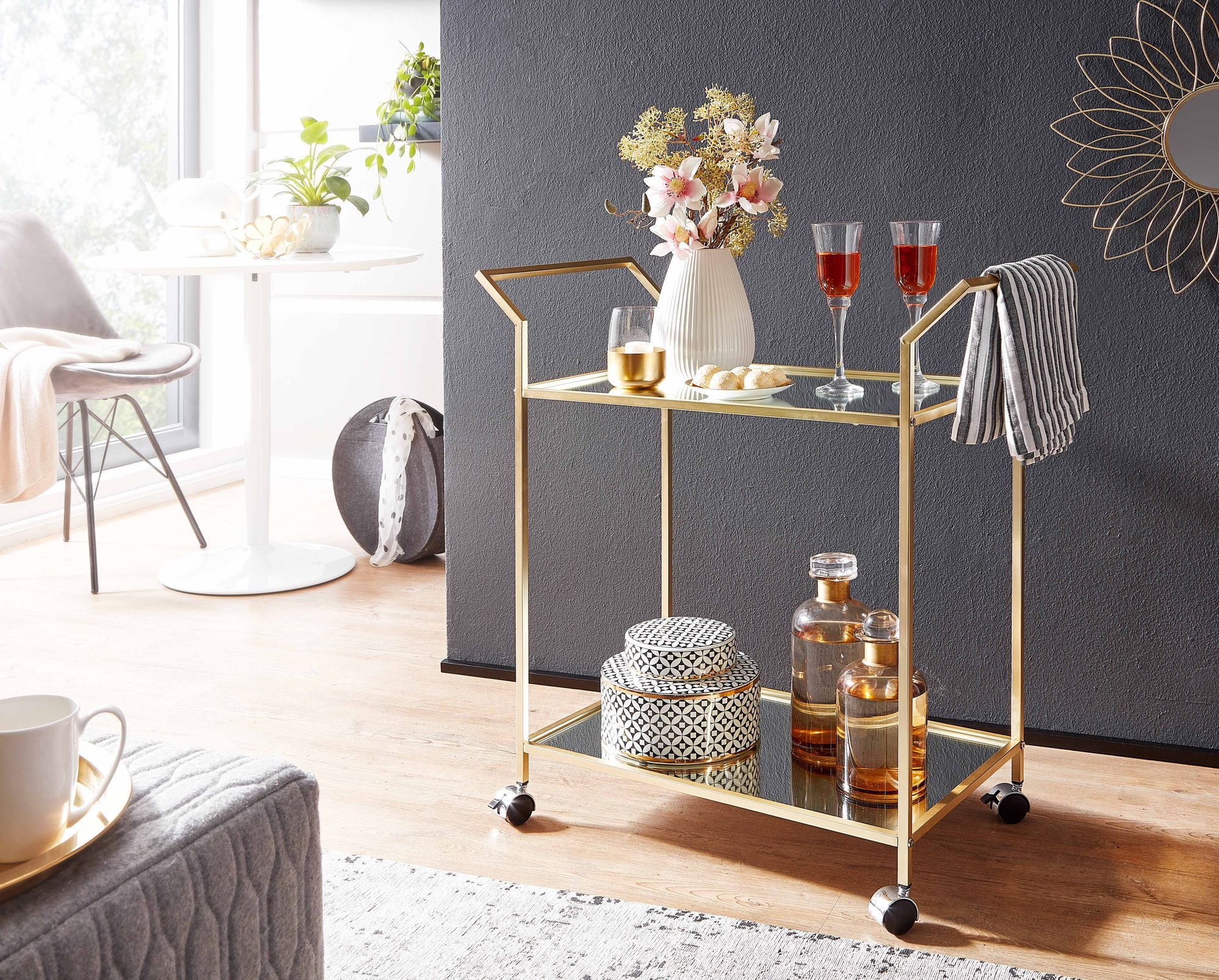 COMPOSITION ✔ La structure de la desserte à roulettes est en acier laqué ton doré. Les deux plateaux sont en verre miroir.