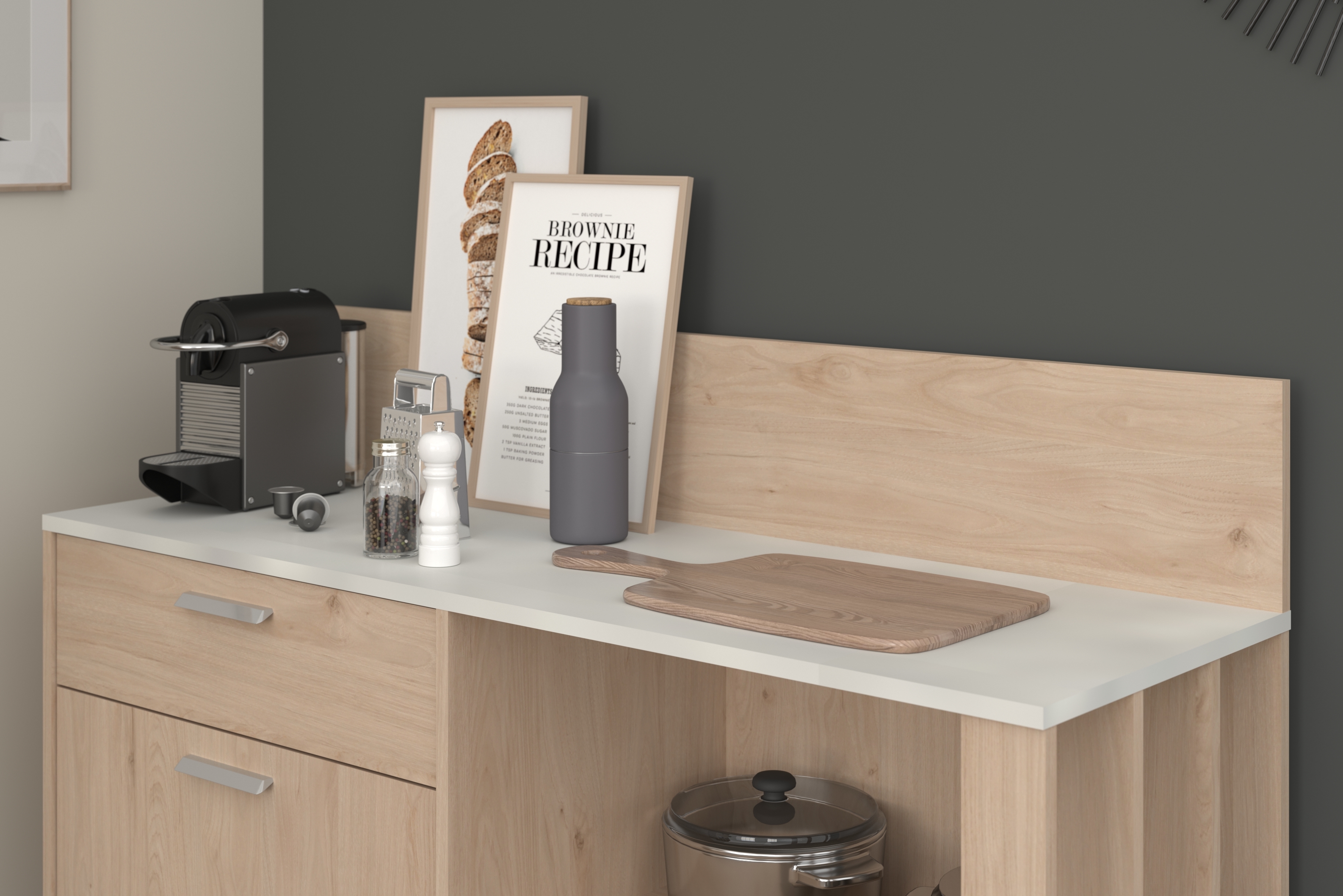 À gauche : 1 tiroir avec, en dessous, 1 porte et, derrière elle, 2 casiers