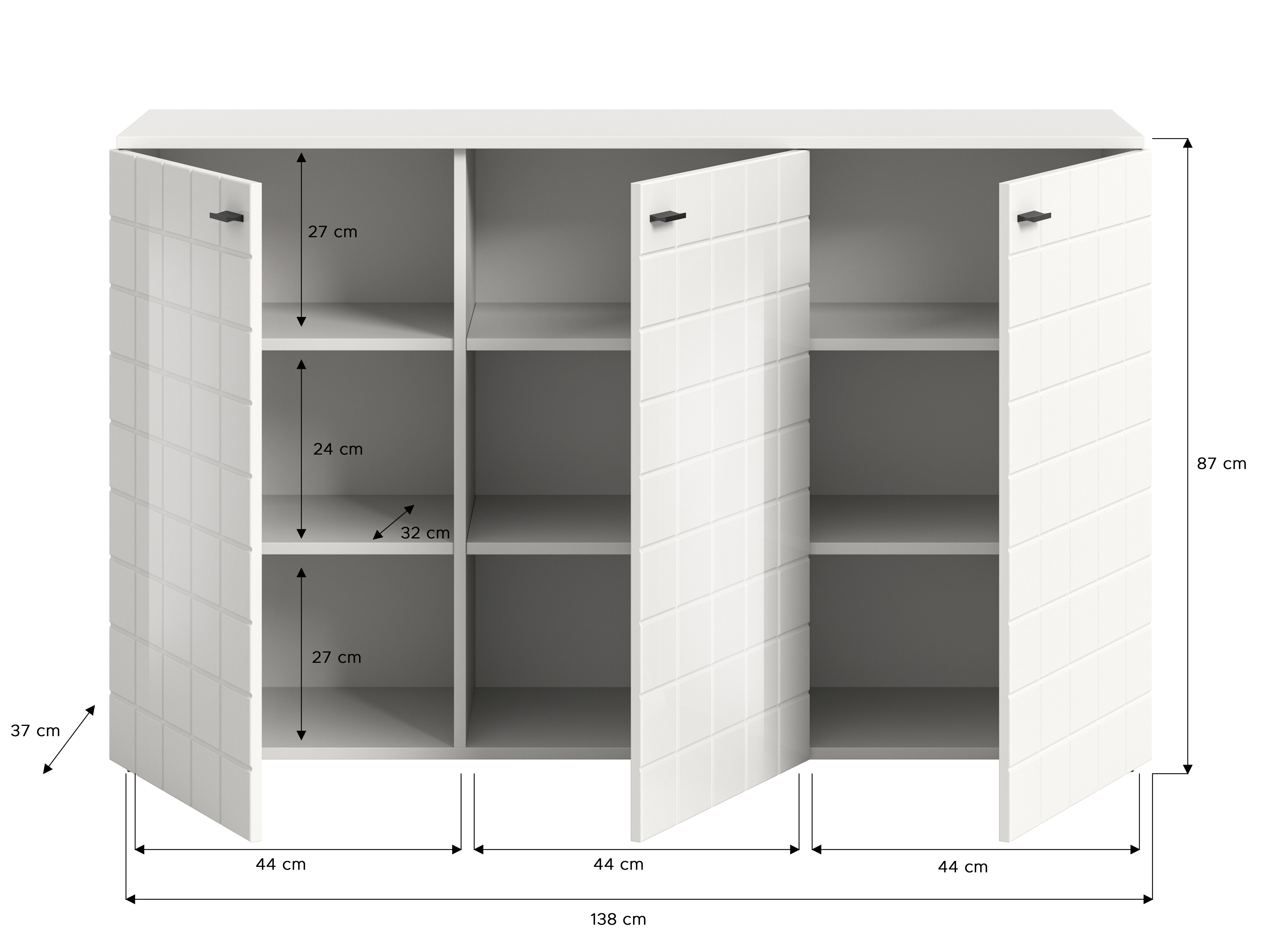 Une enfilade aux dimensions 138x86x37 cm dans une finition ton blanc ultra brillant et décor blanc est un meuble élégant et moderne pour votre intérieur. Sa taille offre un espace de rangement suffisant. L’association du MDF ton blanc ultra brillant et du décor blanc confère à l'enfilade une apparence claire et moderne qui s'intègre parfaitement dans différents styles d'intérieurs. L'effet ultra brillant ajoute une touche d'élégance tandis que le décor blanc souligne le design épuré et contemporain.