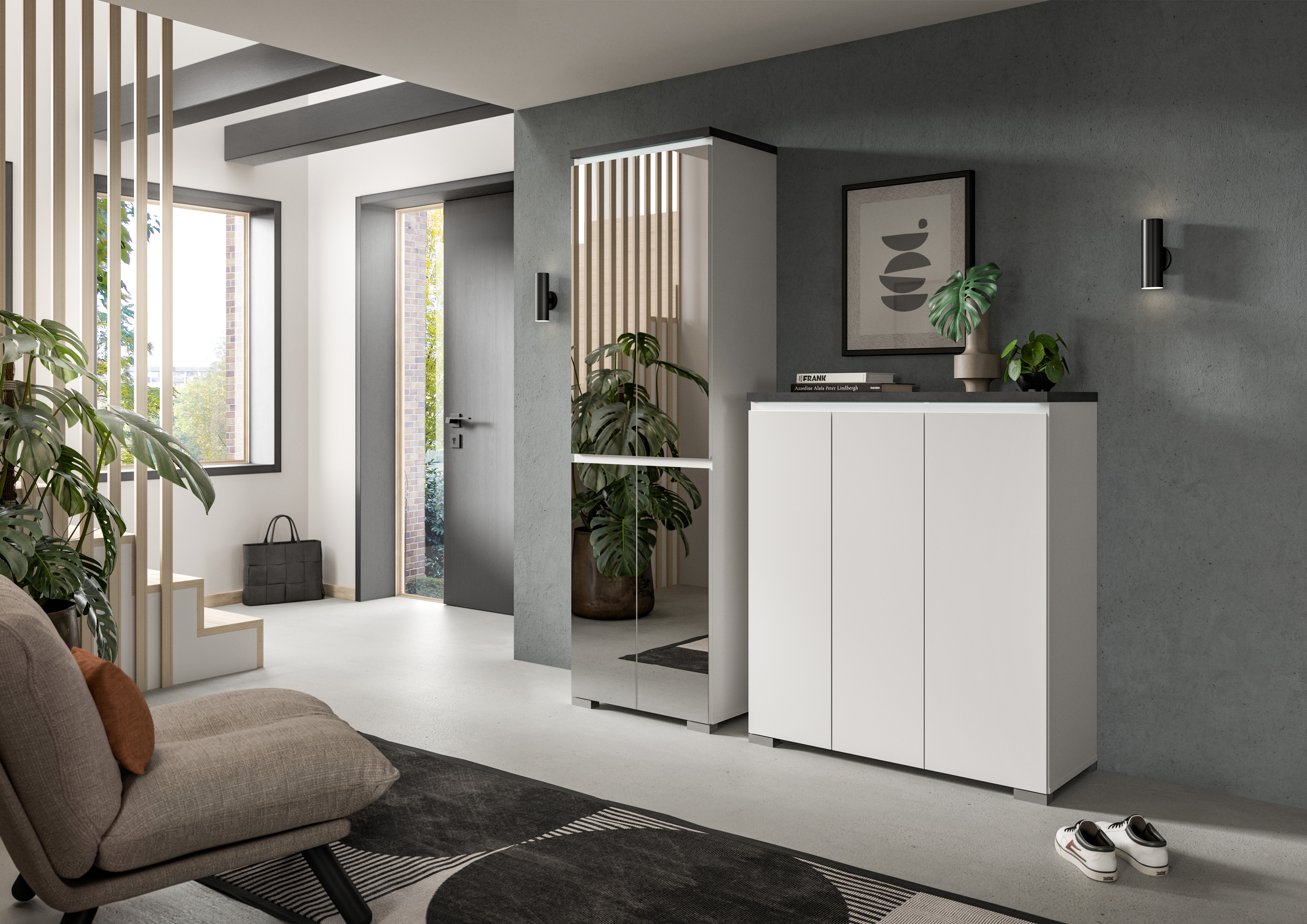 Comprenant une armoire avec miroir et un bahut dans un décor ton blanc et gris, cet ensemble de meubles à chaussures est la solution idéale pour combiner ordre et style dans votre entrée.