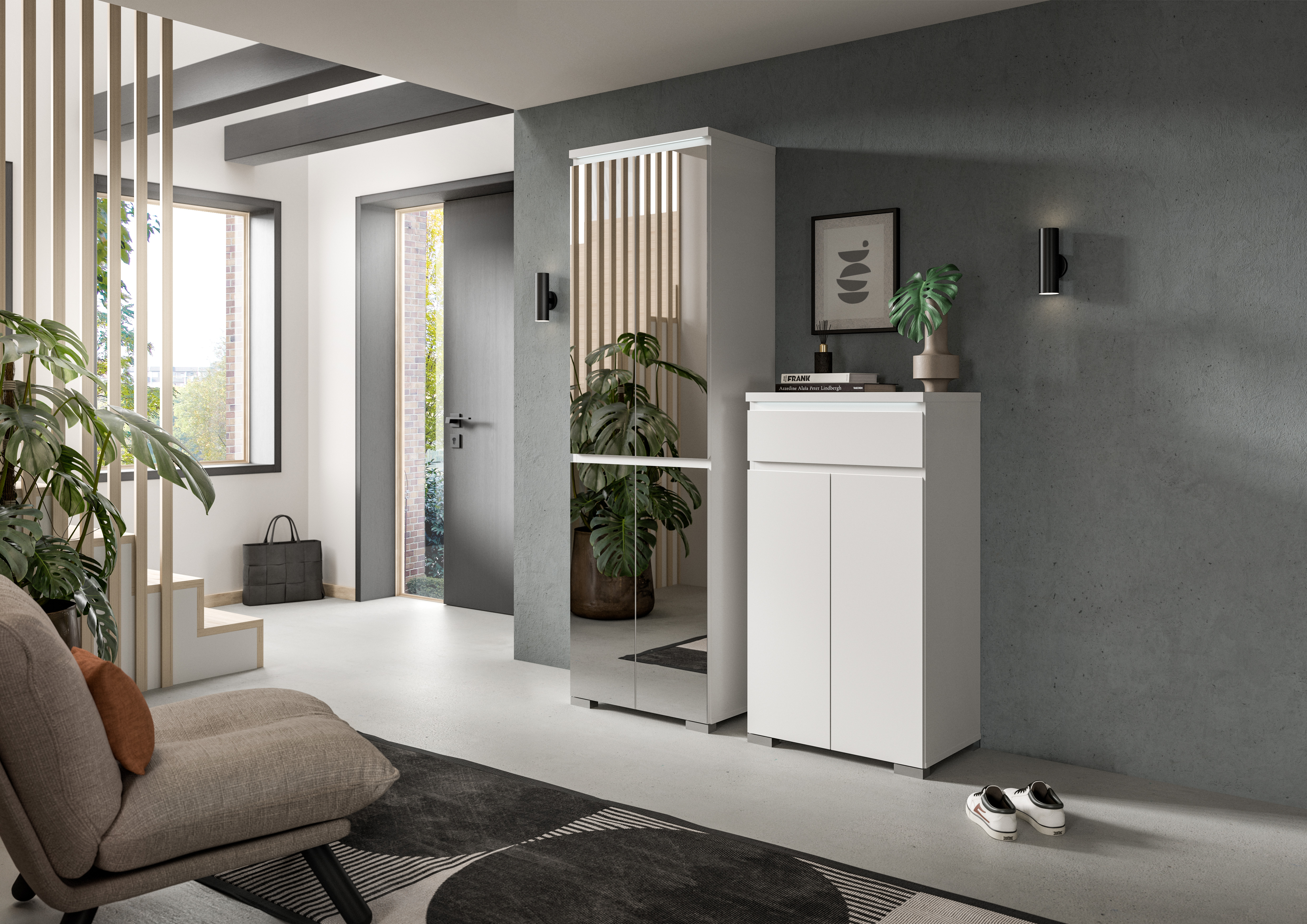 - Design/style : l'armoire à chaussures et le bahut sont proposés dans un design sobre et intemporel qui s’intègre harmonieusement dans différents styles d’intérieur et conférera au couloir, à l’entrée ou à la buanderie un aspect ordonné et épuré.