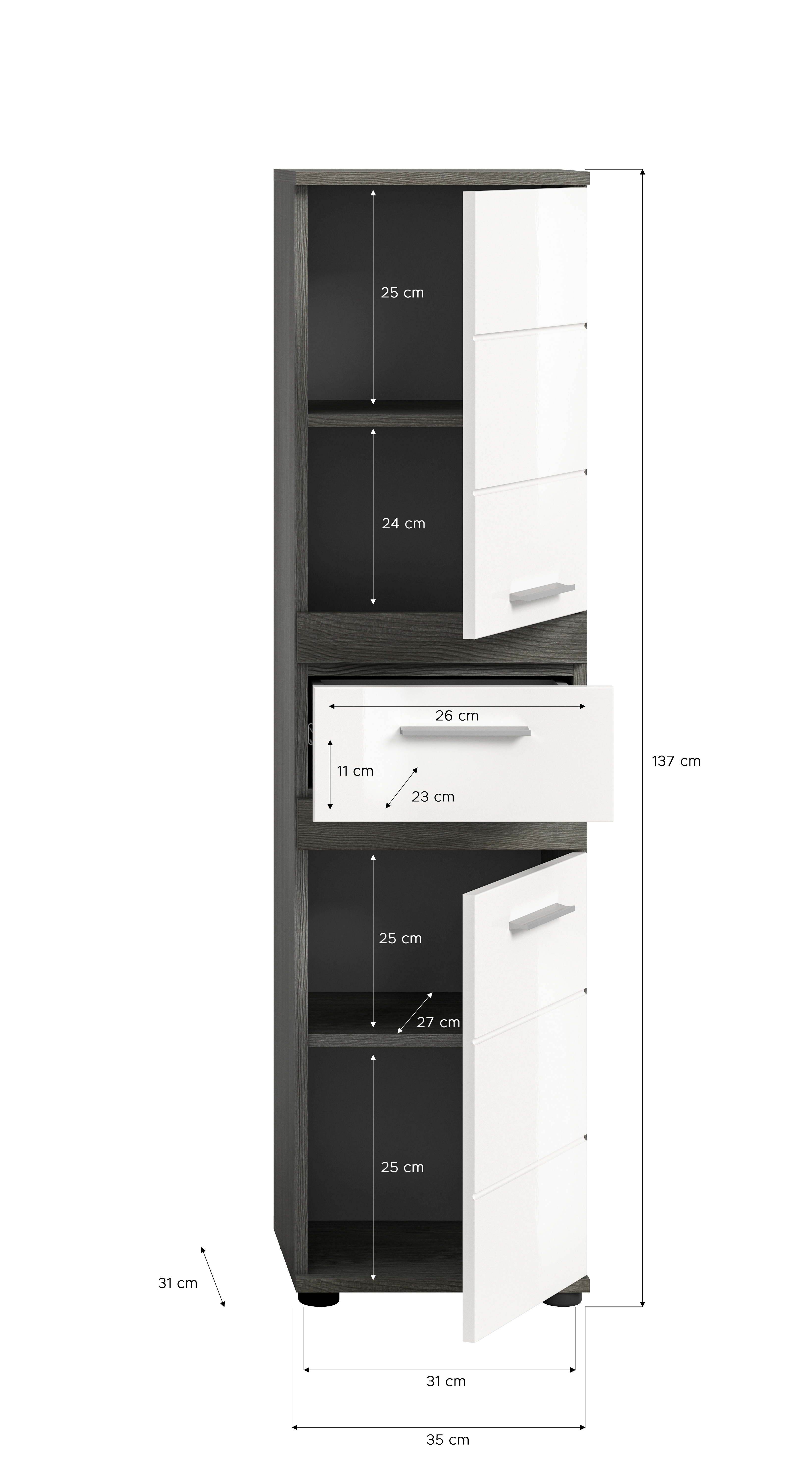 1 meuble demi-colonne avec 2 portes, 1 tiroir et 2 tablettes amovibles