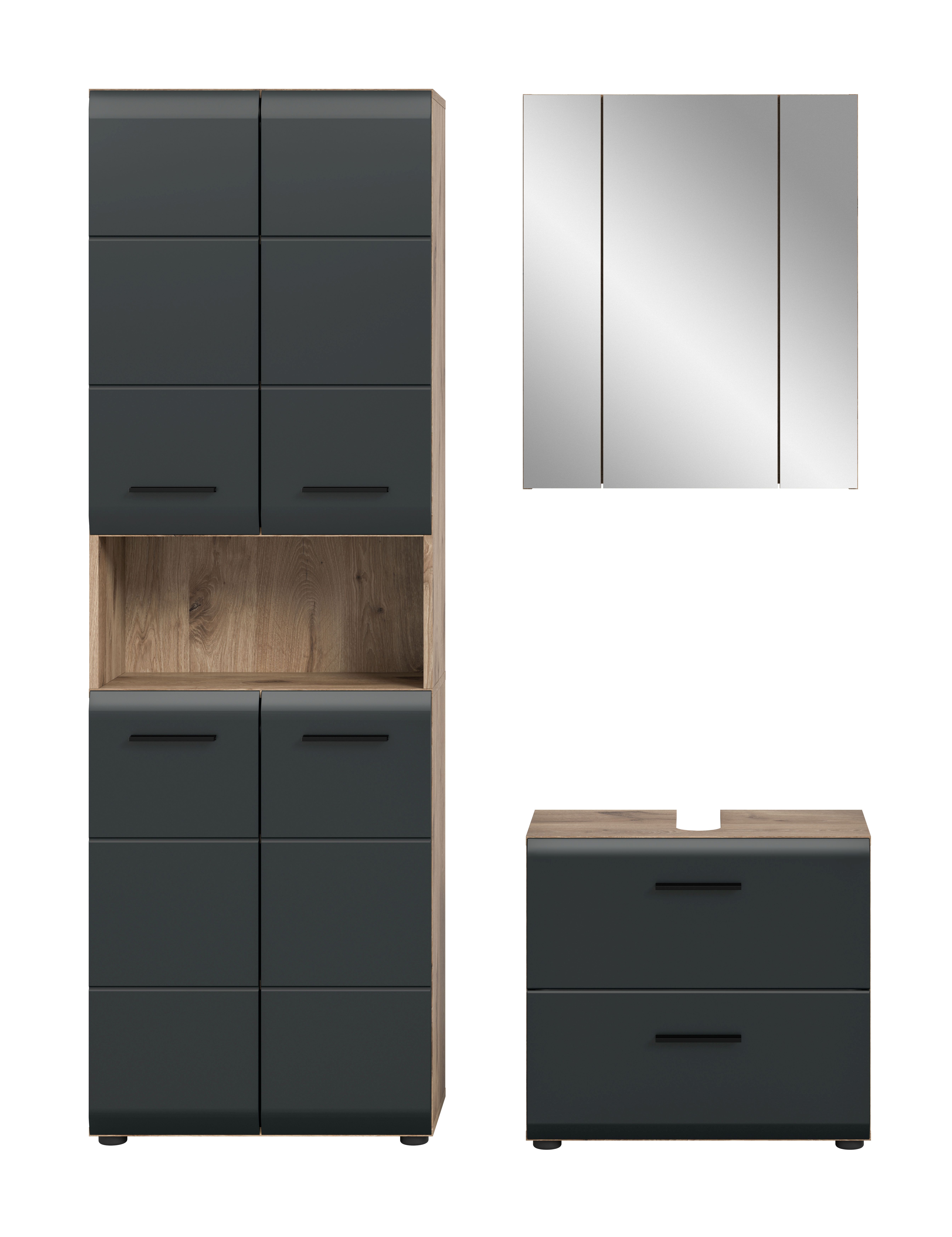 - Fonctionnalité : ensemble constitué d’un meuble sous lavabo, d’une armoire de toilette et d’un meuble colonne pour une solution de rangement complète sur un faible encombrement dans la salle de bains.