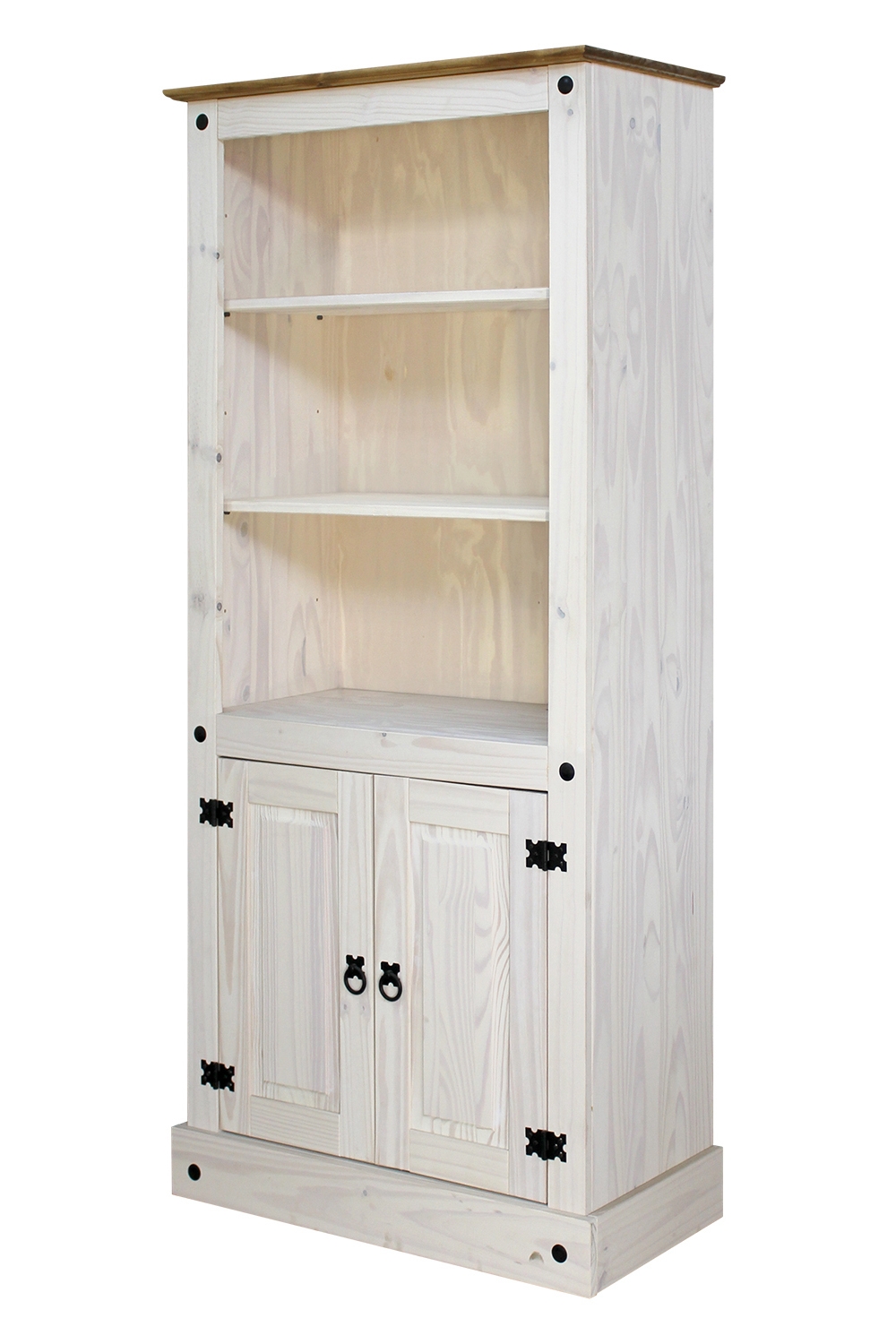 Faites régner l'ordre dans le chaos. La bibliothèque en pin massif aux lignes droites offre beaucoup de place pour ranger vos livres préférés et autres accessoires derrière 2 portes avec tablette de part en part et 3 casiers ouverts. Ce meuble laqué ton blanc dispose d’un charme exceptionnel grâce aux détails en métal et au panneau supérieur ton miel. Cette bibliothèque s’intégrera parfaitement dans le salon pour exhiber vos livres préférés et autres articles décoratifs ; elle sera également du plus bel effet dans le bureau comme étagère polyvalente. Vous pouvez positionner ce meuble stable et indémodable dans toutes les pièces de vie où il attirera tous les regards.