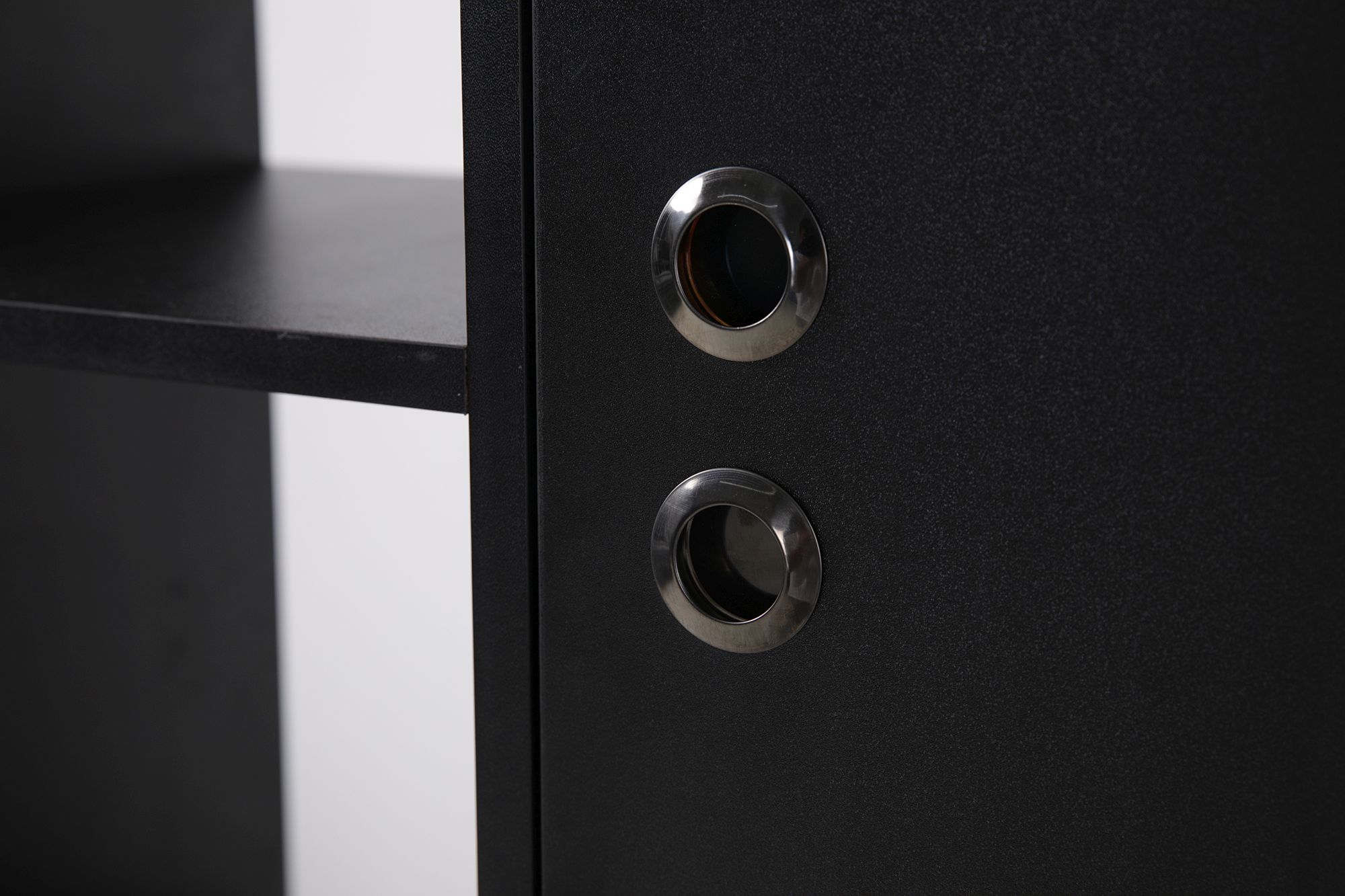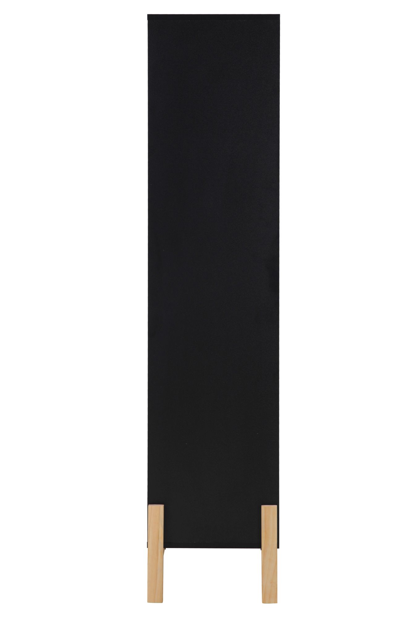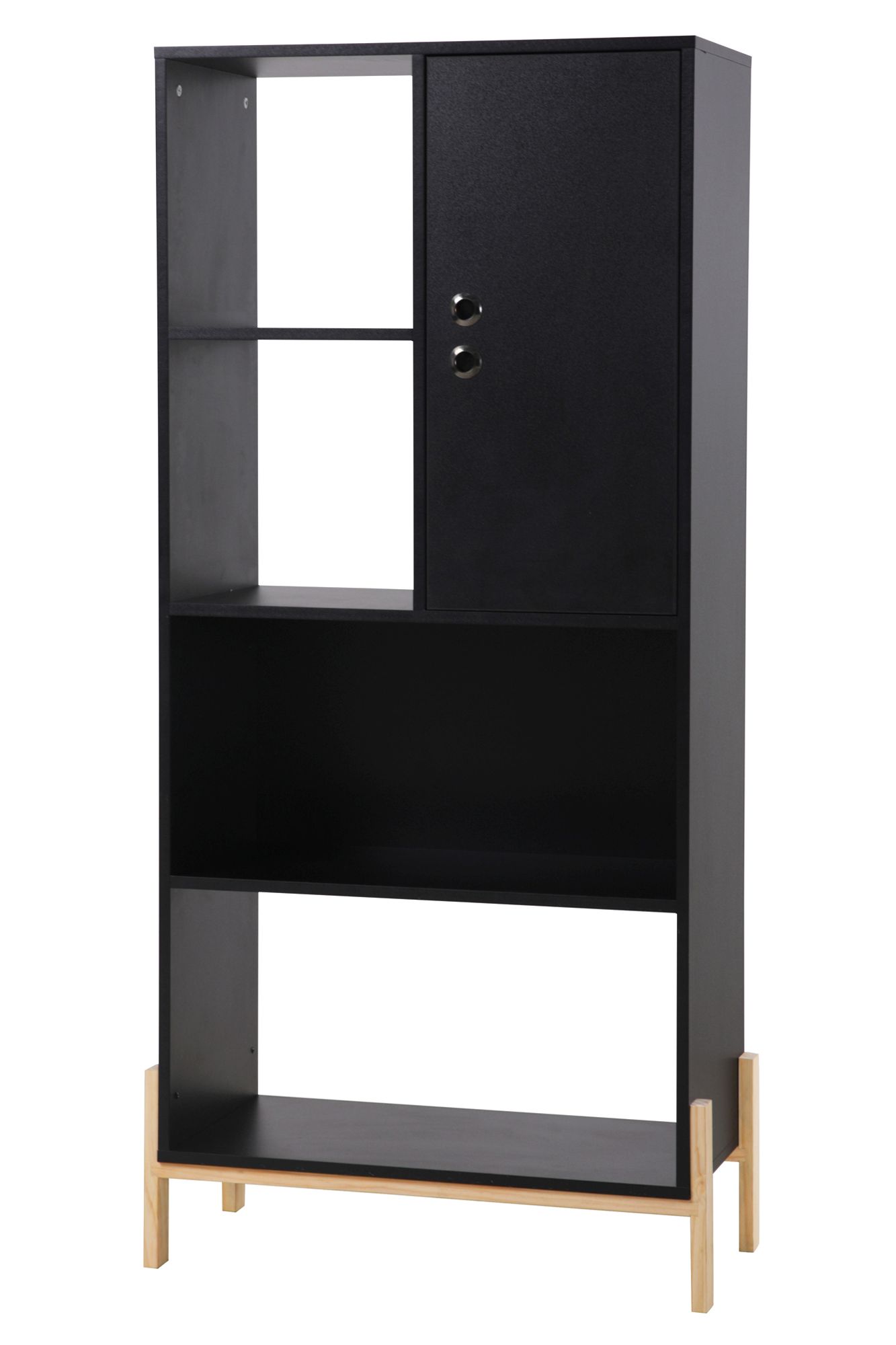 L'étagère noire aux pieds en pin clair disposant d'une répartition asymétrique attirera tous les regards. Trois des quatre casiers n'ont pas de fond ce qui confère à l'étagère beaucoup de légèreté. Elle comprend également un casier derrière la porte pour les objets que vous souhaitez protéger des regards.